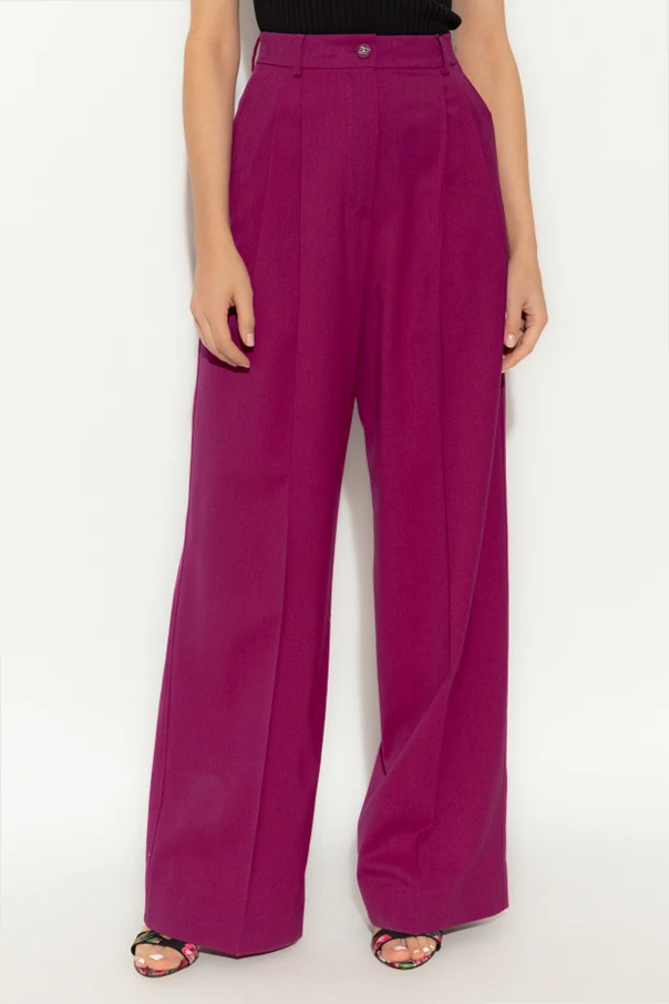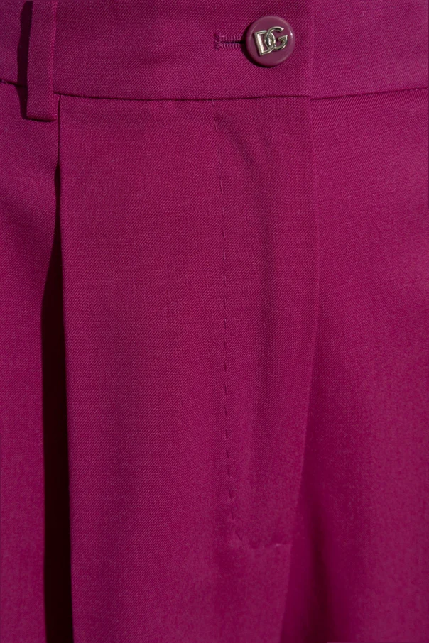 Introducing the Woolen Pleated Trousers by the illustrious Dolce & Gabbana, an epitome of sartorial elegance and modern sophistication. These purple formal trousers captivate with their high-waisted design and wide-leg silhouette, exuding a timeless yet contemporary charm. Crafted from a luxurious wool blend, these trousers offer unparalleled comfort and an elegant drape. The pleated front and tailored fit enhance their formal appeal, while the designer's logo-adorned button closure adds a touch of exclusivity. The vibrant purple hue injects a bold statement into any formal ensemble. Why Purchase This Product? Designed by the renowned Dolce & Gabbana, an icon of Italian fashion. Features a high-waist and wide-leg cut for a flattering silhouette. Luxurious wool fabric ensures comfort and elegance. Exclusive logo detail on the button signifies premium quality. Intense purple color adds a modern twist to classic formal wear.