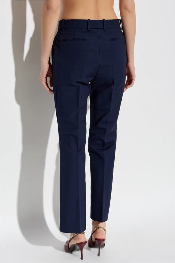 Introducing the Gucci Crease Trousers , a paradigm of sophistication from the exclusive collection by the illustrious creative director. These trousers, resplendent in a rich navy hue, exude timeless elegance, perfect for the modern connoisseur of fashion. Crafted from exquisite 100% cotton, the trousers boast a sleek, smooth texture, ensuring both durability and comfort. The straight-leg cut with a crease imparts a formal allure, making them an indispensable addition to any refined wardrobe. Distinguished by a golden button at the waist, they are replete with luxurious accents. Designed with belt loops and discreet back pockets, these trousers promise a flawless fit that accentuates the silhouette, as beautifully showcased by the model. Ideal for formal occasions, they seamlessly complement a blazer or an elegant blouse. Why Choose These Trousers? Crafted by the iconic Gucci brand. Exquisite 100% cotton for ultimate comfort. Distinctive golden button adds a touch of luxury. Perfectly tailored for a sophisticated fit. Versatile for both formal and chic casual ensembles.