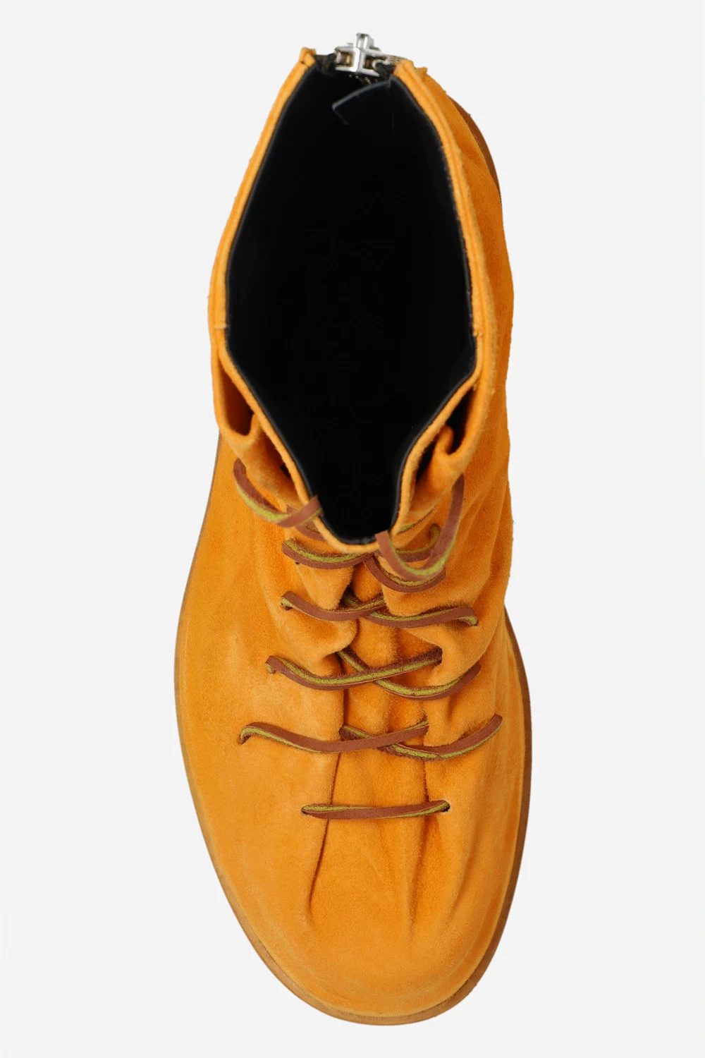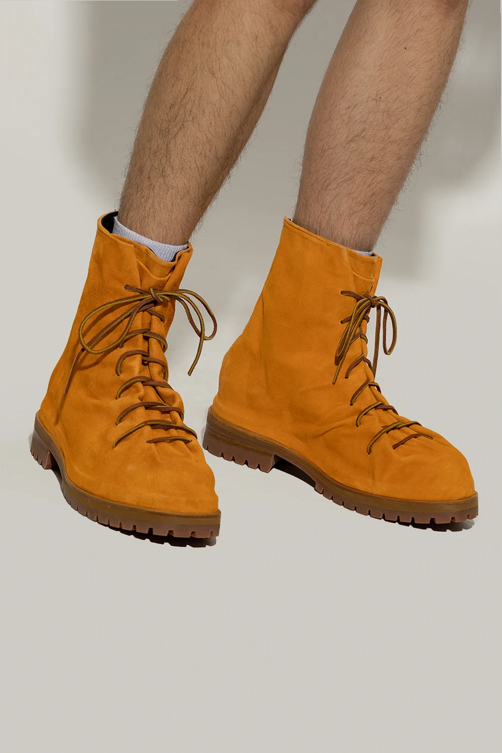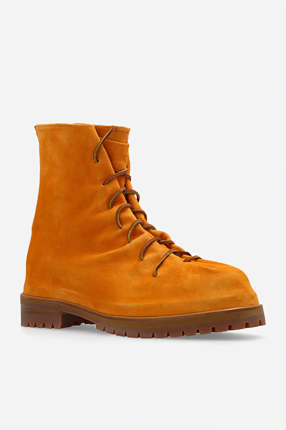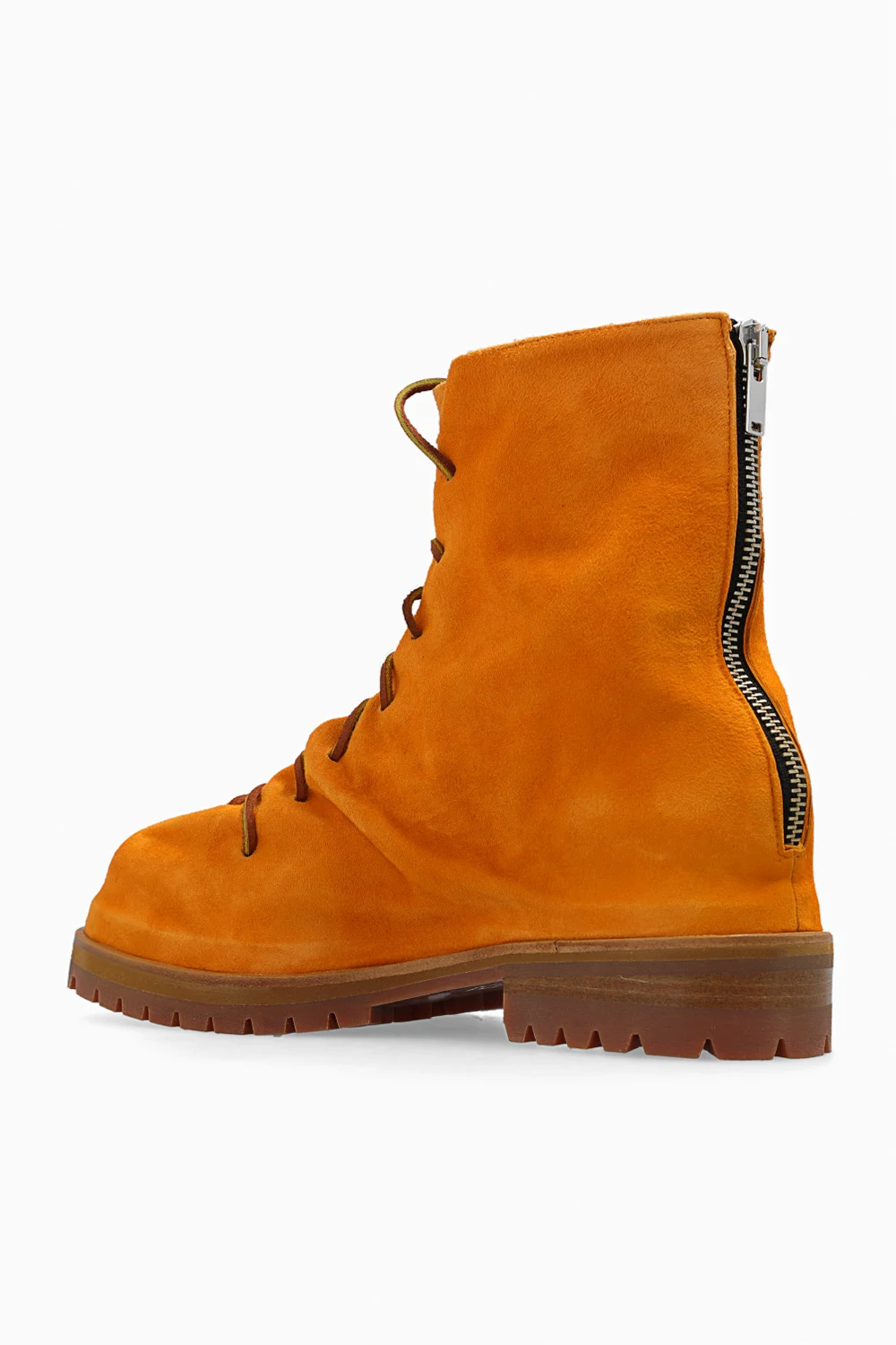 Orange boots from 424. Made of suede, this lace-up pair features a back zip, decorative pointed toe, vintage effect and beige rubber sole.