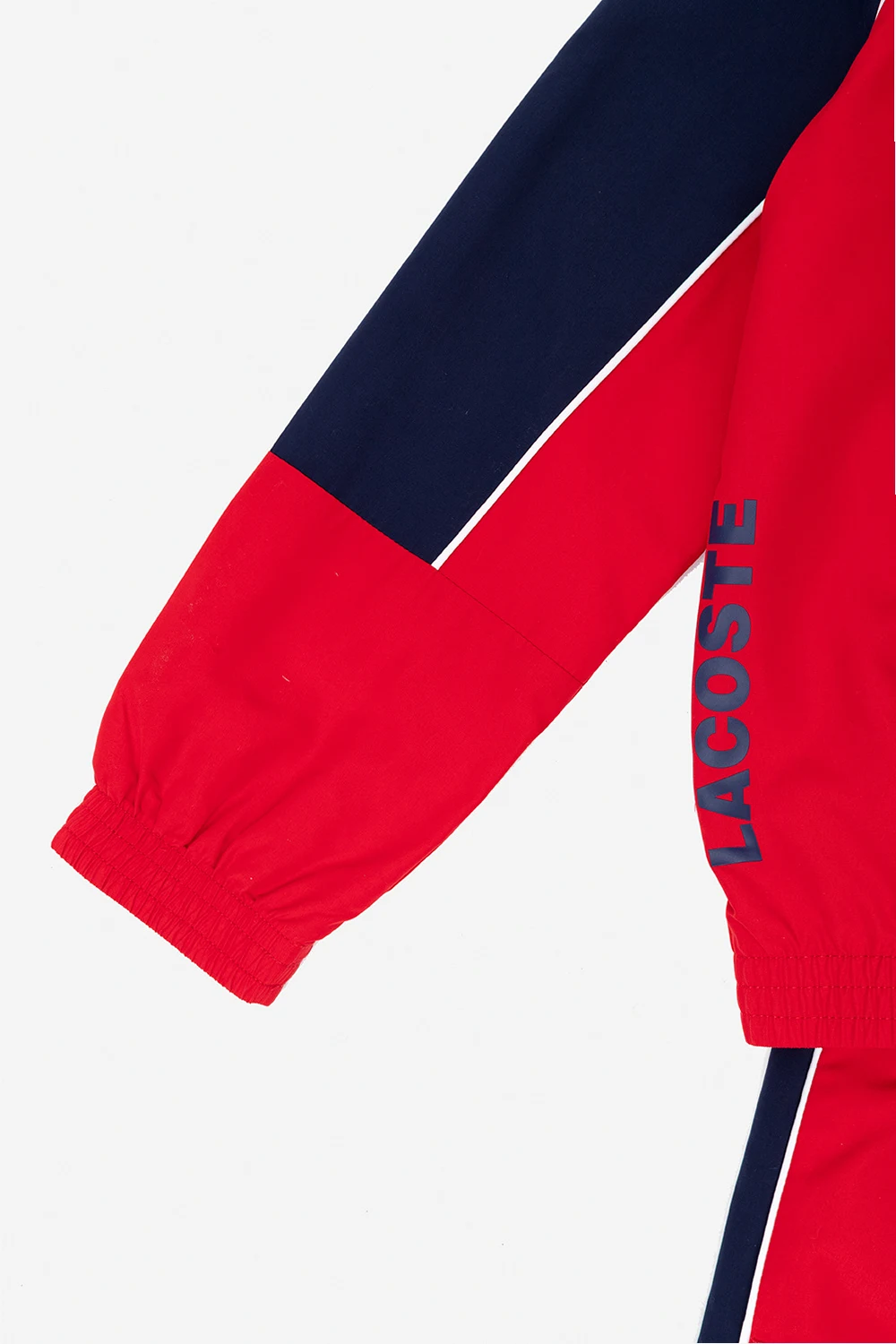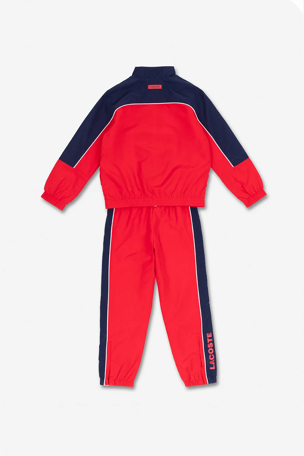 Red and navy blue sweatsuit from Lacoste Kids. Crafted from recycled material, both items showcase the brand's logo and a signature crocodile patch. Sweatshirt features a standing collar, a zip fastening, two slip pockets, long sleeves and elasticized trims while sweatpants have a drawstring waistband, two slip pockets and elasticized cuffs.