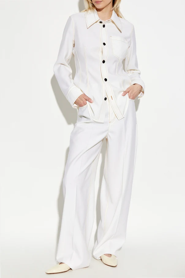 Introducing the exquisite Wełniane Pants by the illustrious designer Bottega Veneta . Exuding a sophisticated aura, these trousers are the epitome of elegance and refined style. Crafted from the finest wool , they are an impeccable addition to any discerning wardrobe. Draped in a dominant white hue, these pants feature a relaxed fit with wide legs, perfect for a casual yet chic ensemble. The front showcases pockets with accentuated seams, enhancing their elegant appeal. The rear is adorned with decorative V-shaped stitching on the pockets, complemented by a distinctive brown woven-textured patch on the waistband. With classic button and zip closure, and contrasting decorative stitching, these trousers embody a casual yet elegant style, suitable for a myriad of occasions, effortlessly merging comfort with sophistication. Why choose this product? Meticulously crafted from premium wool for unparalleled quality. Universal style: blends casual comfort with elegant aesthetics. Unique detailing with decorative V-shaped stitching. Iconic design by the visionary brand Bottega Veneta.