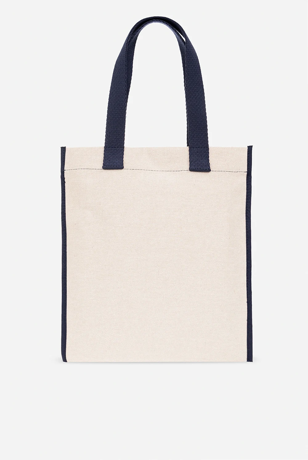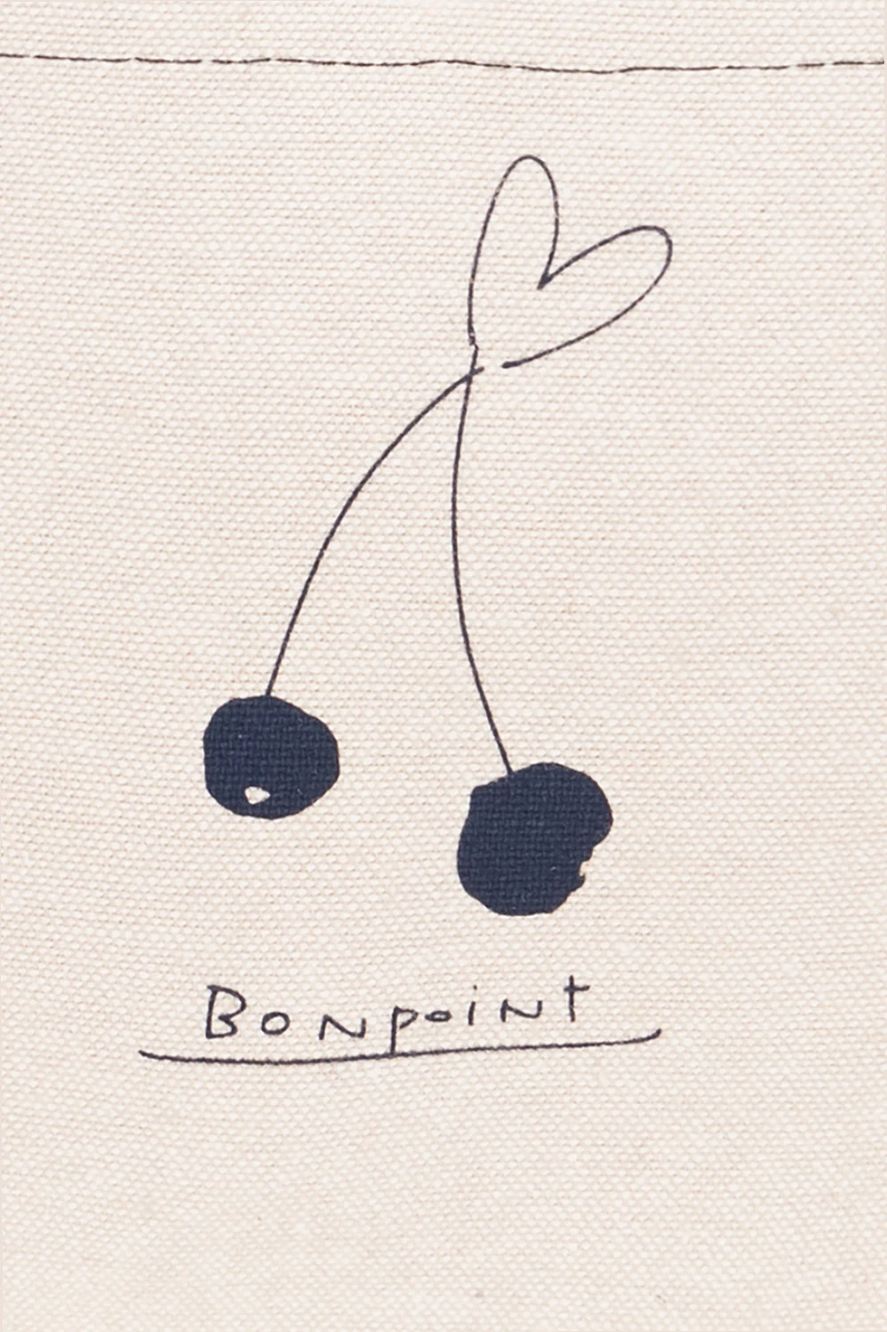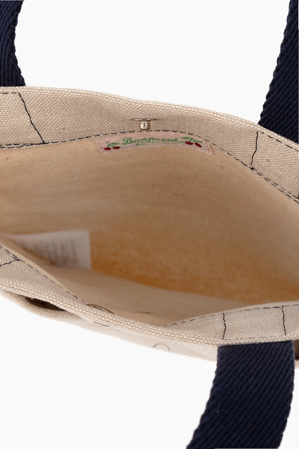 Cream and navy blue bag from Bonpoint. Made of canvas, this design features a snap fastening, a snap-fastened pocket accompanied by a printed logo on the front, two half-round handles and one internal compartment.