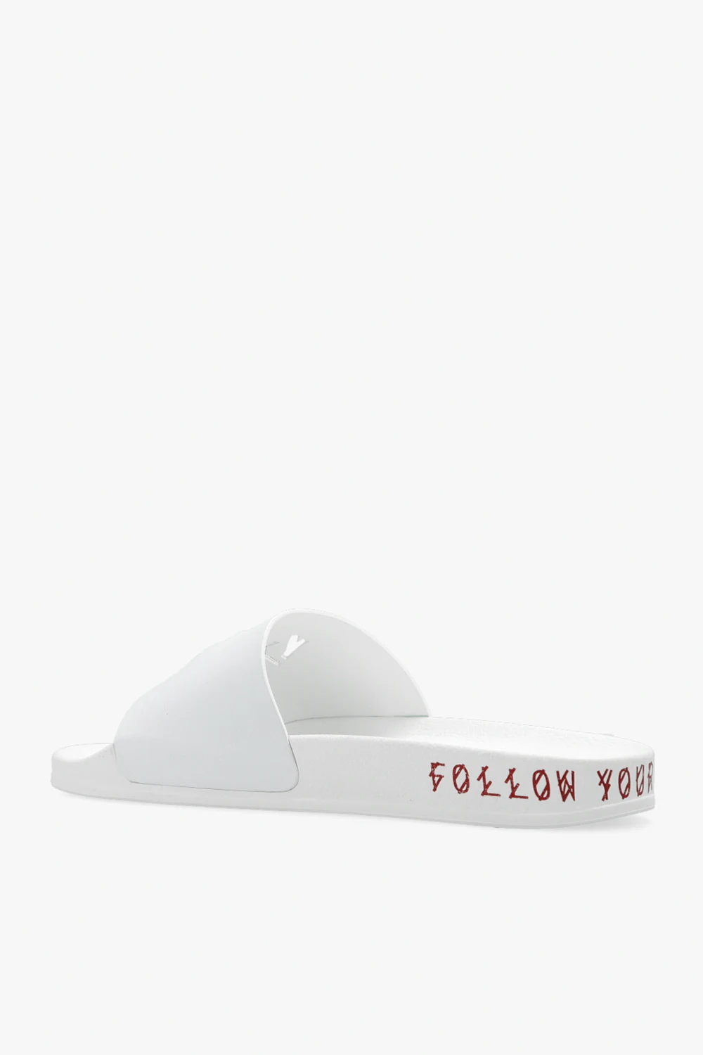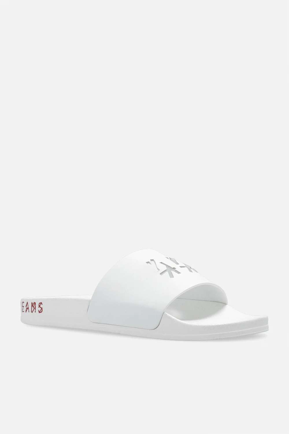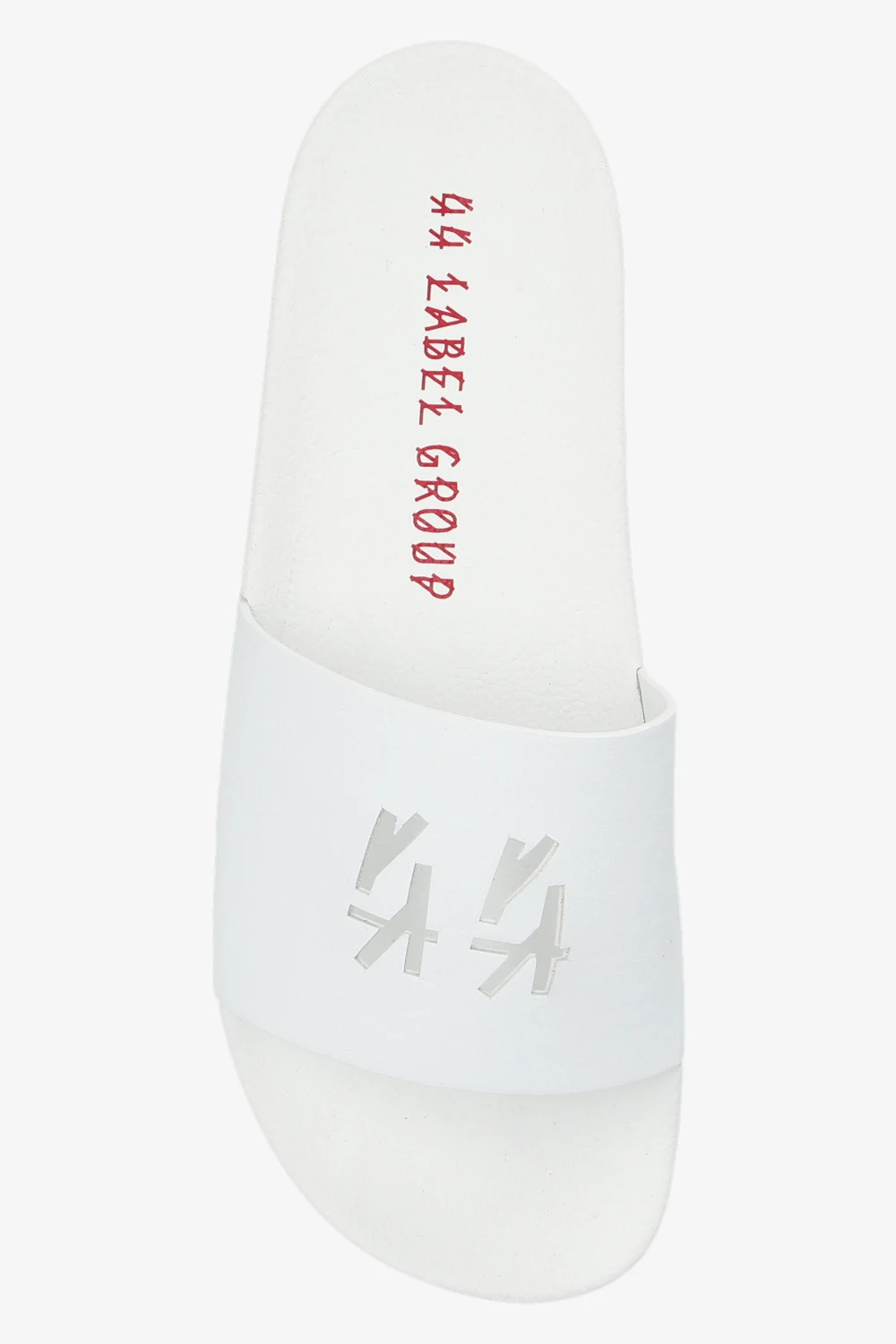 White slides from 44 Label Group. Crafted from faux leather, this model sits on a white rubber sole with red lettering at the back and showcases cutout logo detailing on the front.