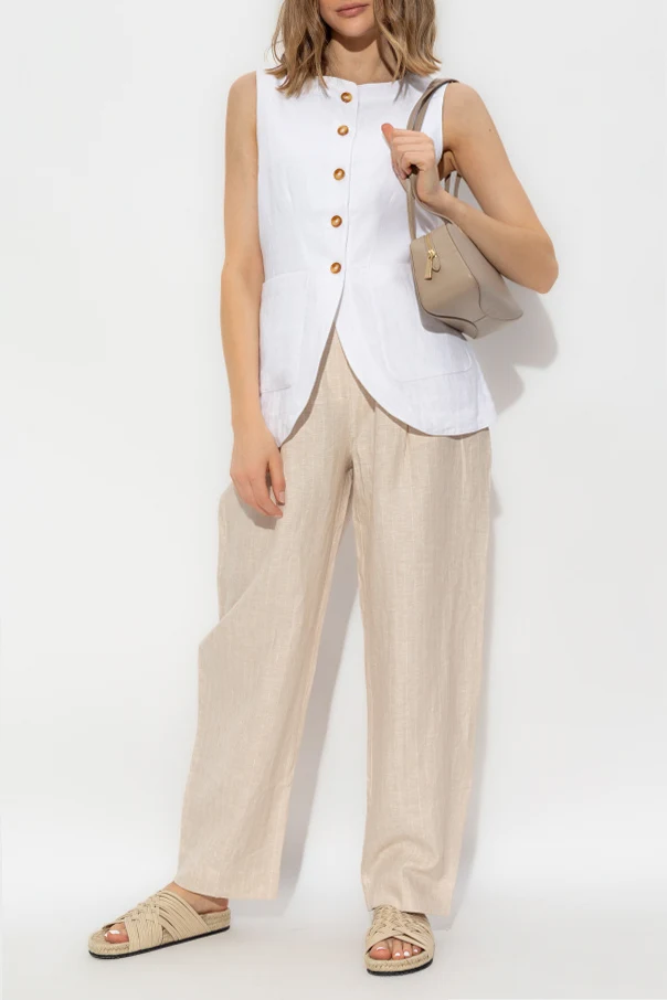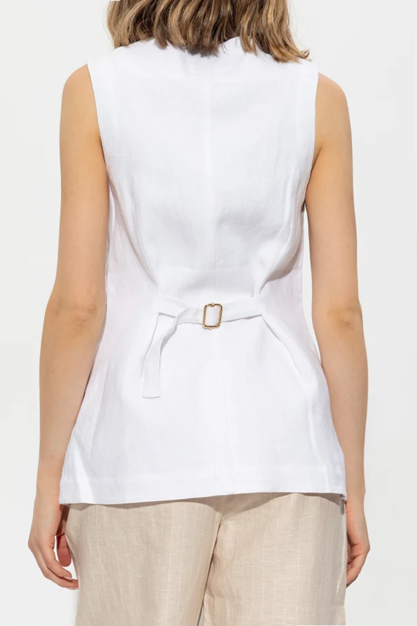 Introducing the 'Emma' Vest , a quintessential piece from the esteemed Australian brand, POSSE . This elegant black vest exudes sophistication with its classic, tailored fit that gracefully accentuates the silhouette. Crafted from premium linen, the fabric's texture speaks volumes of its superior quality.