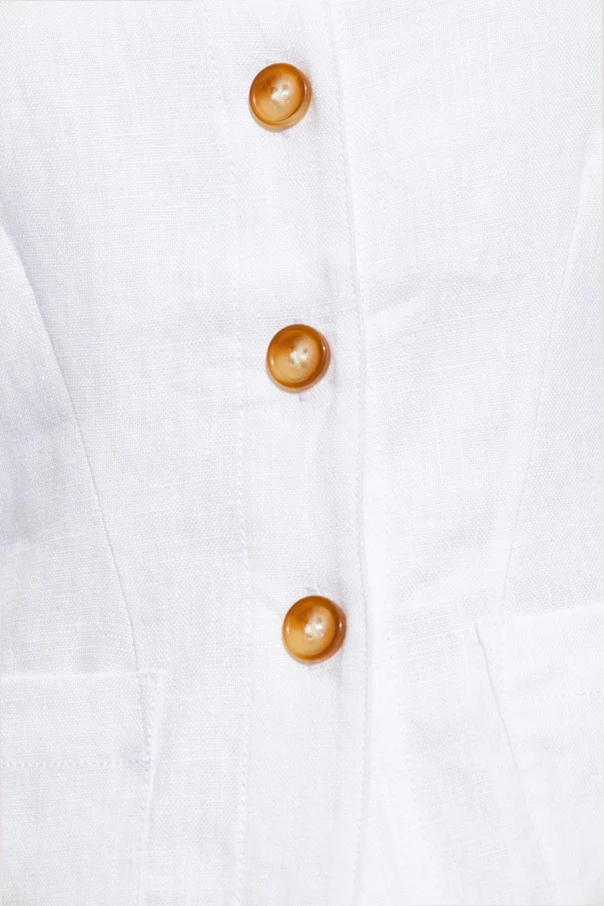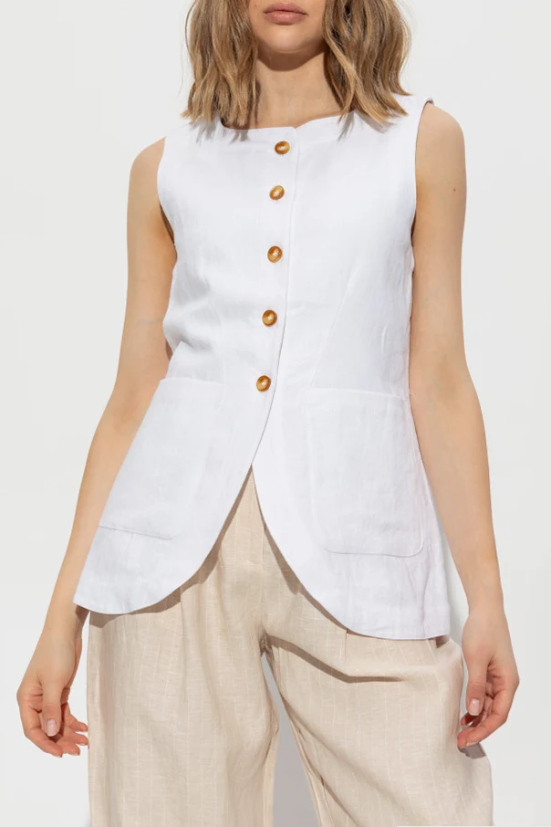 The vest features a refined sleeveless design, enhancing both elegance and modernity. Its hem is softly rounded, adding a touch of finesse. Prominent dark gold or brown buttons adorn the front, providing a striking contrast and a decorative allure. Practicality meets style with two spacious pockets positioned at the waist.