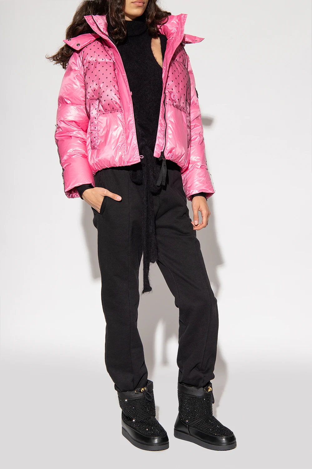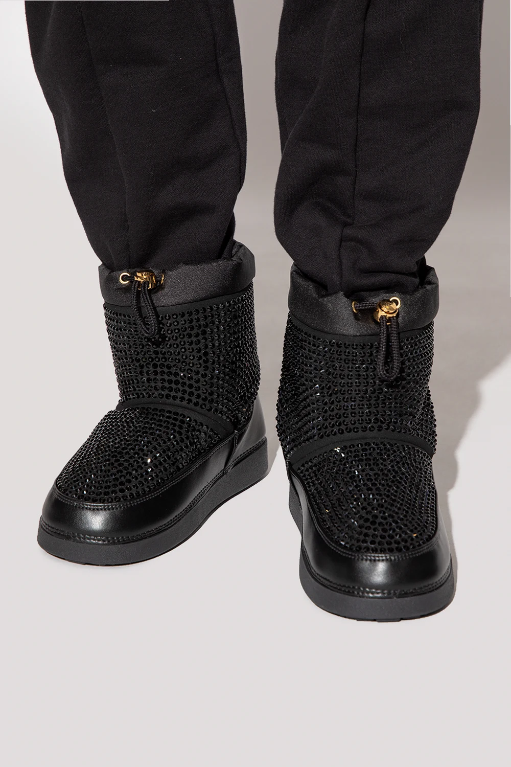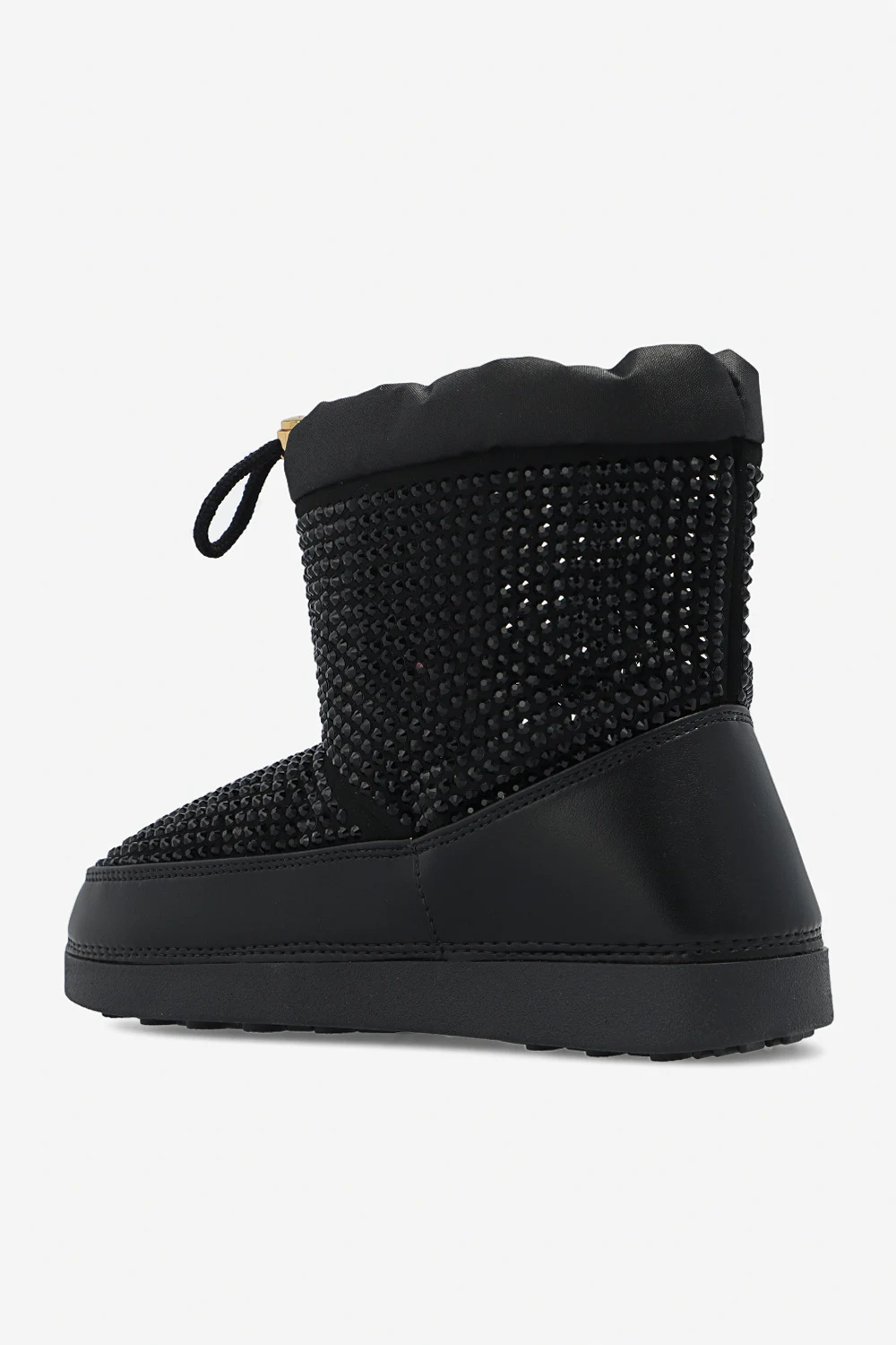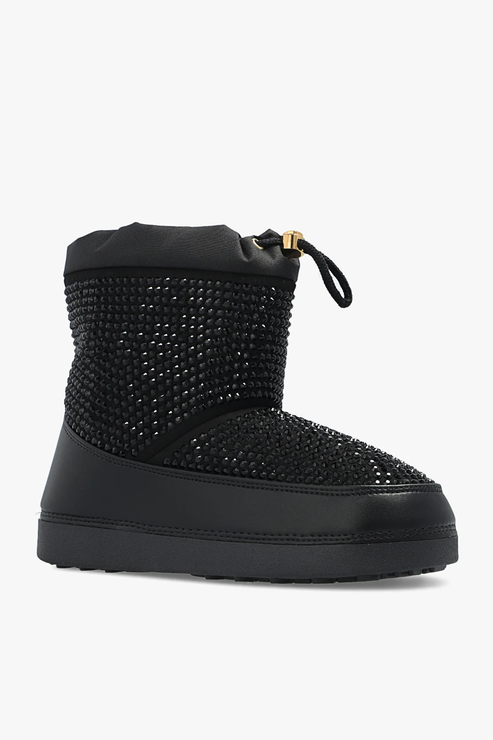 Black ‘GZ Aspen’ snow boots from Giuseppe Zanotti. Crafted from fabric embellished with crystals with leather trims, this pair features drawstring fastening and black rubber sole.