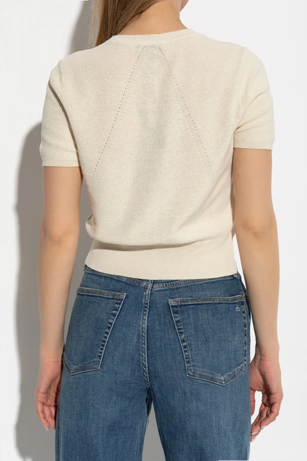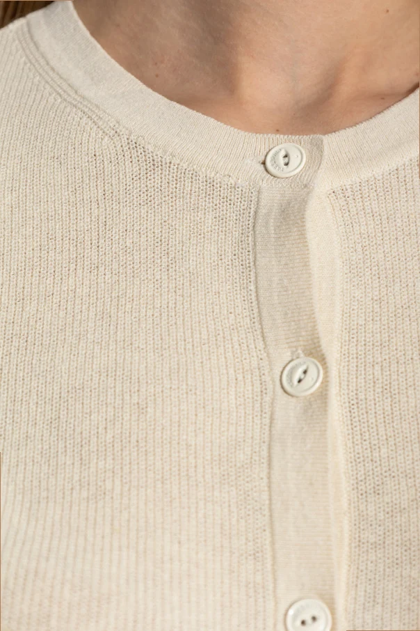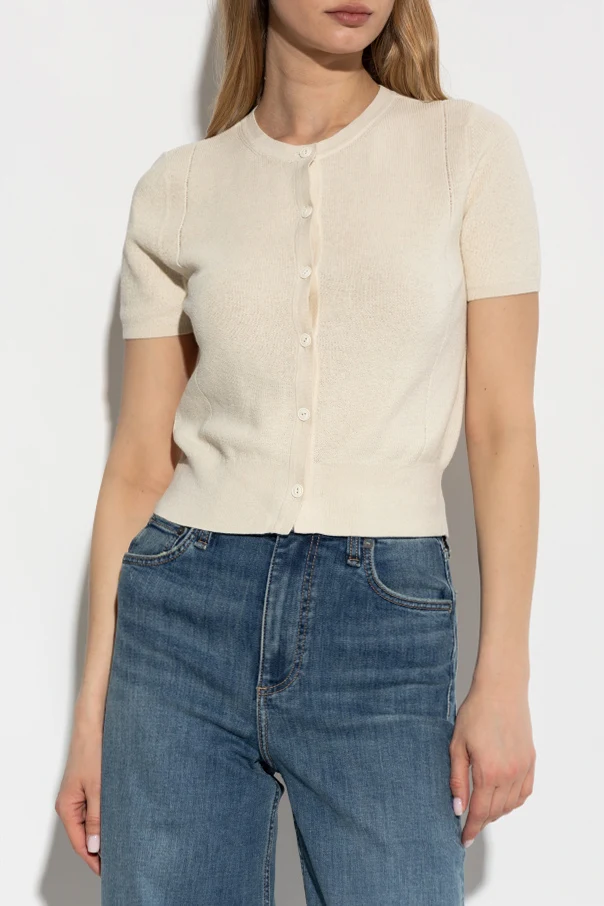 Introducing the Short Sleeve Cardigan by the illustrious Rag & Bone , a brand synonymous with the effortless elegance of the '90s. This cream-colored masterpiece, crafted from a sumptuous blend of cotton, linen, and nylon, exudes an air of sophistication and subtlety. The cardigan features a fitted silhouette with short sleeves and a waist-length cut , making it an exquisite addition to any wardrobe. The front is adorned with a row of buttons in a matching hue, accentuating its simple yet refined design. A round neckline and delicate knit texture complete its graceful appeal. Why Choose This Product? Exquisite blend of cotton, linen, and nylon for a luxurious feel. Versatile and elegant cream color. Fitted silhouette with a modern cut. Designed by renowned brand Rag & Bone. Perfect for both casual and sophisticated ensembles.