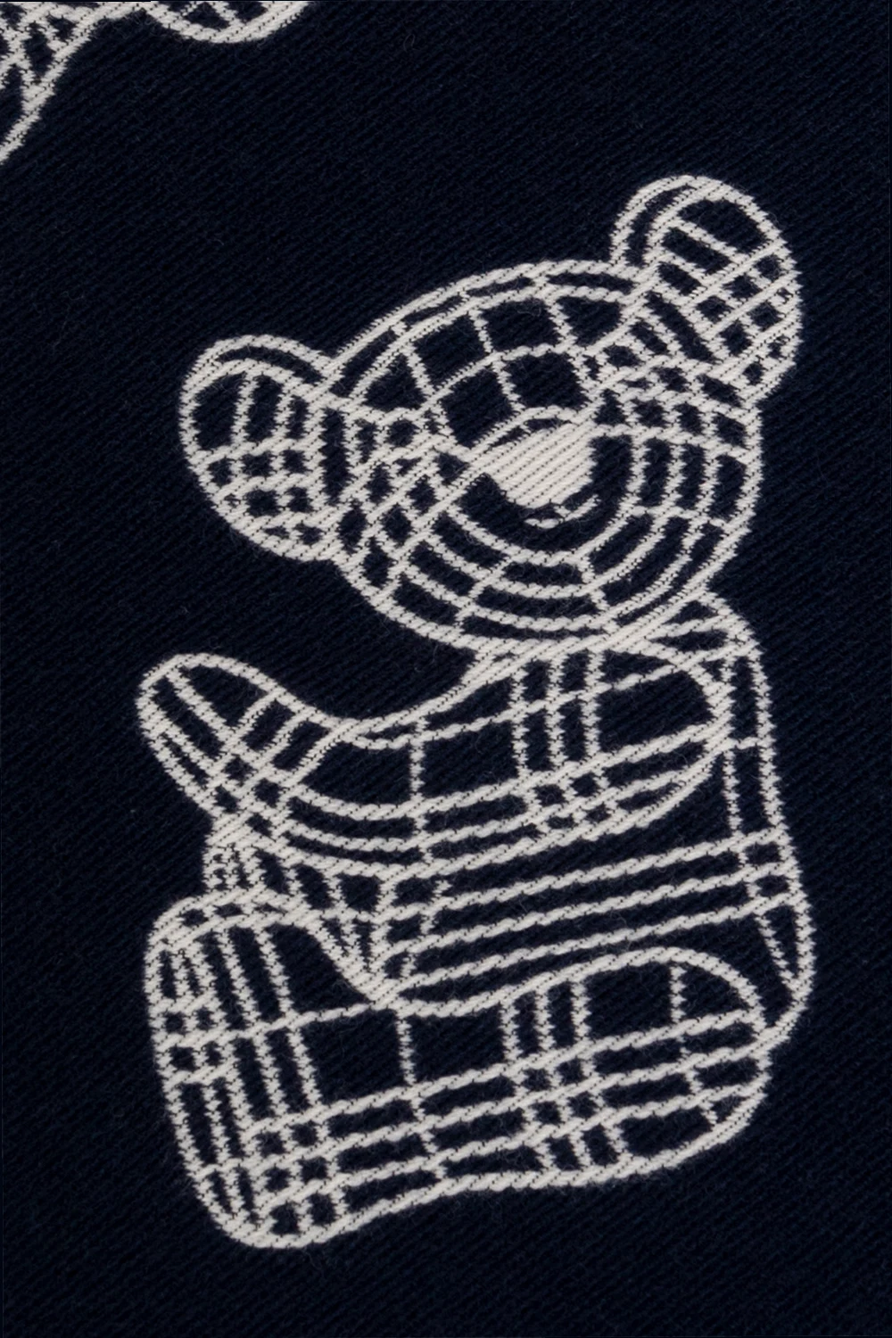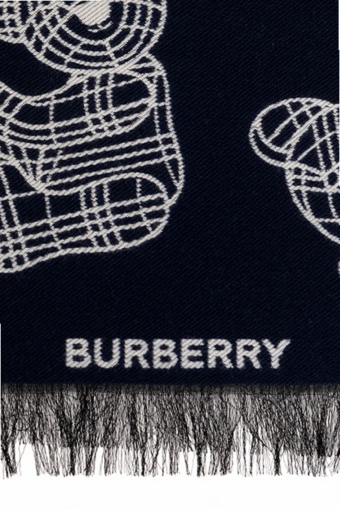 Navy and white ‘Thomas’ reversible scarf from Burberry Kids. This design is enriched by the label’s signature teddy bear motif, logo detail and raw cut edges.