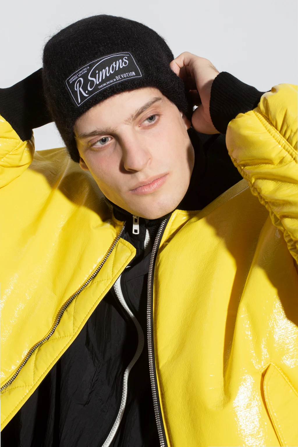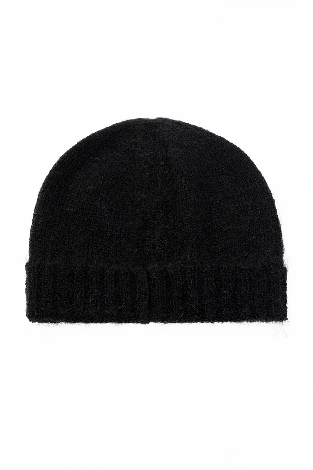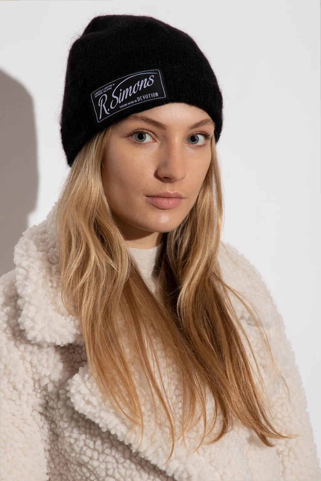 Black beanie from Raf Simons. Crafted from a mohair and wool blend, this item showcases a logo patch for brand recognition.