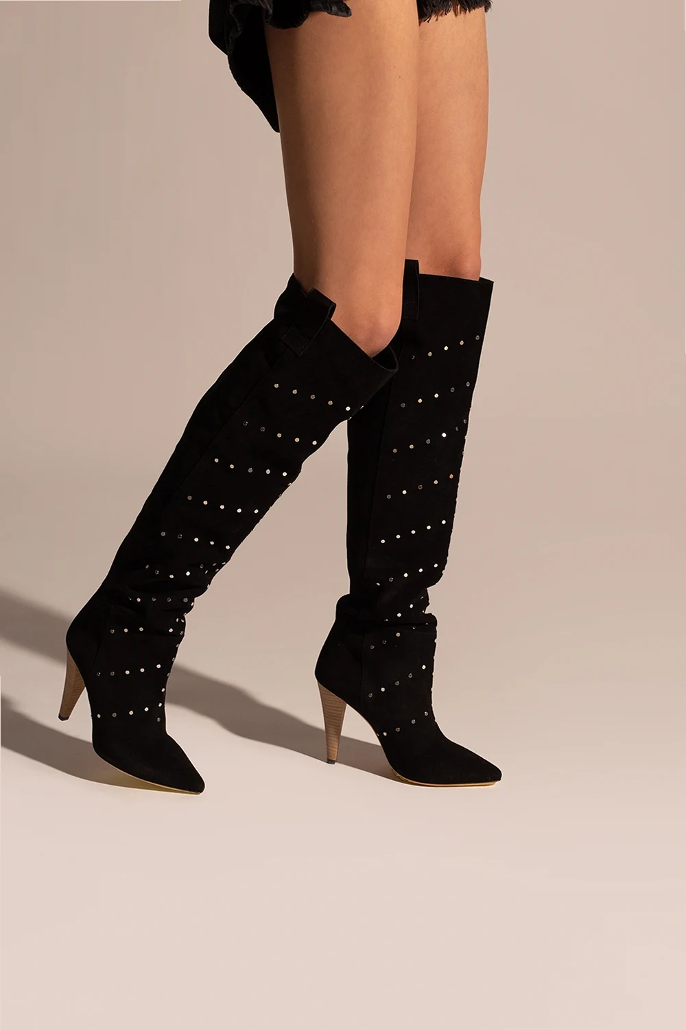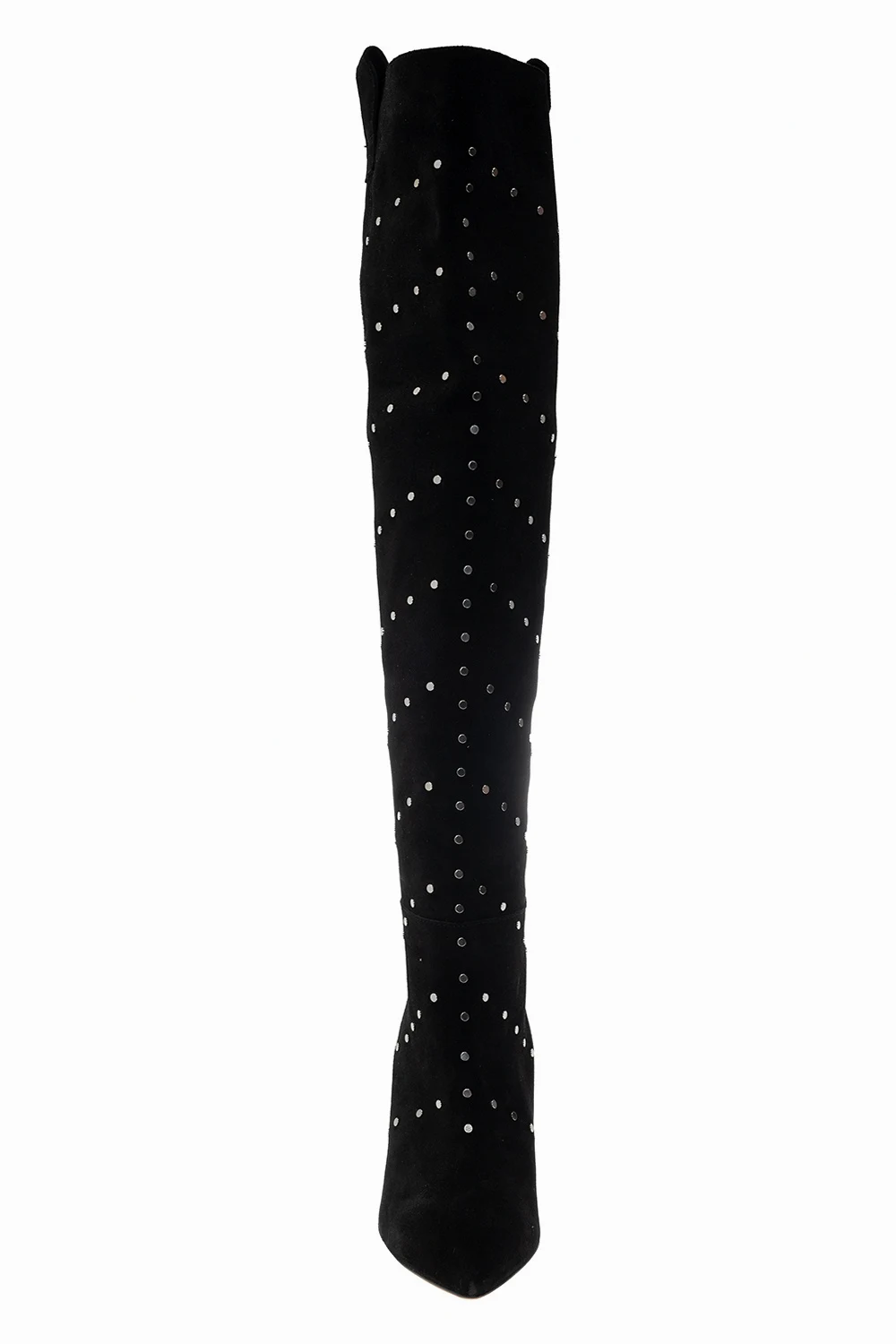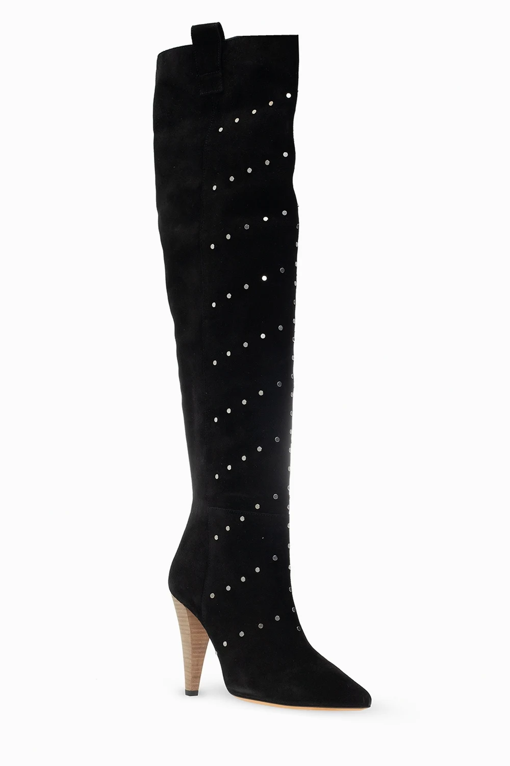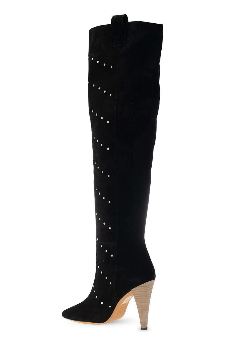 Black heeled slip-on boots from Iro. Made of suede, this design features silver-tone round elements and a brown suede sole.
