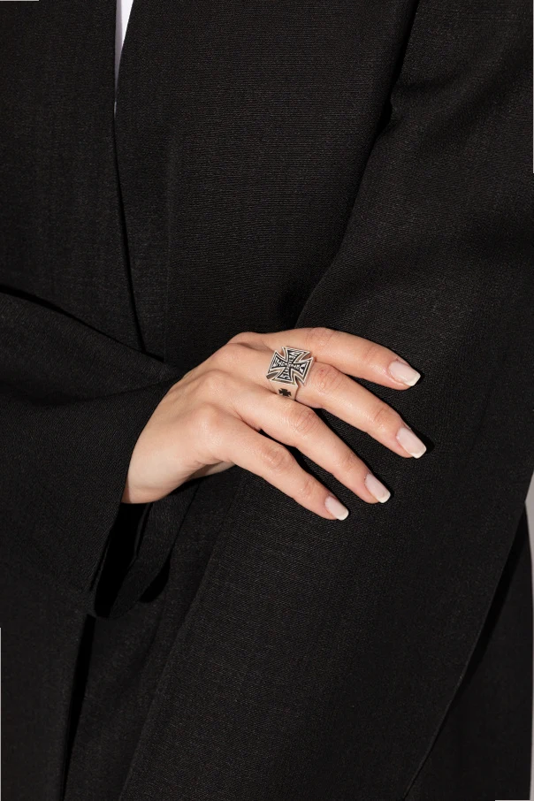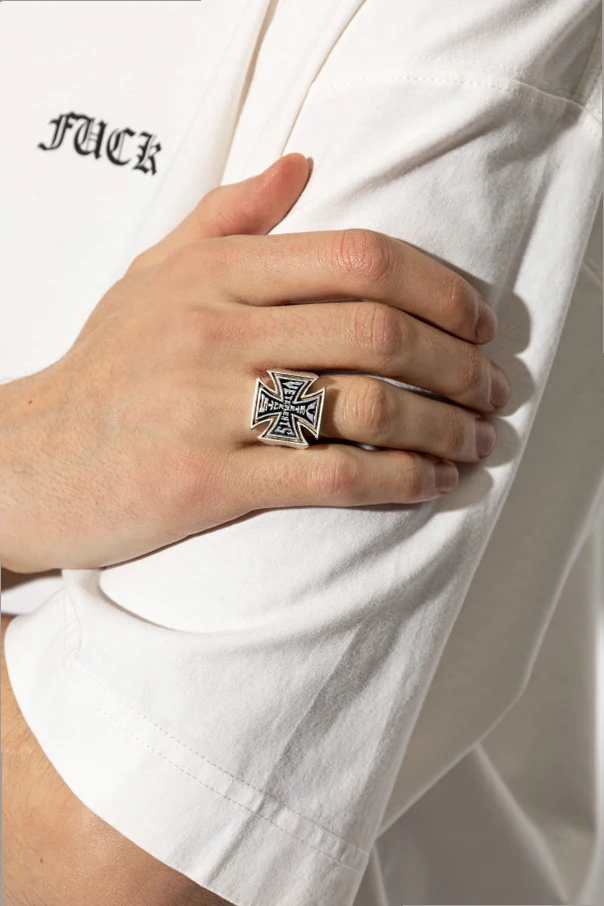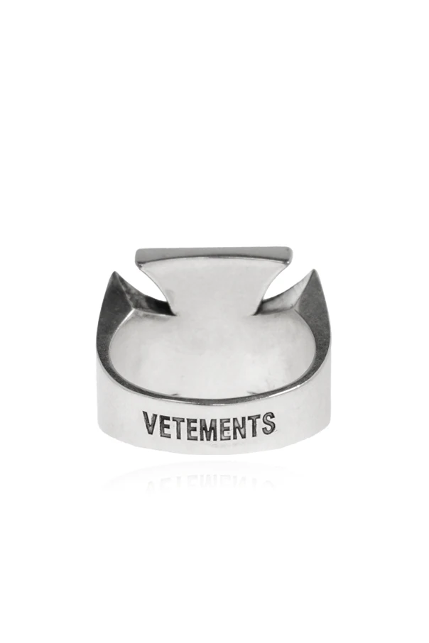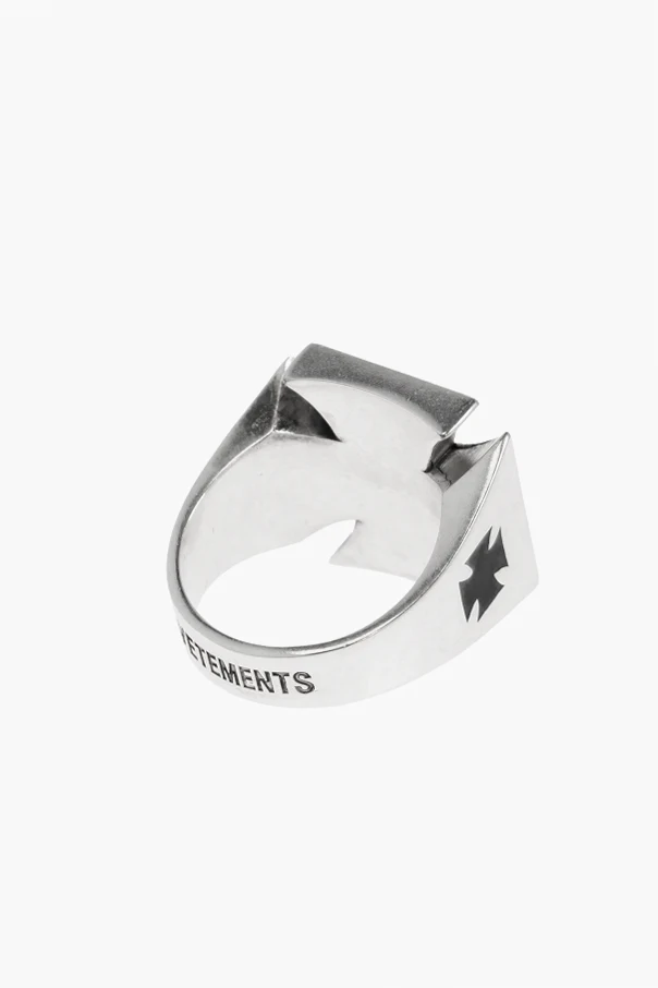 At the front, a raised Maltese cross with vivid black inlays creates a striking graphic statement, immediately capturing the gaze. The designer's name, VETEMENTS , is prominently inscribed across the cross’s arms and again subtly encircling the band’s reverse, lending a signature touch that asserts exclusivity.