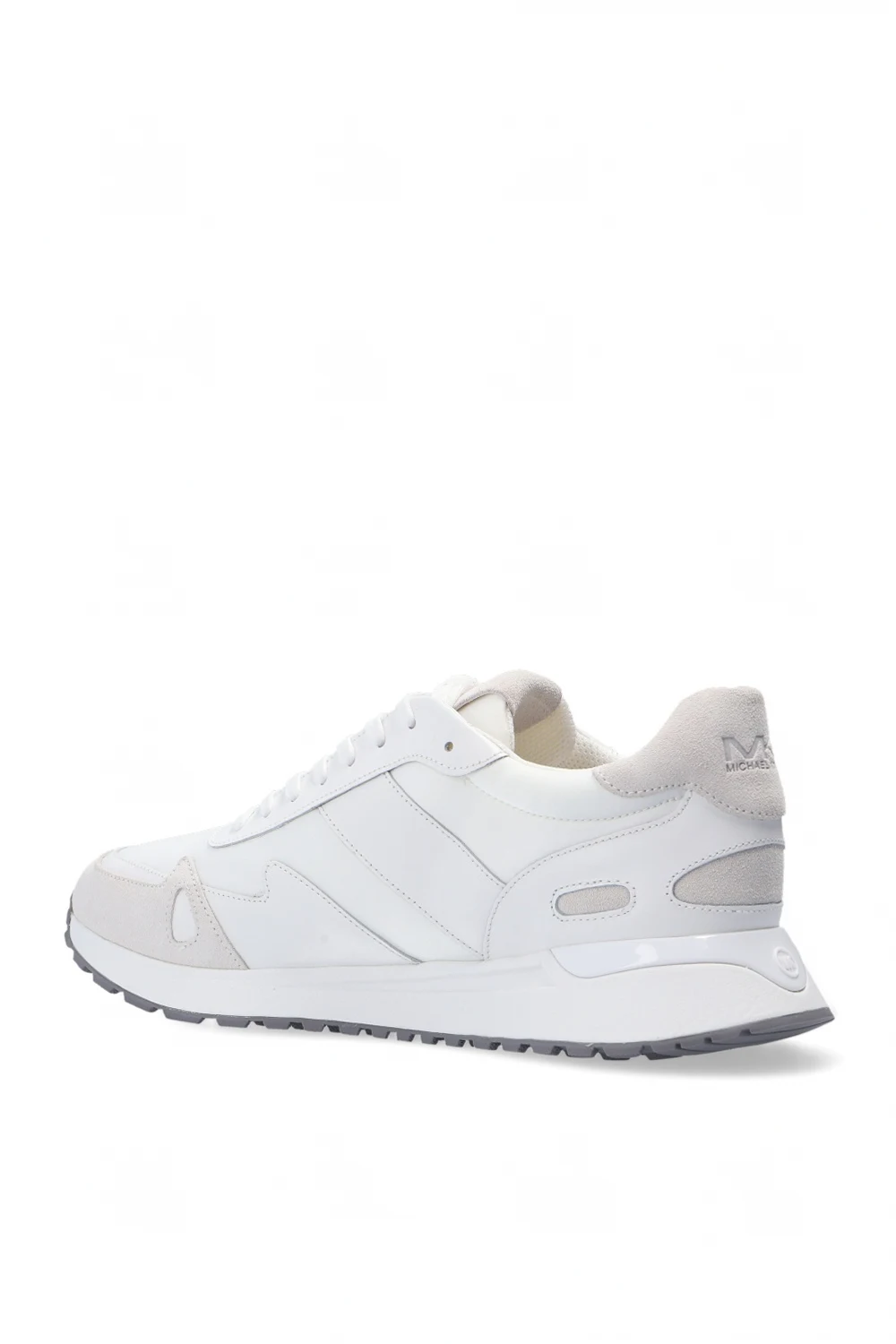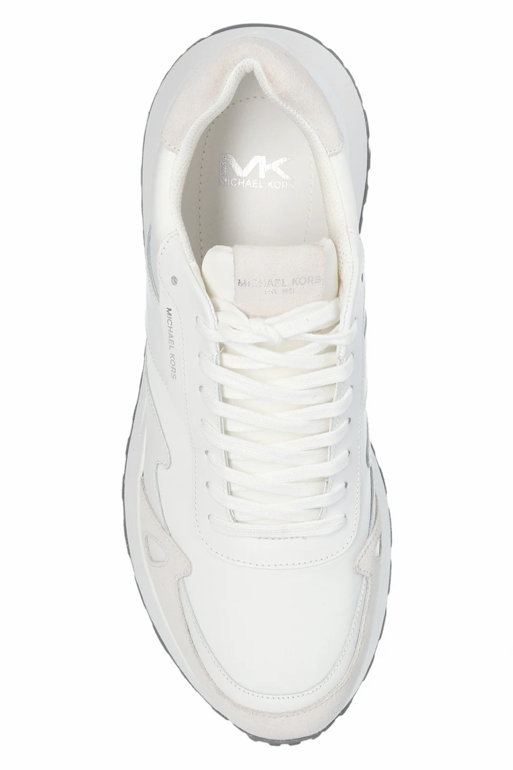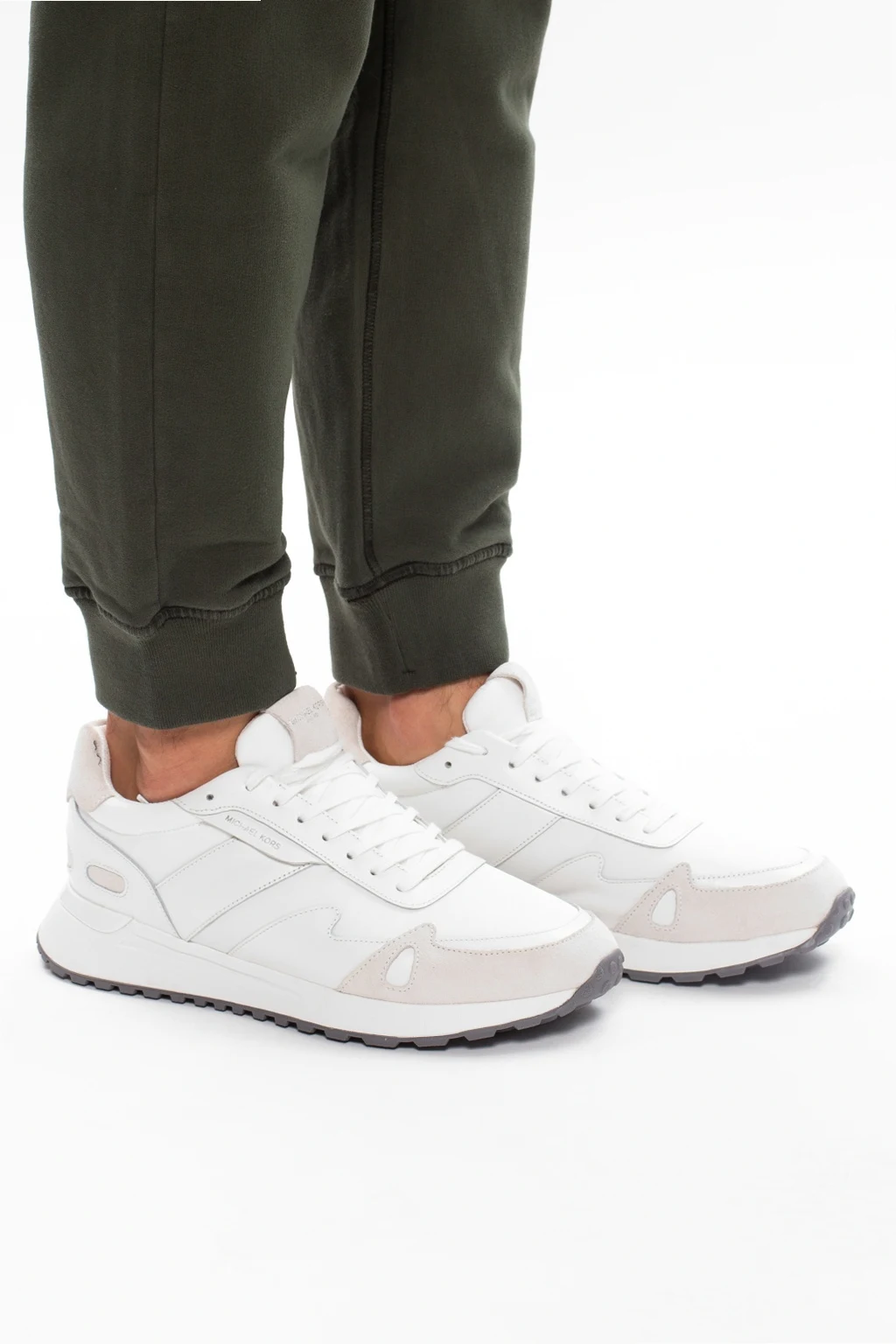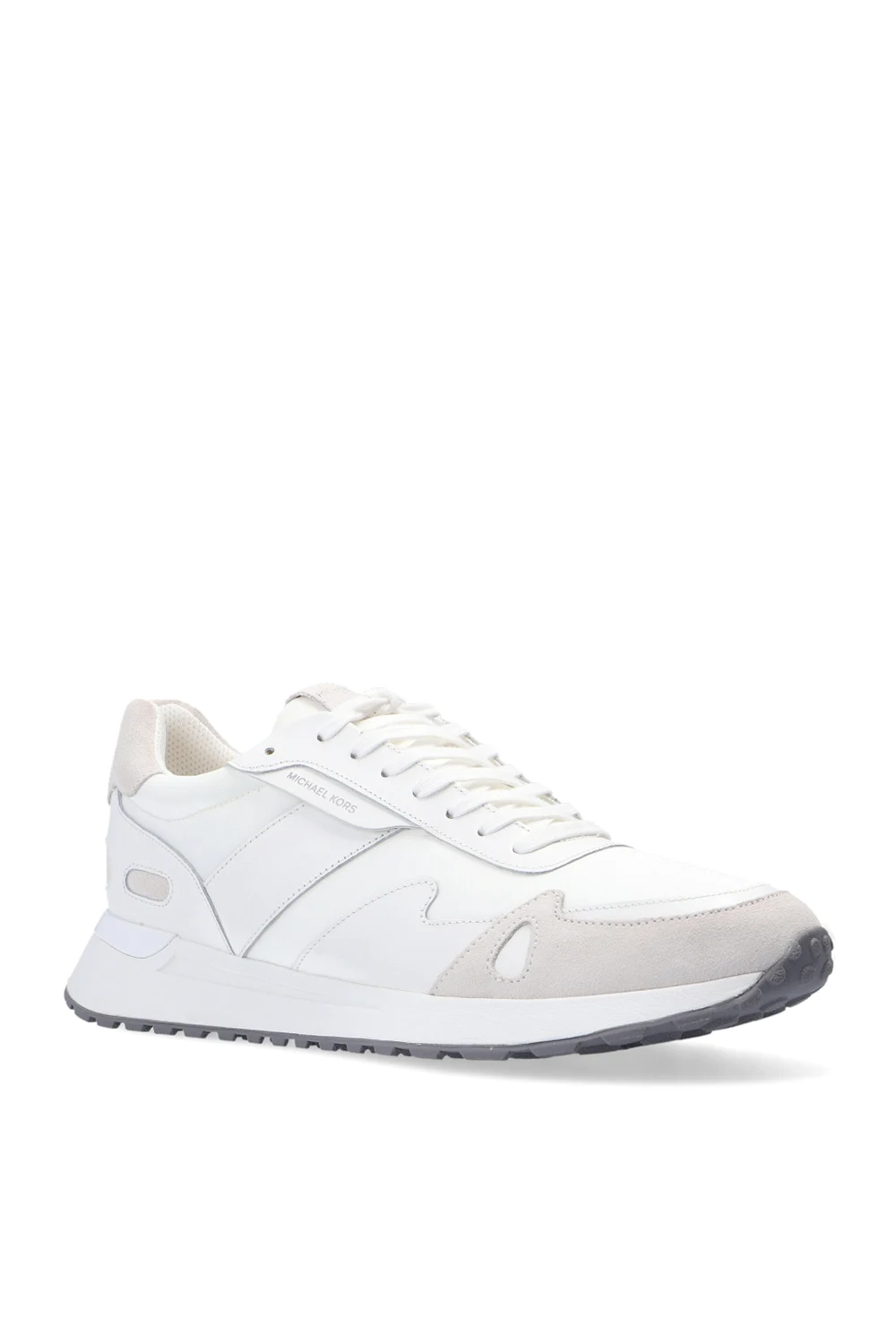 White ‘Miles’ sneakers from Michael Michael Kors. Resting on a grey rubber sole, this lace-up design is complete with grey velour inserts and a silver-tone logo detail.