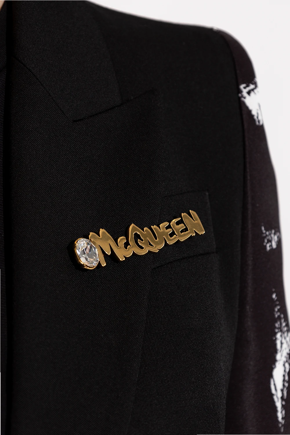 Broszka w kształcie logo w kolorze złotym Alexander McQueen. Wykonana z mosiądzu. Ozdobiona połyskującym kryształem.
