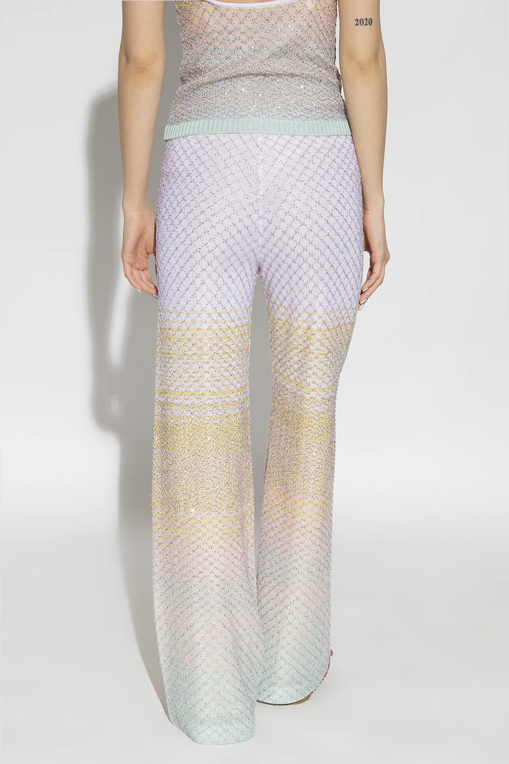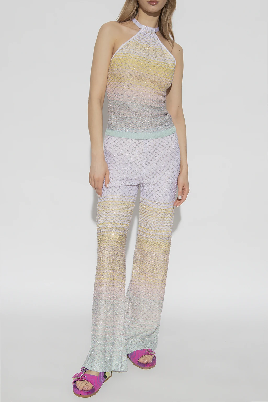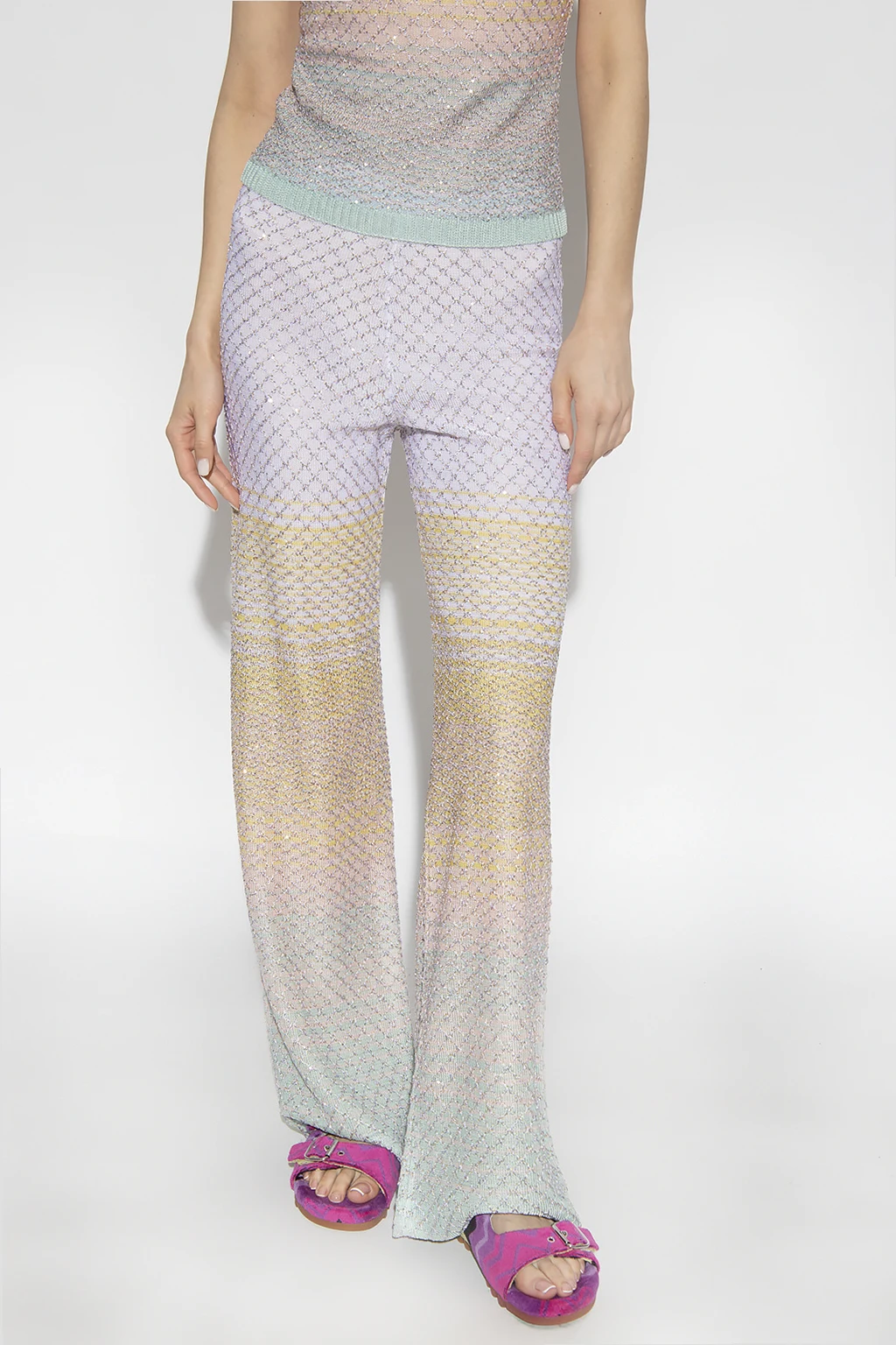 Kolorowe spodnie Missoni. Wykonane z dzianiny ozdobionej wzorem z pasy z gradientowymi przejściami. W talii wszyta guma. Dekoracyjny, wyszyty wzór wykończony lureksową nicią i połyskującymi cekinami. Długie nogawki o szerokim kroju.