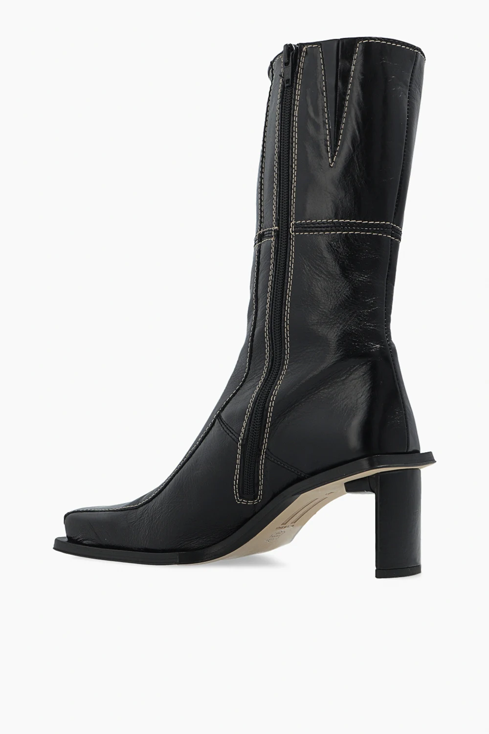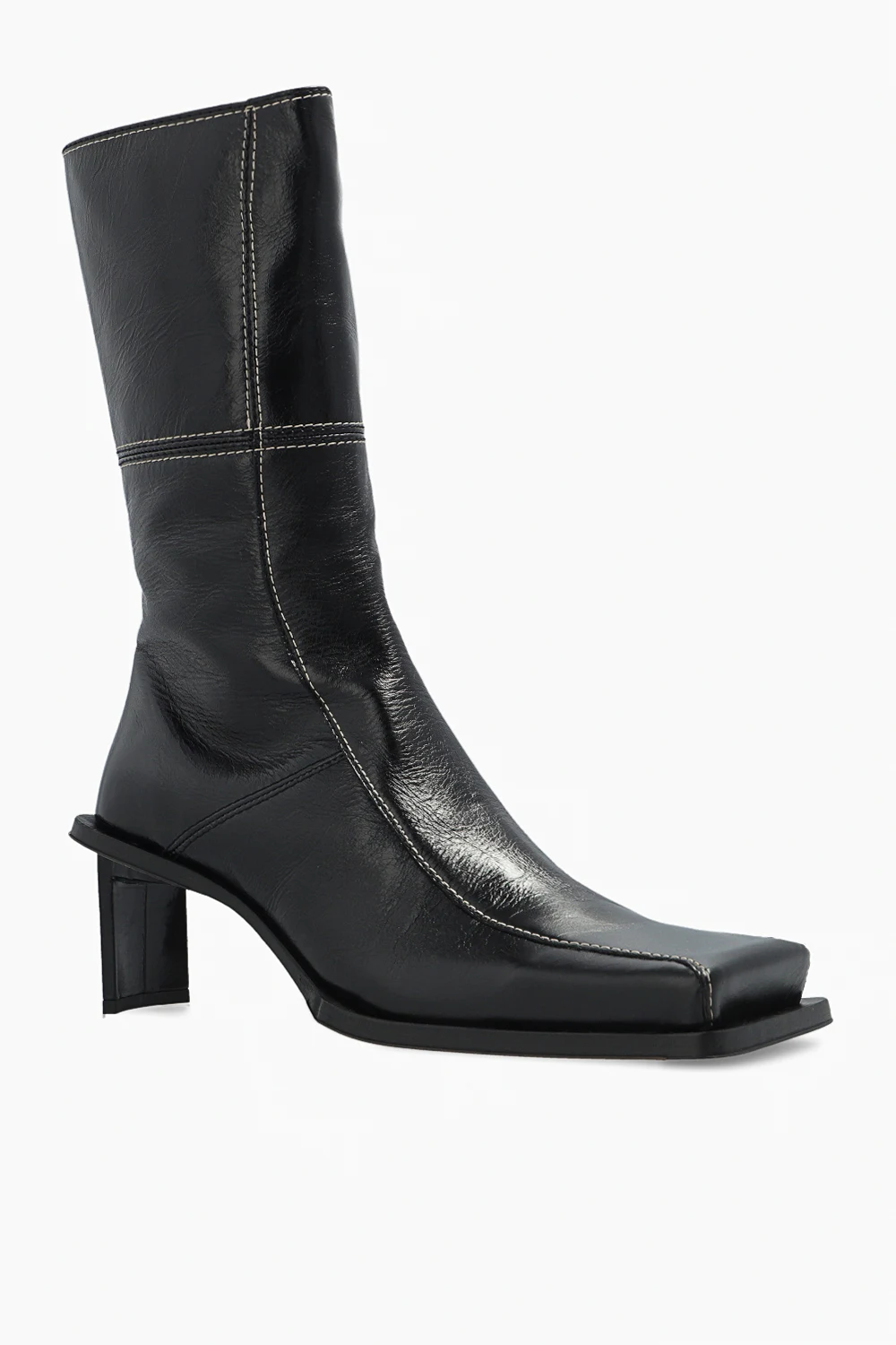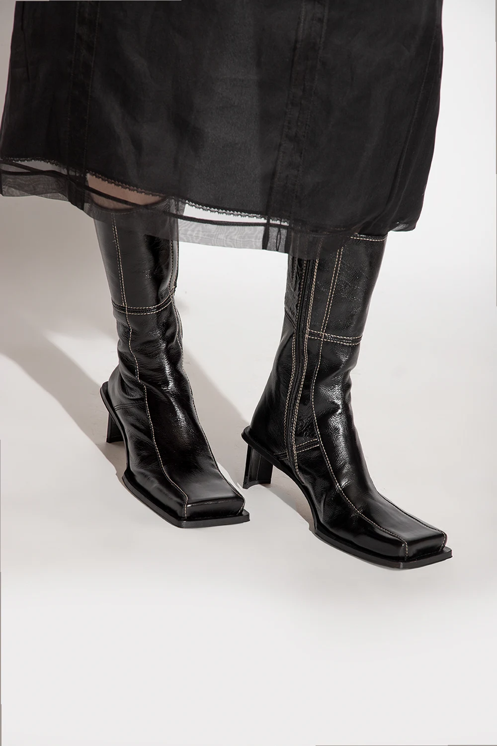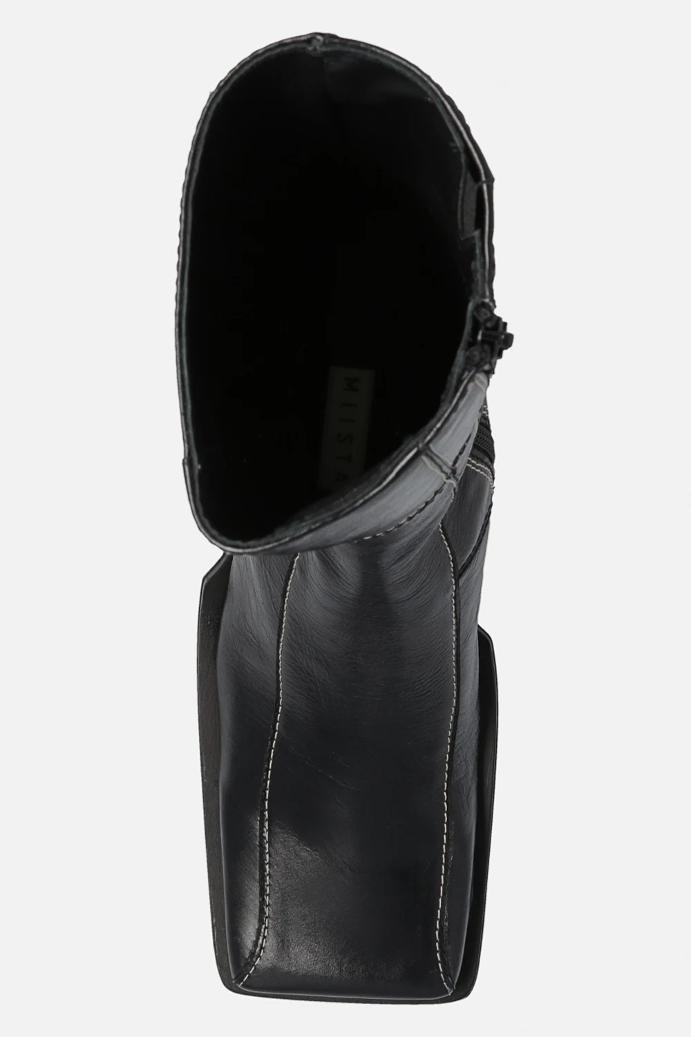 Czarne botki na obcasie, model ‘Amparo’ Miista. Wykonane z lakierowanej skóry. Z boku zapinane na zamek. Kremowe przeszycia. Kremowo-czarna podeszwa wykonana ze skóry i gumy.