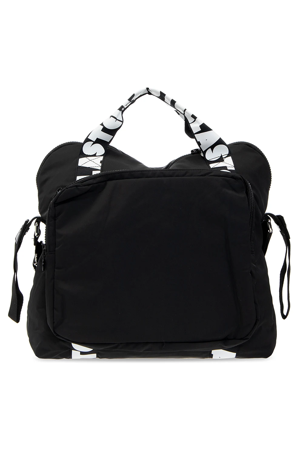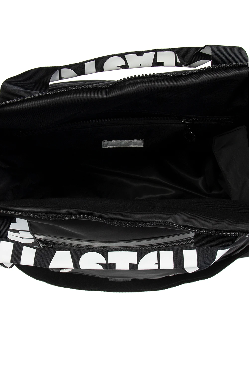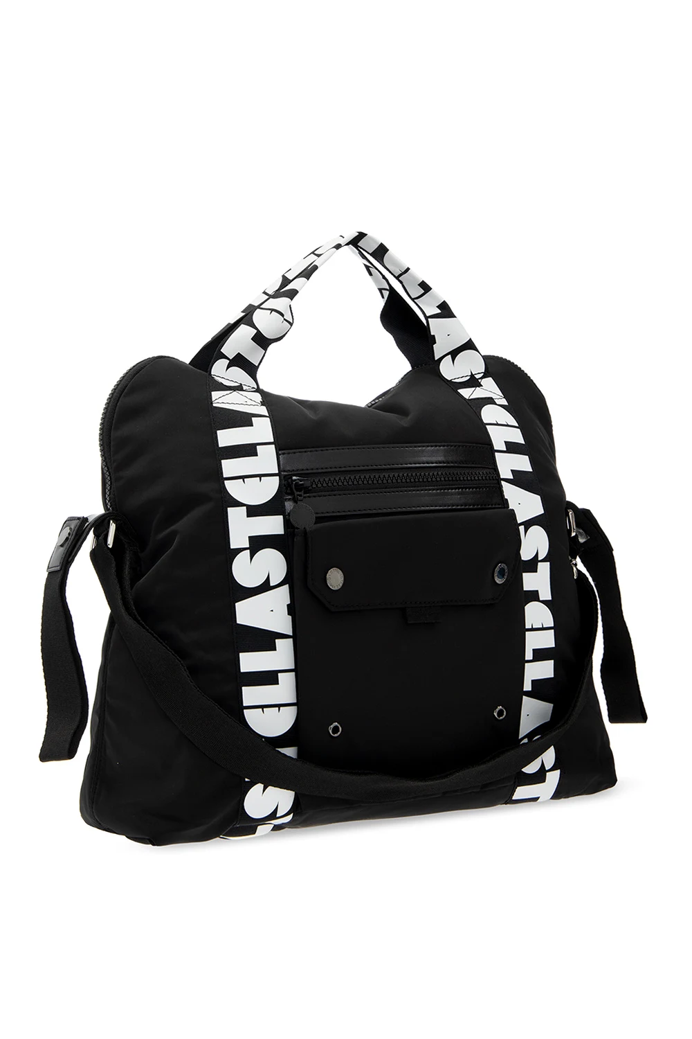 Czarna torba na ramię do przewijania Stella McCartney Kids. Wykonana z poliestru pochodzącego z recyklingu. Zamykana na dwubiegunowy zamek. Ozdobiona taśmami z białymi nadrukami. Trzy zamykane kieszenie: z przodu na zamek i na dwa magnetyczne zatrzaski, z tyłu na dwubiegunowy zamek. Dwie półokrągłe rączki oraz uchwyty umożliwiające zapięcie torby na wózek. Wewnątrz komora i trzy kieszenie. Dołączona mata do przewijania.