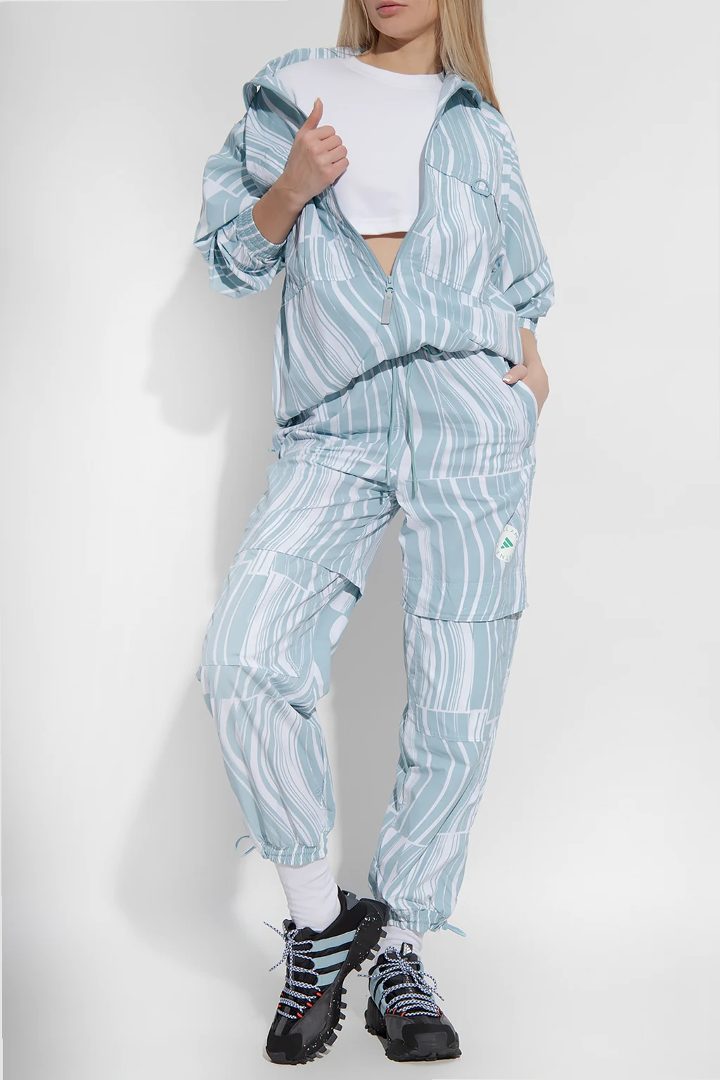 Jasnoniebiesko-biała, lekka kurtka ADIDAS by Stella McCartney. Wykonana z materiału pochodzącego z recyklingu. Zapinana na dwubiegunowy zamek z odblaskową zawieszką. Ozdobiona falistym wzorem. Dekolt wykończony wysoką stójką. Cztery kieszenie: dwie z patkami zapinanymi na rzep i dwie z zapięciem na zamek. Długie rękawy zakończone ściągaczem. Dół ściągany trokami.