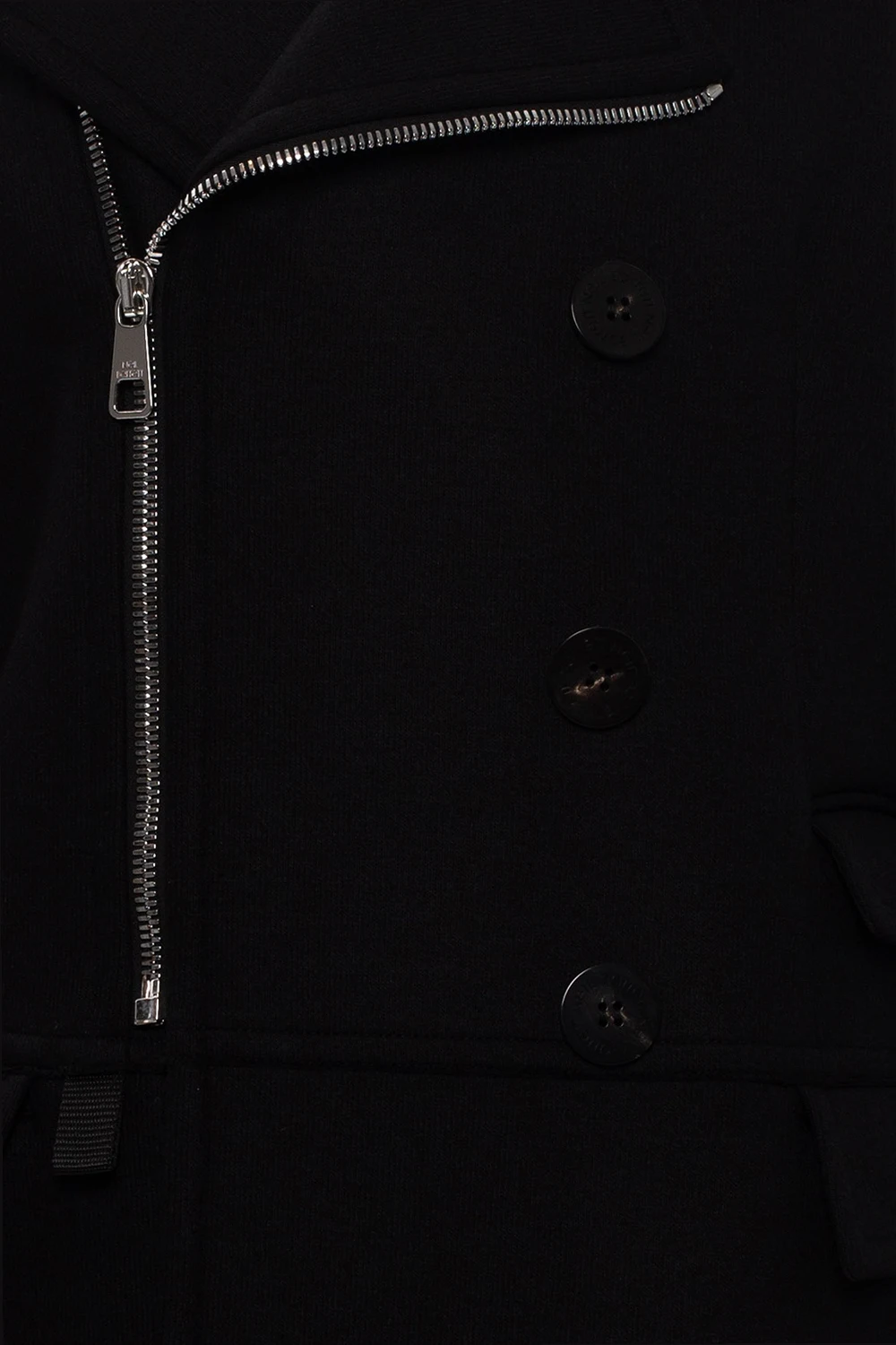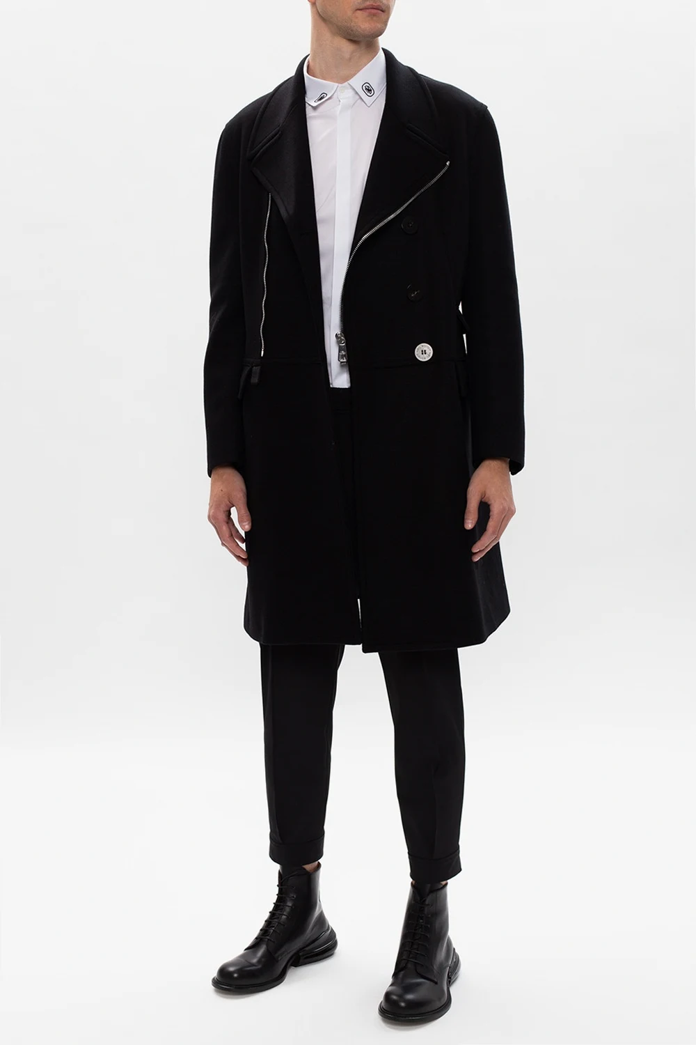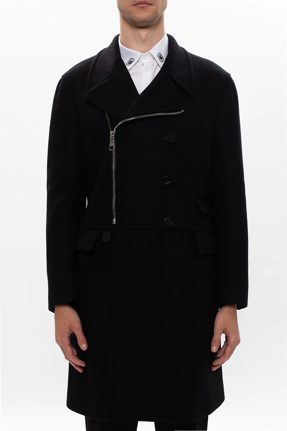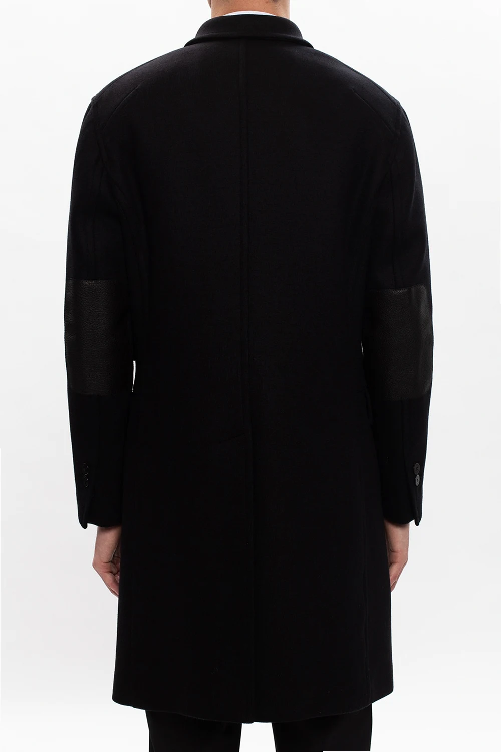 Czarny, dwurzędowy płaszcz Neil Barrett. Zapinany na zamek i guziki. Z przodu trzy kieszenie z patką. Na rękawach naszyte łaty o innej fakturze. Z tyłu rozcięcie.
