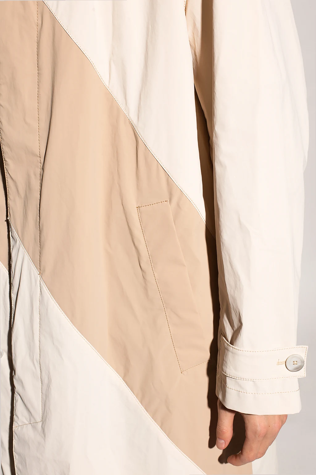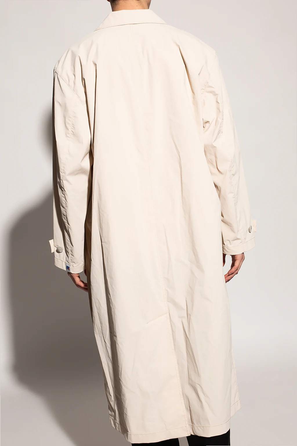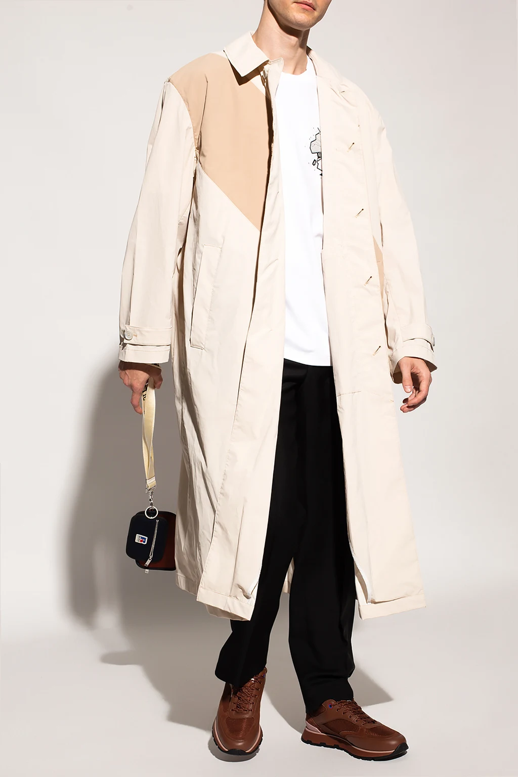 Beżowo-kremowy, długi płaszcz BOSS x Russell Athletic. Zapinany na guziki z krytą plisą. Z przodu dwie kieszenie zamykane na zatrzaski. Rękawy z paskami zapinanymi na guzik. Kolaboracja prezentuje odważne, ponadczasowe klasyki, które łączą luźne kroje, sportowe detale i inspirowaną stylem retro paletę kolorów.