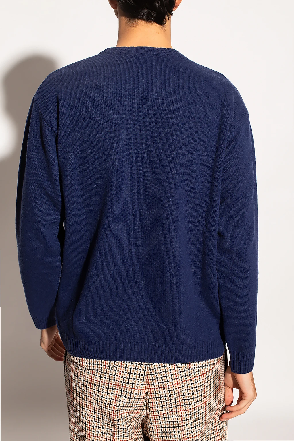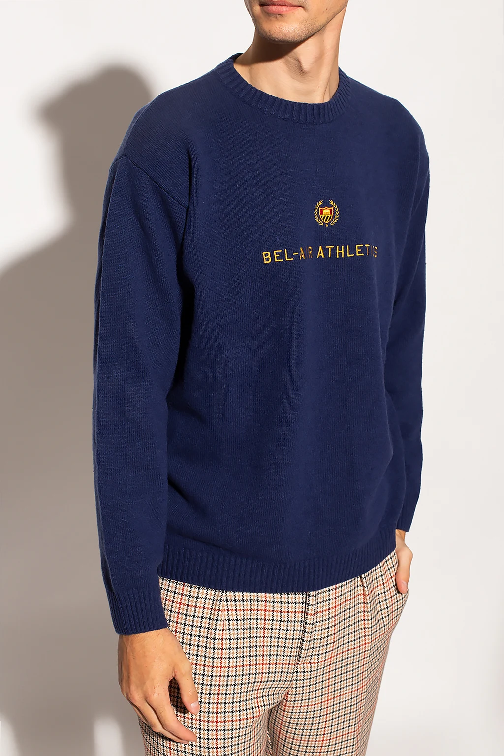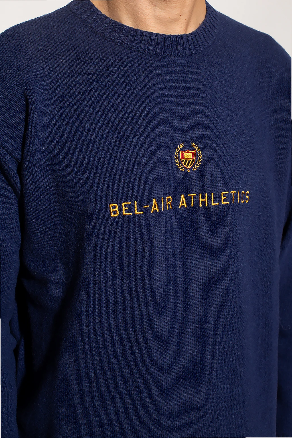 Granatowy, wełniany sweter Bel-Air Athletics. Z przodu ozdobiony kolorowo wyszytym wzorem z logo. Okrągły dekolt. Długie rękawy.