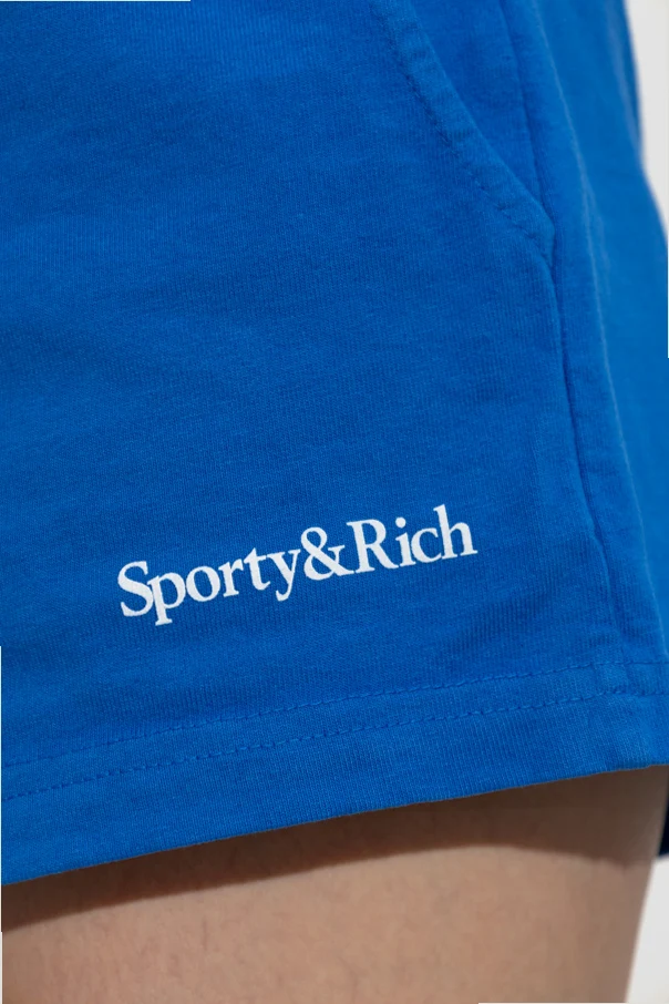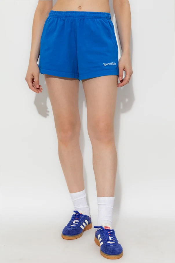Szorty Serif Logo Disco marki Sporty & Rich to esencja wyrafinowanej prostoty, która w subtelny sposób łączy dyskretny luksus z ponadczasowymi wpływami stylu vintage. Ich intensywny, niebieski kolor nadaje charakteru, a gładka powierzchnia materiału podkreśla elegancję utkaną z wysokogatunkowej bawełny.