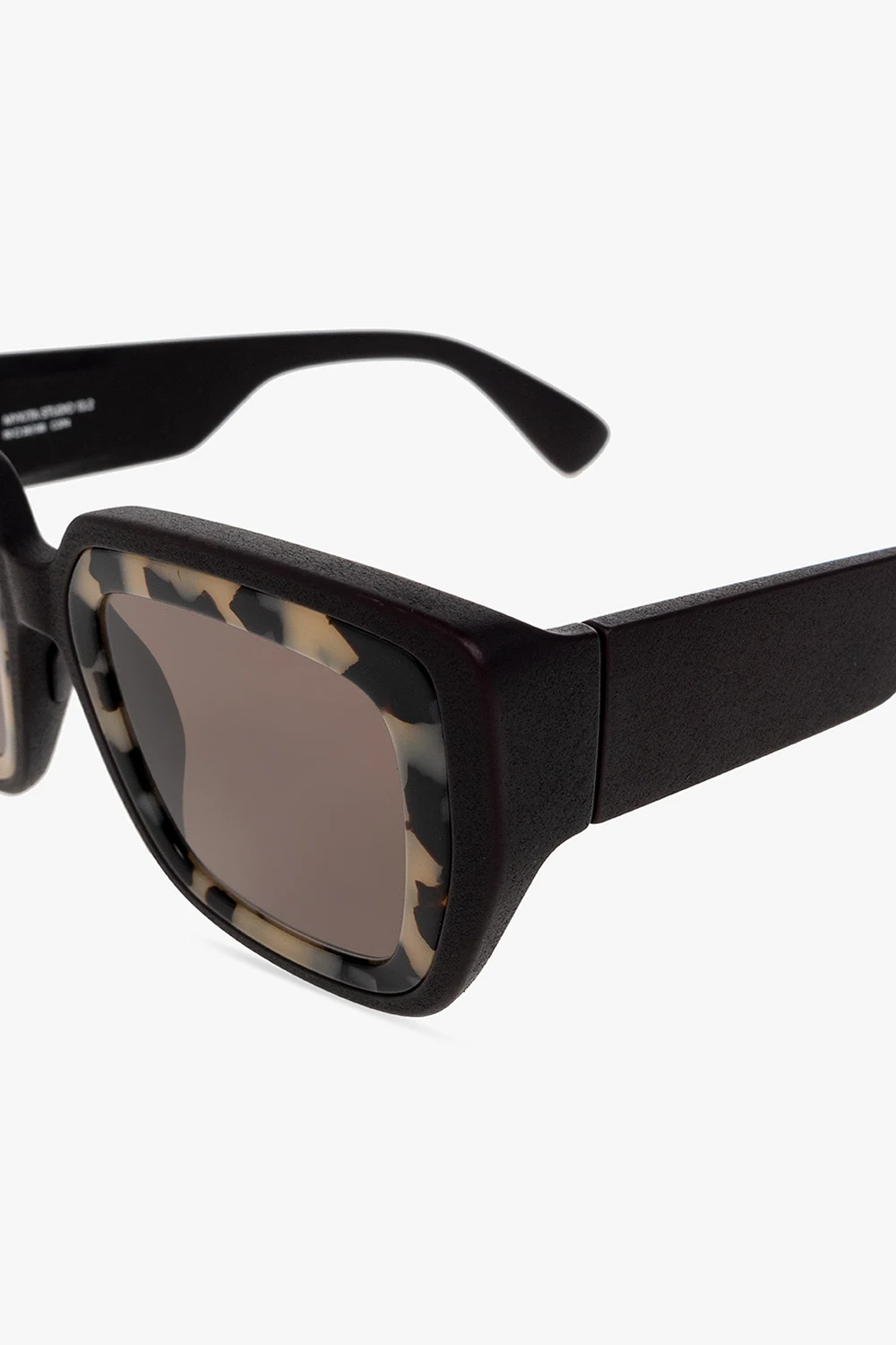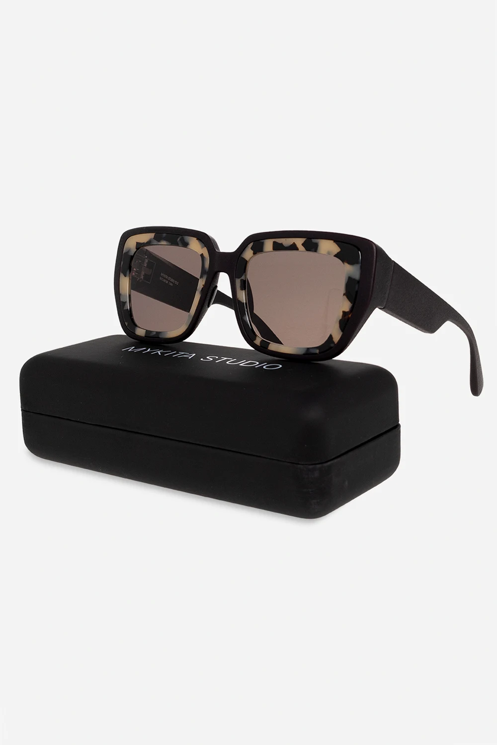 Czarne okulary przeciwsłoneczne, model ‘Studio13’ Mykita. Ozdobione szylkretowym wzorem. Hydrofobowa nanopowłoka. Czarne szkła z 100% ochroną przed promieniami UVA/UVB i wewnętrzną powłoką antyrefleksyjną. W zestawie markowe etui na okulary i ściereczka do czyszczenia.