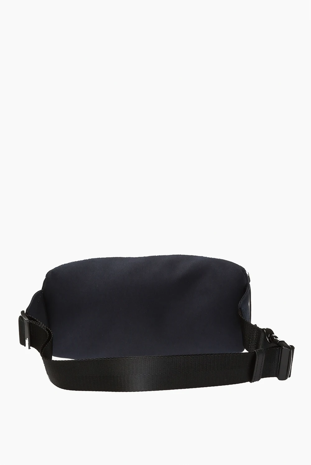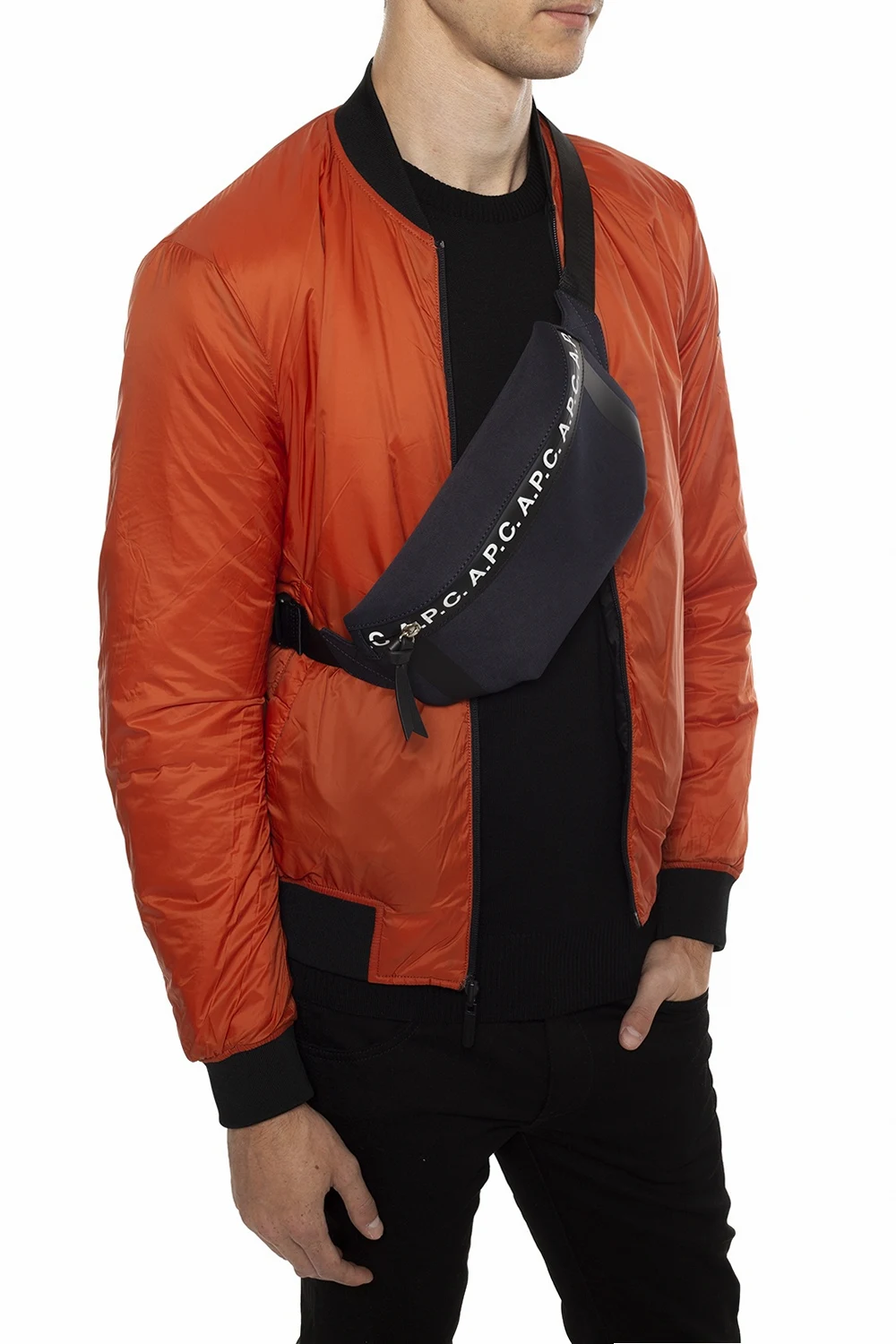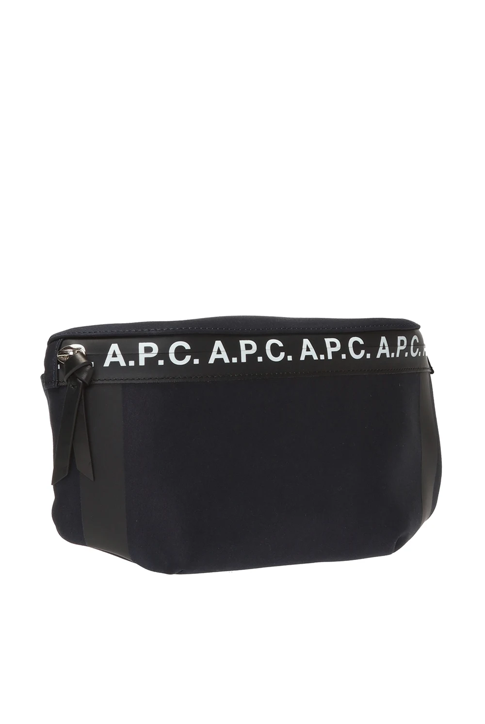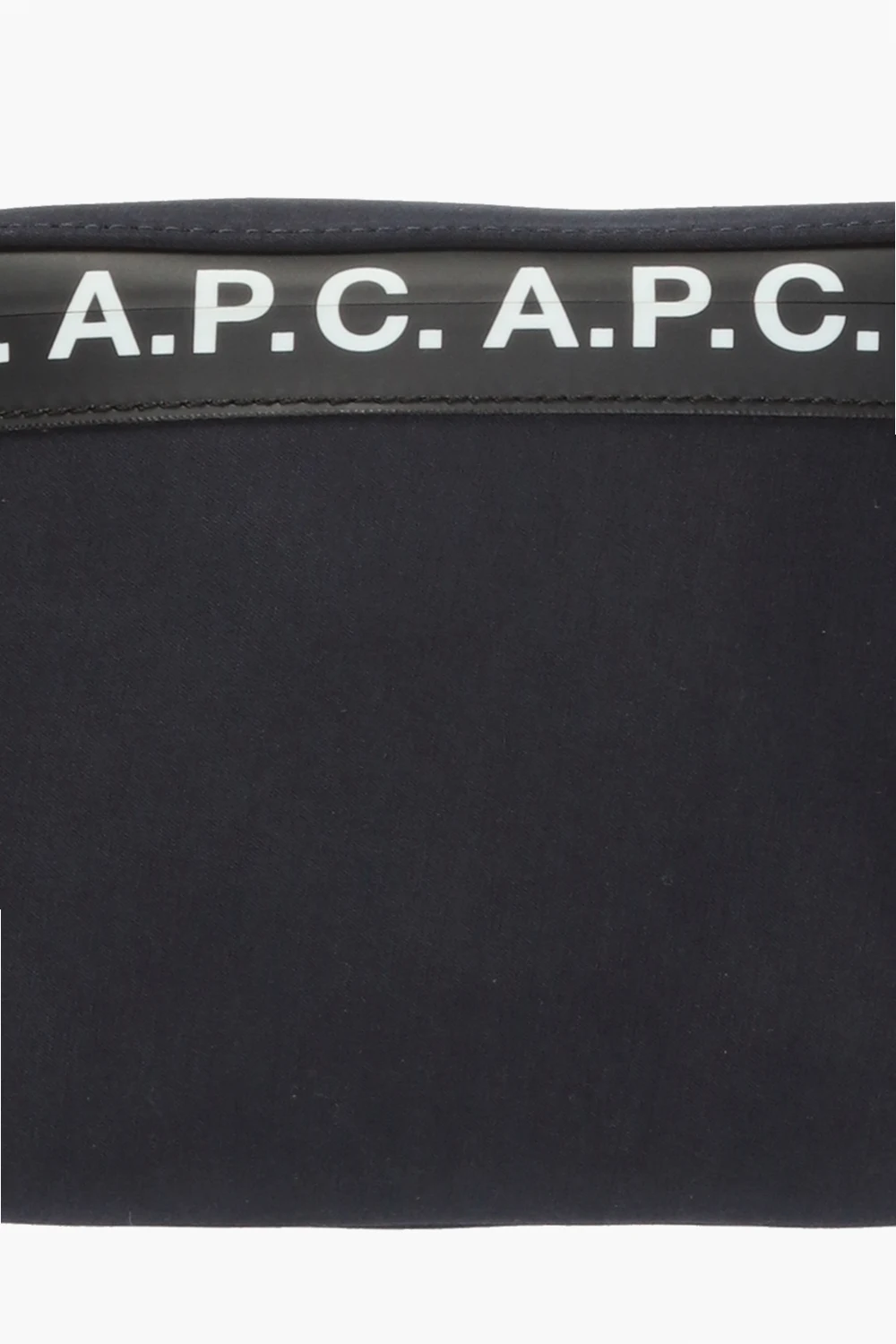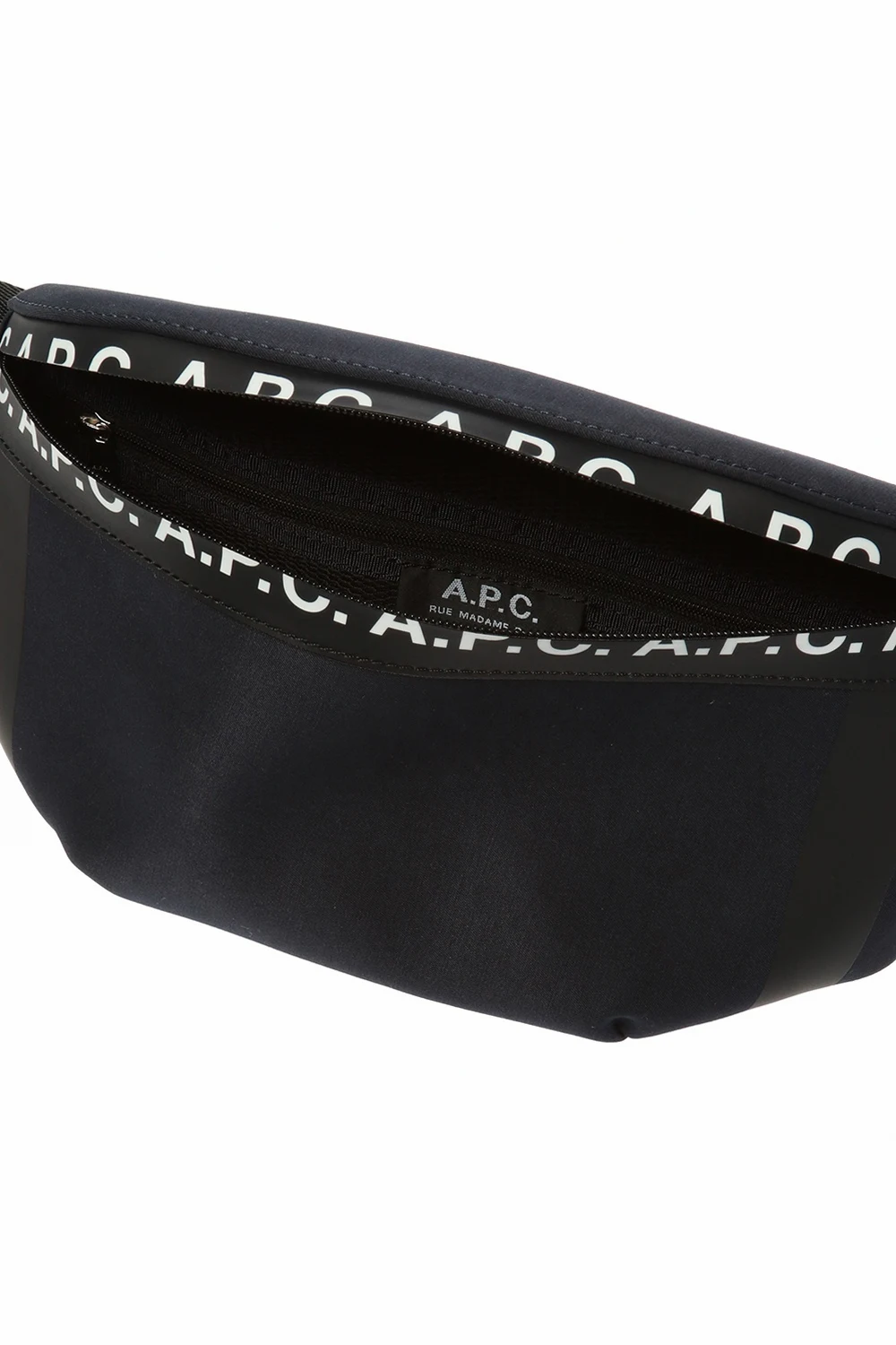 Granatowo-czarna torba na pas A.P.C. Ozdobiona nadrukowanym wzorem z logo w kolorze białym. Regulowany pasek z klamrą. Wewnątrz komora z kieszenią zamykaną na zamek. Warstwa wewnętrzna wykończona siatką.