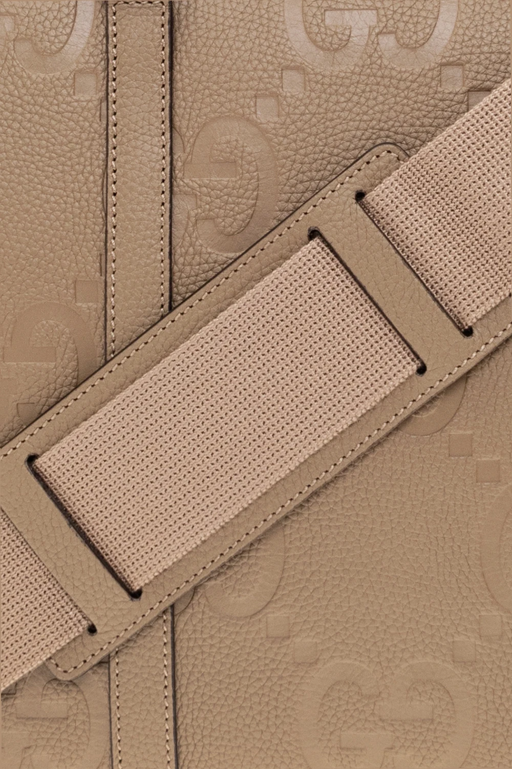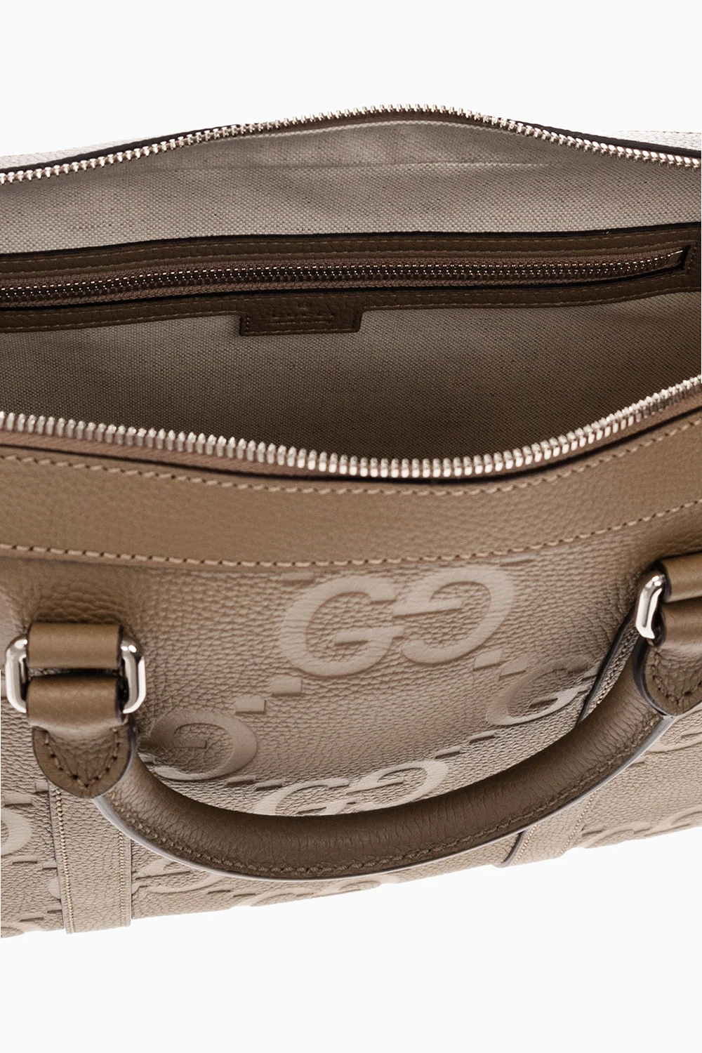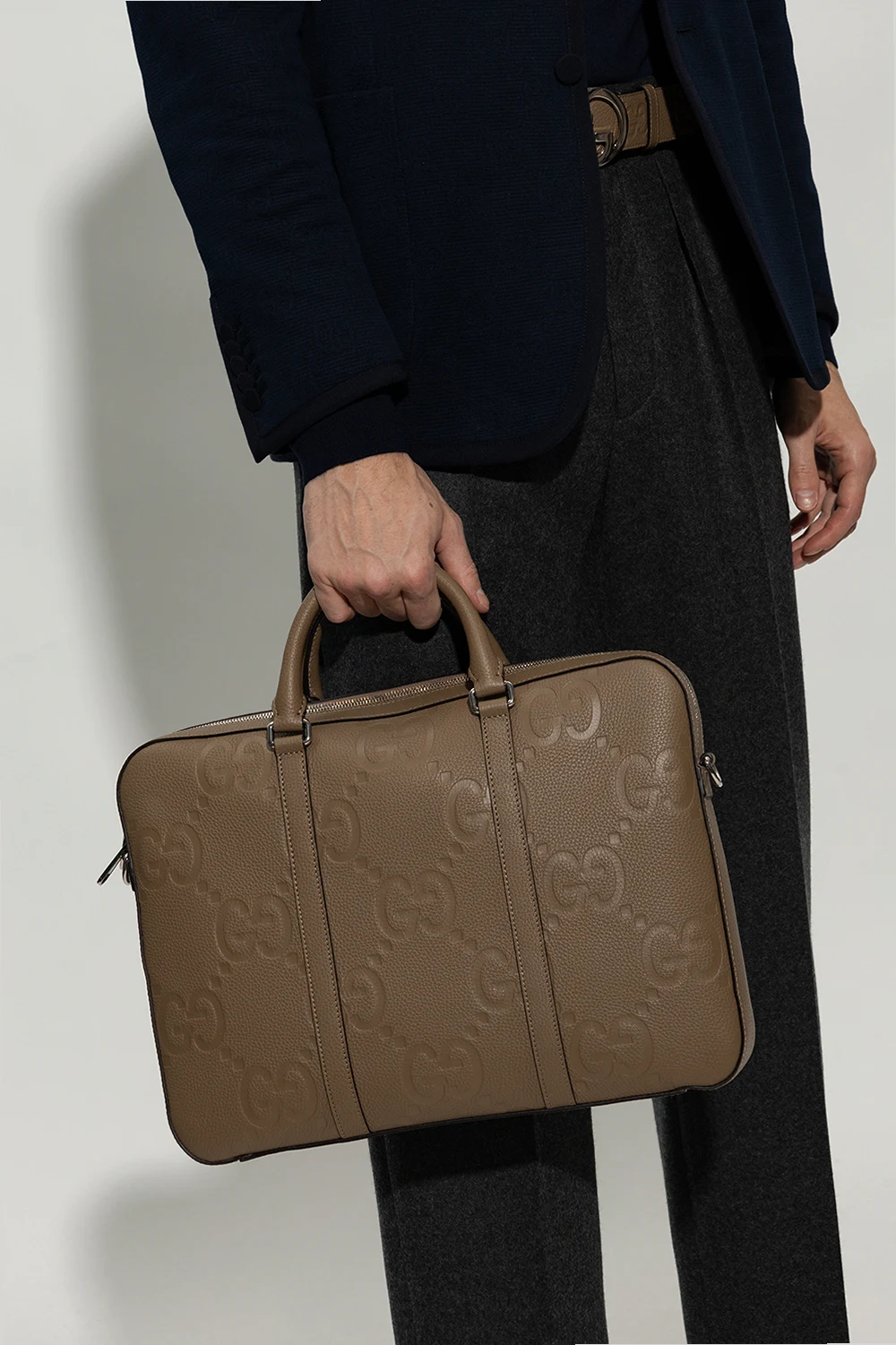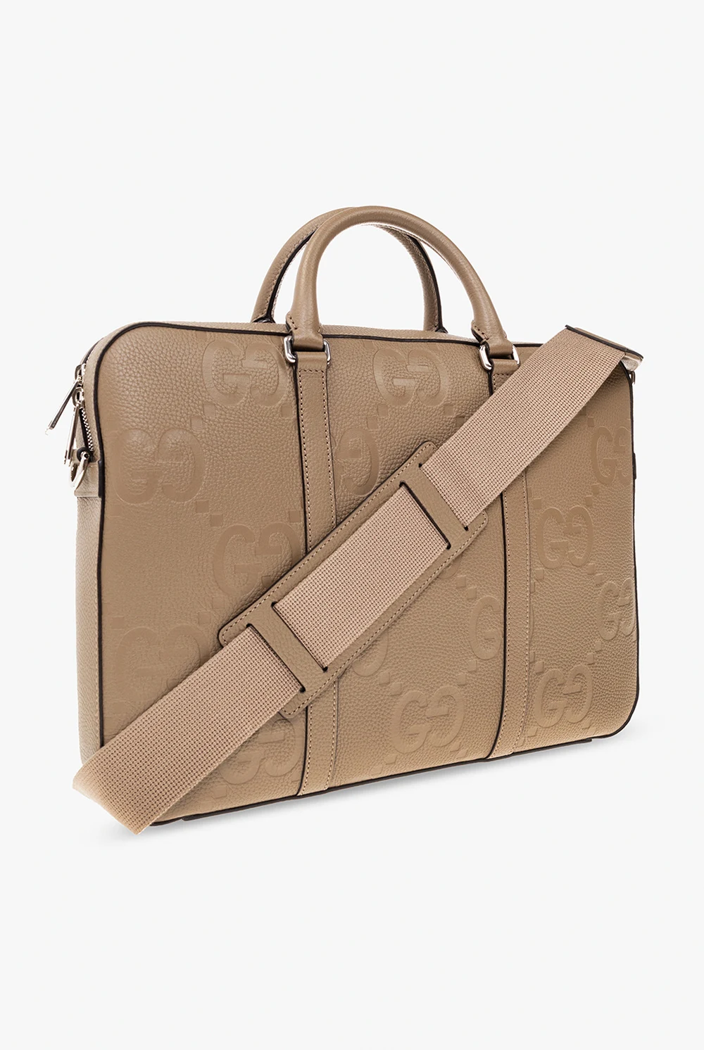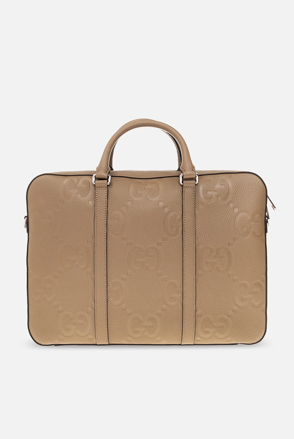 Beżowoszara aktówka Gucci. Wykonana ze skóry o ziarnistej fakturze. Zamykana na dwubiegunowy zamek. Ozdobiona wytłoczonym wzorem z motywem monogramu. Dwie półokrągłe rączki oraz odpinany pas na ramię z możliwością regulacji długości. Wewnątrz komora z trzema kieszeniami: wsuwaną, zamykaną na zamek oraz zatrzask i dwa miejsca na karty. Metalowe wykończenie w kolorze srebrnym.