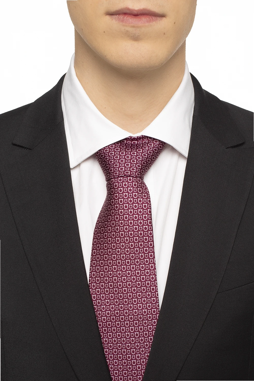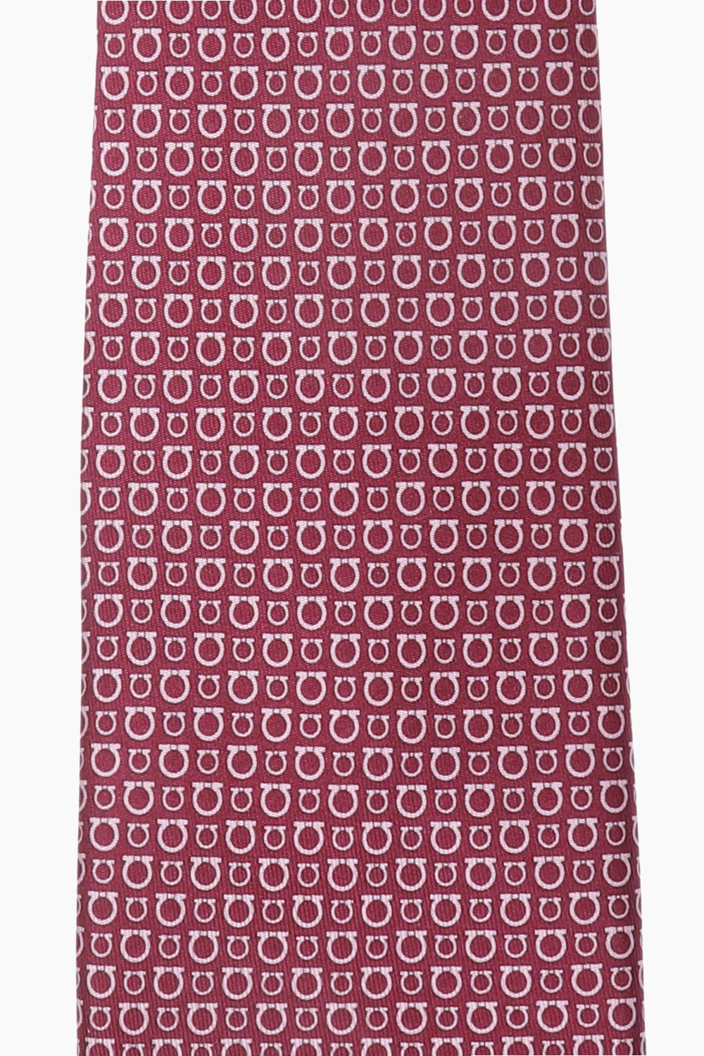 Bordowy krawat FERRAGAMO. Wykonany z jedwabiu. Ozdobiony wzorem z motywem ‘Gancini’ w kolorze różowym.