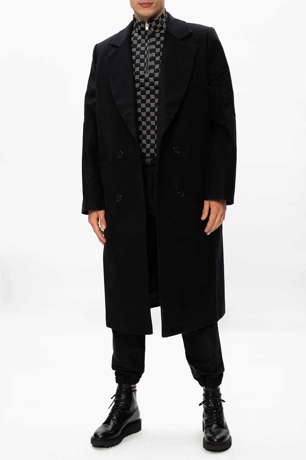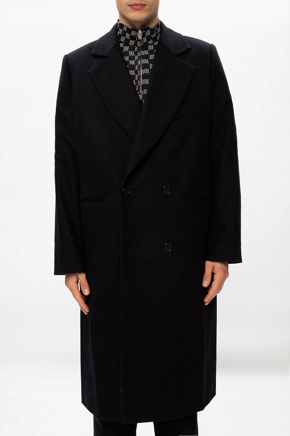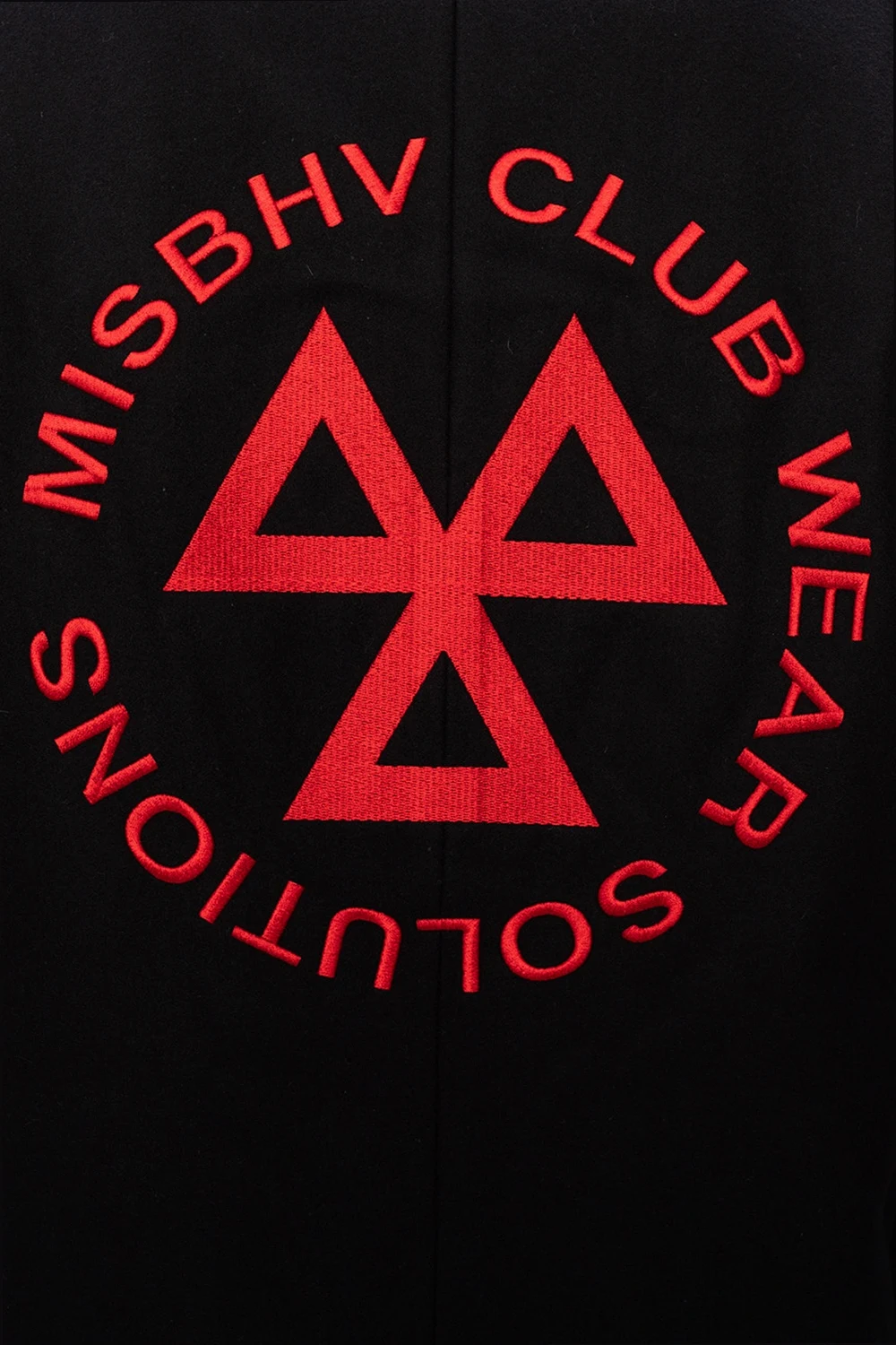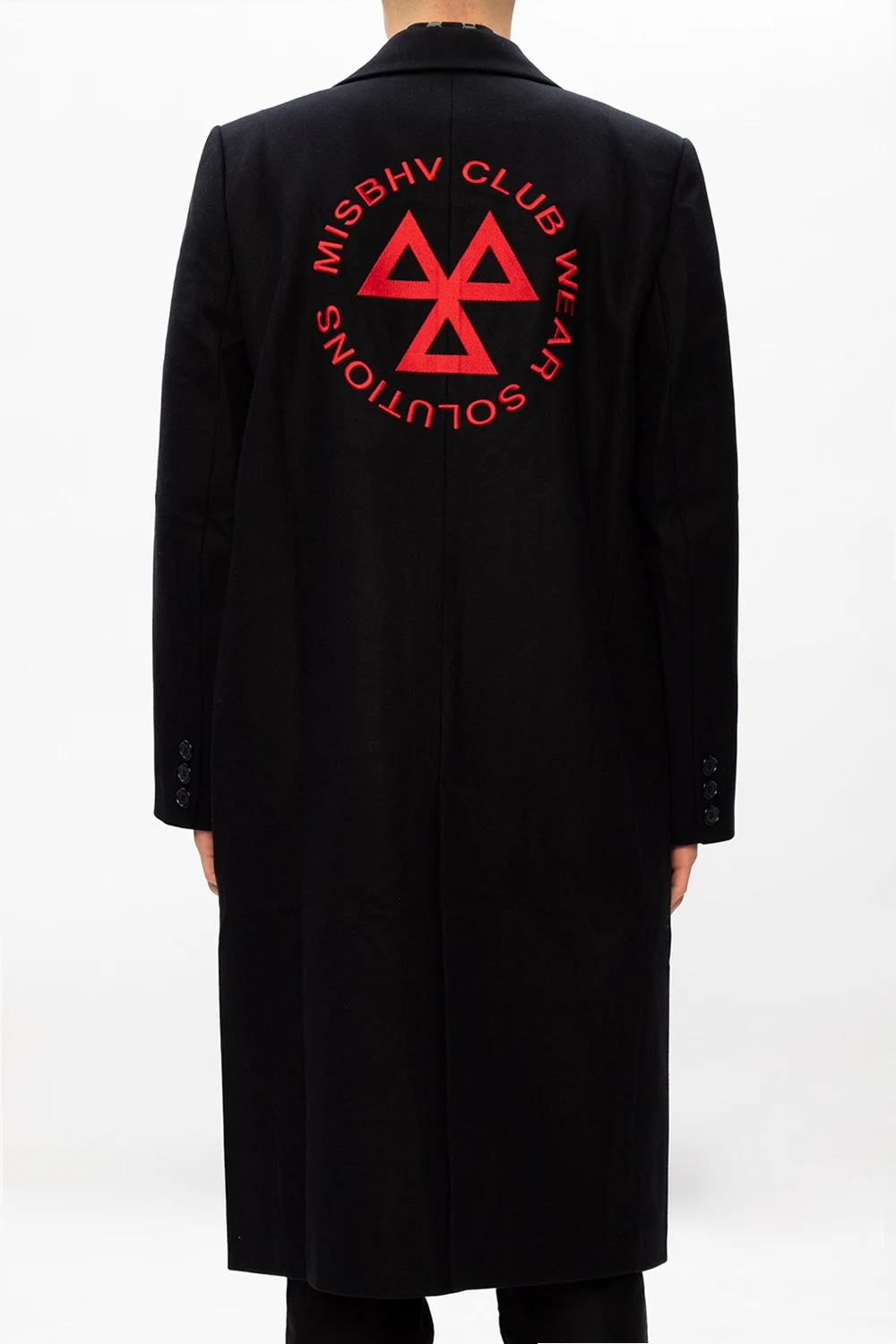 Czarny, wełniany płaszcz z otwartymi klapami, model 'CWS' MISBHV. Zapinany na guziki. Z przodu dwie kieszenie. Z tyłu wyszyta aplikacja w kolorze czerwonym oraz pojedyncze rozcięcie.