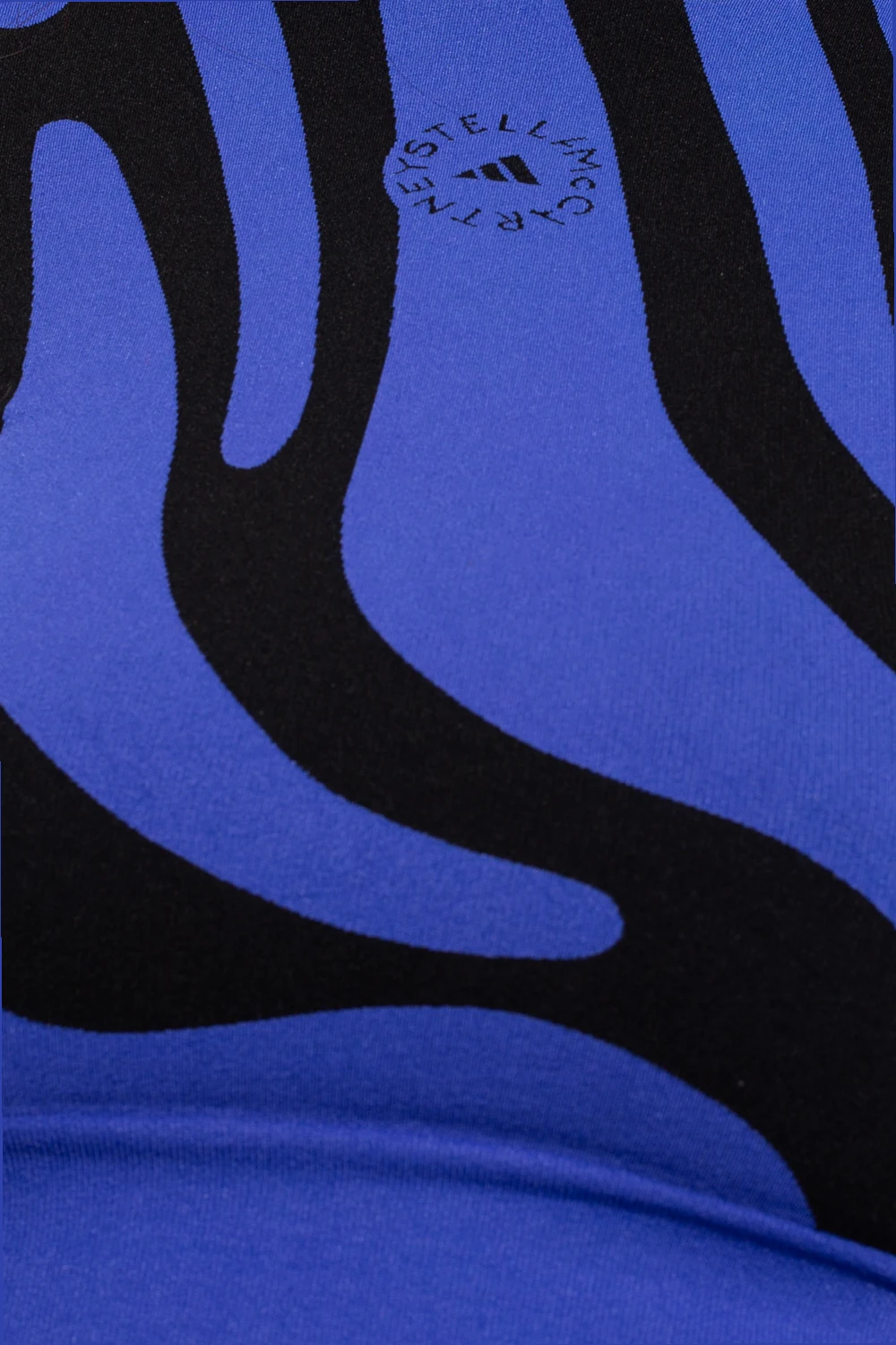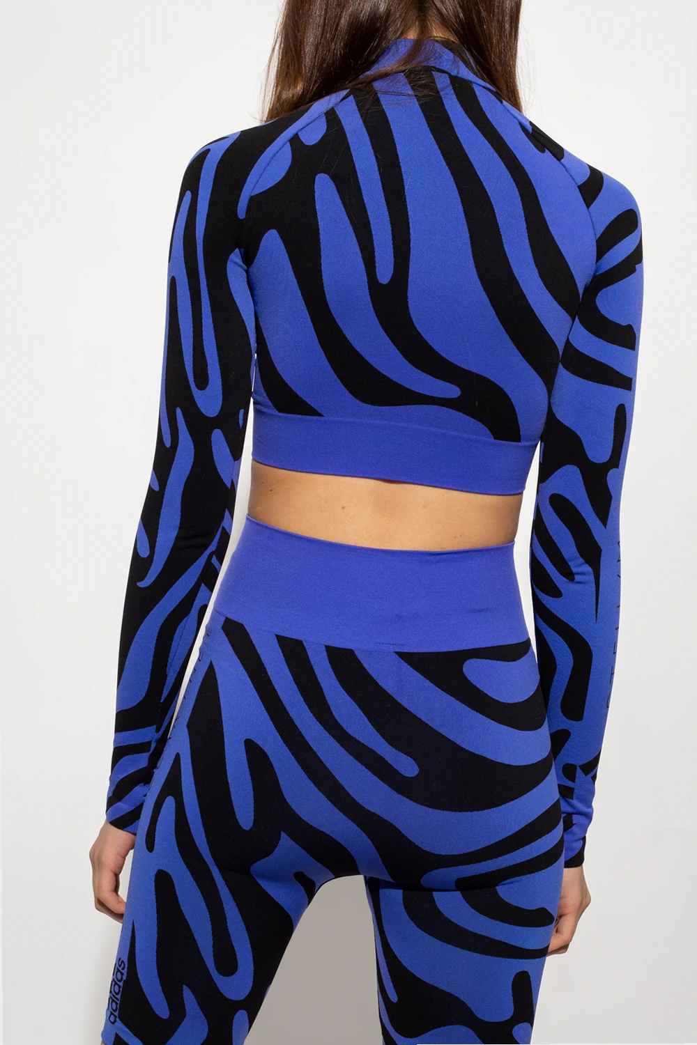 Niebiesko-czarny, krótki top ze stójką ADIDAS by Stella McCartney, kolekcja ‘Agent of Kindness’. Wykonany z dzianiny z materiałów z recyklingu. Ozdobiony na całej długości wzorem z motywem zwierzęcym. Długie rękawy z wyszytym logo oraz znak firmowy ‘Wolford’.