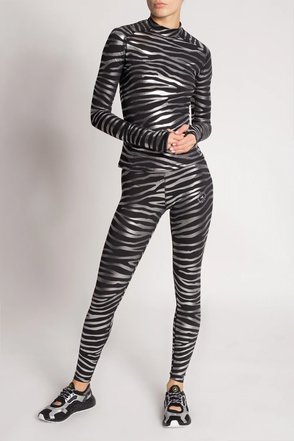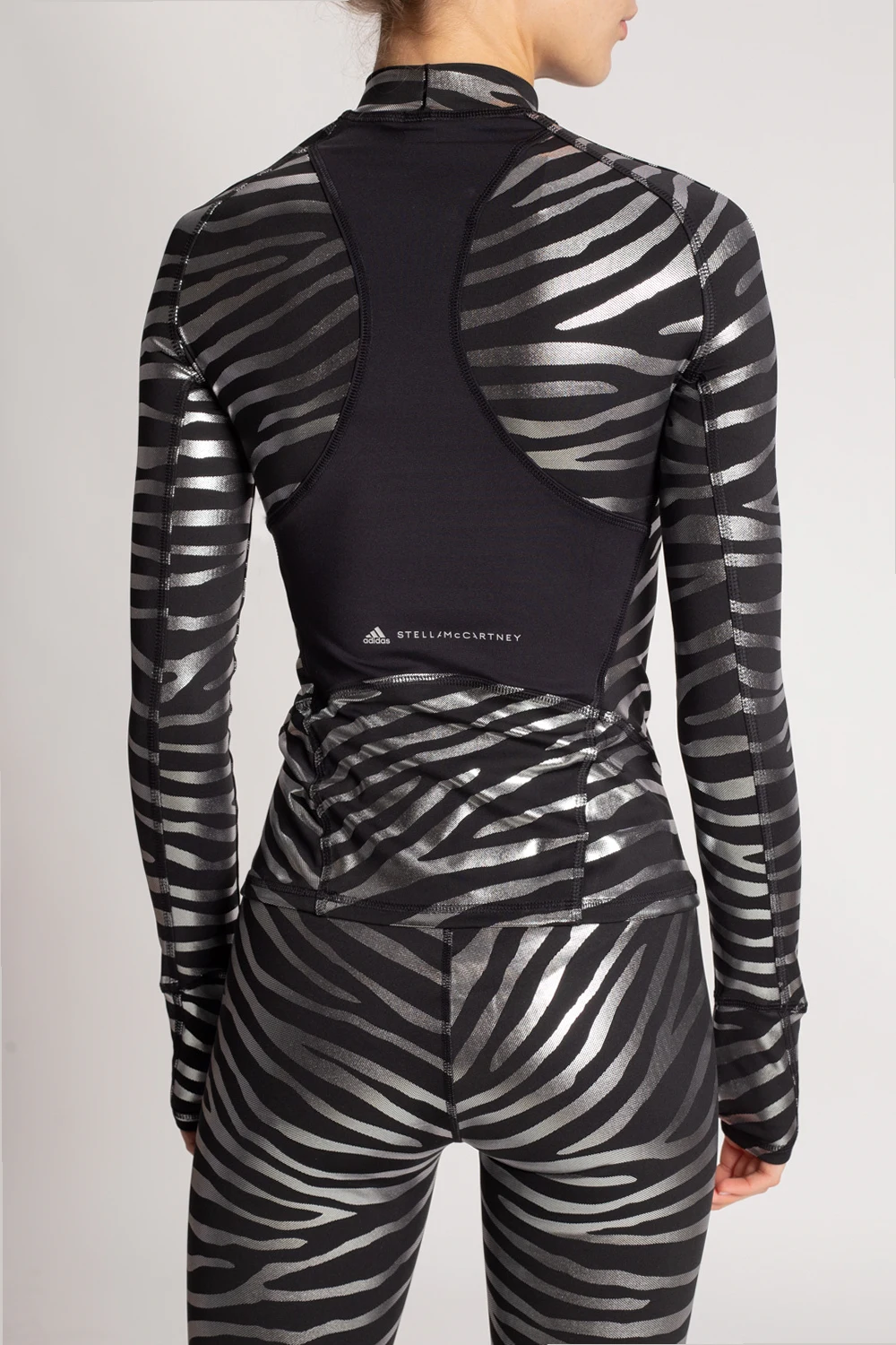 Top treningowy z długimi rękawami w kolorze czarno-srebrnym ADIDAS by Stella McCartney, linia ‘Primegreen’. Wykonany z materiału pochłaniającego wilgoć AEROREADY. Logo w kolorze białym. Nadrukowany wzór z motywem zwierzęcym. Primegreen to linia charakteryzująca się użyciem wysokiej jakości materiałów pochodzących z recyklingu.