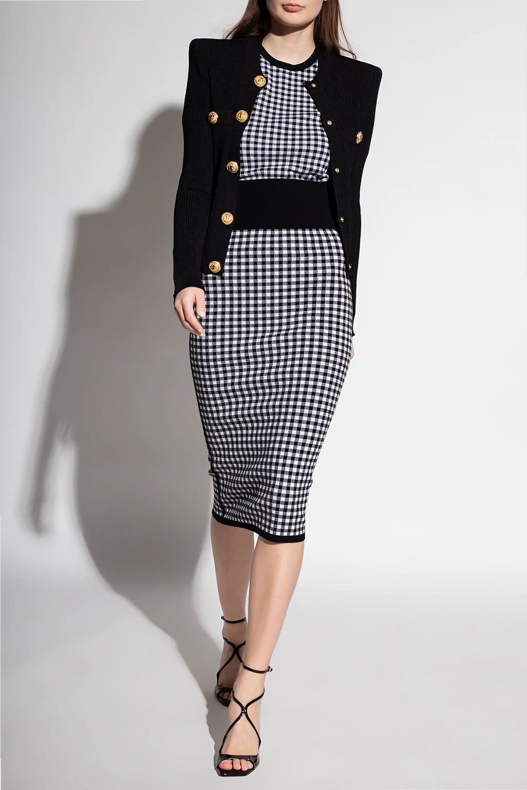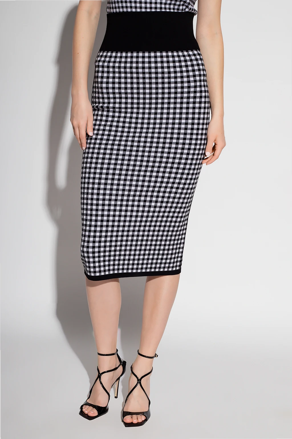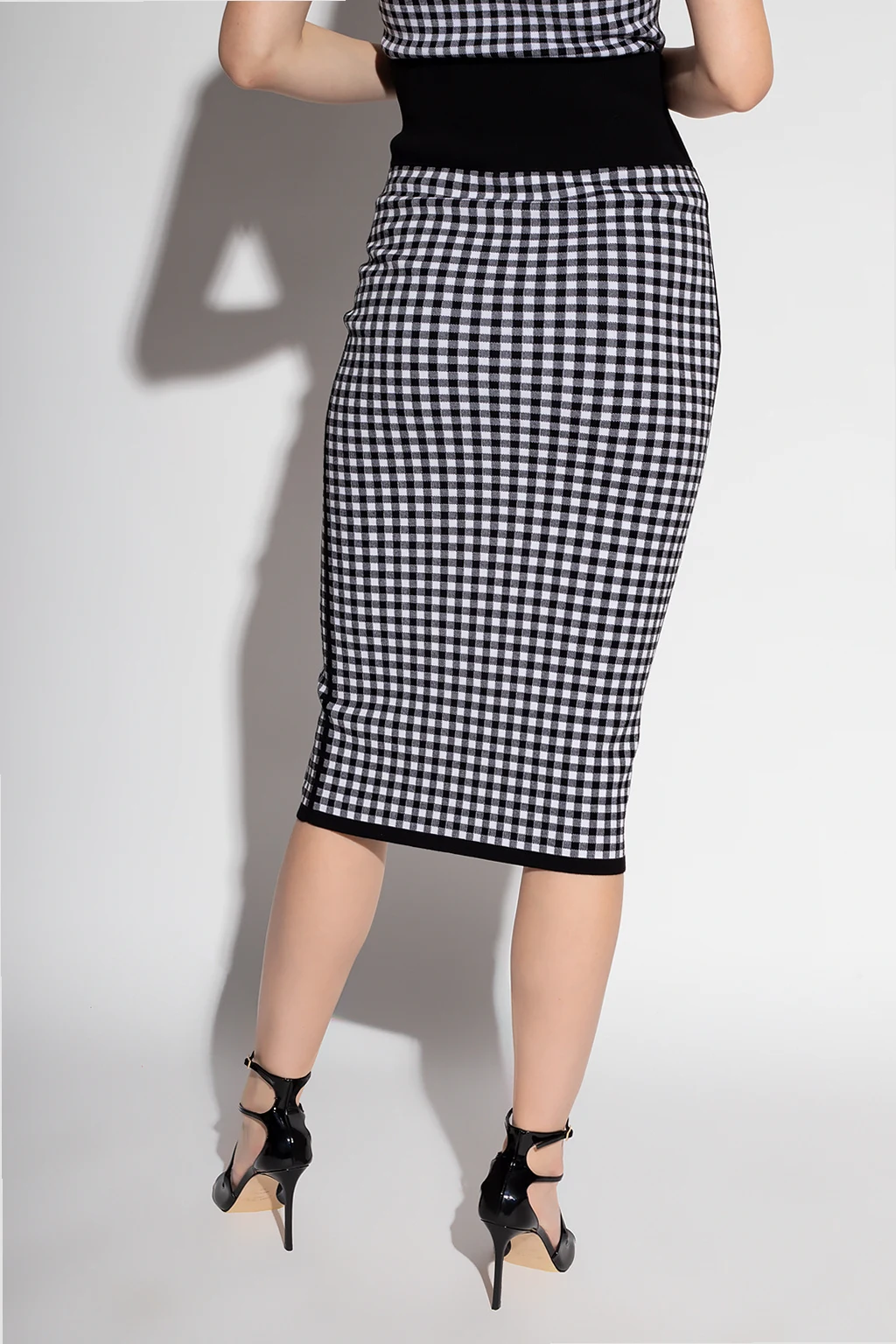 Biało-czarna spódnica ołówkowa Michael Kors. W pasie wszyta guma. Ozdobiona wzorem w kratę.