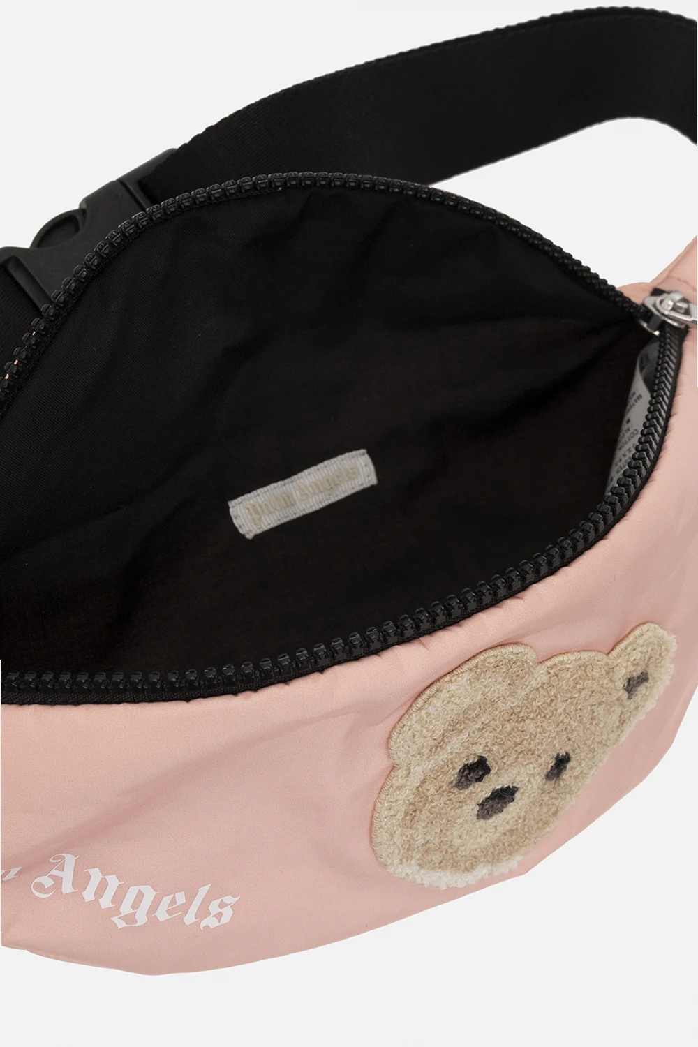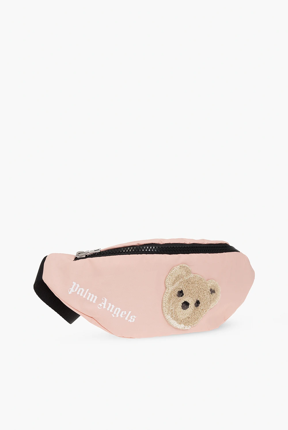 Różowopomarańczowa torba na pas Palm Angels Kids. Zapinana na zamek. Ozdobiona futrzanym wzorem w kształcie misia oraz nadrukiem z logo. Pas biodrowy z możliwością regulacji długości. Wewnątrz komora. Metalowe wykończenie w kolorze srebrnym.