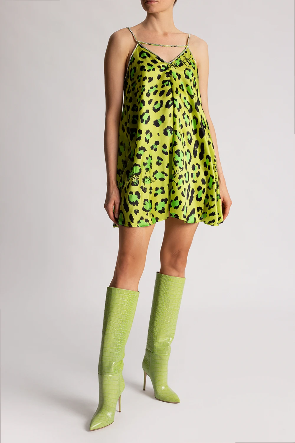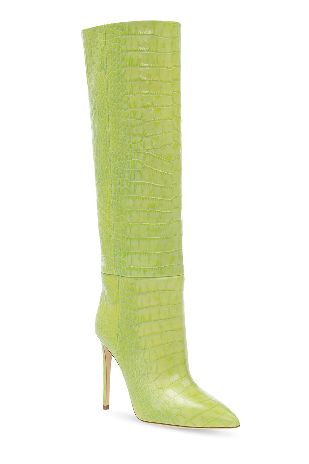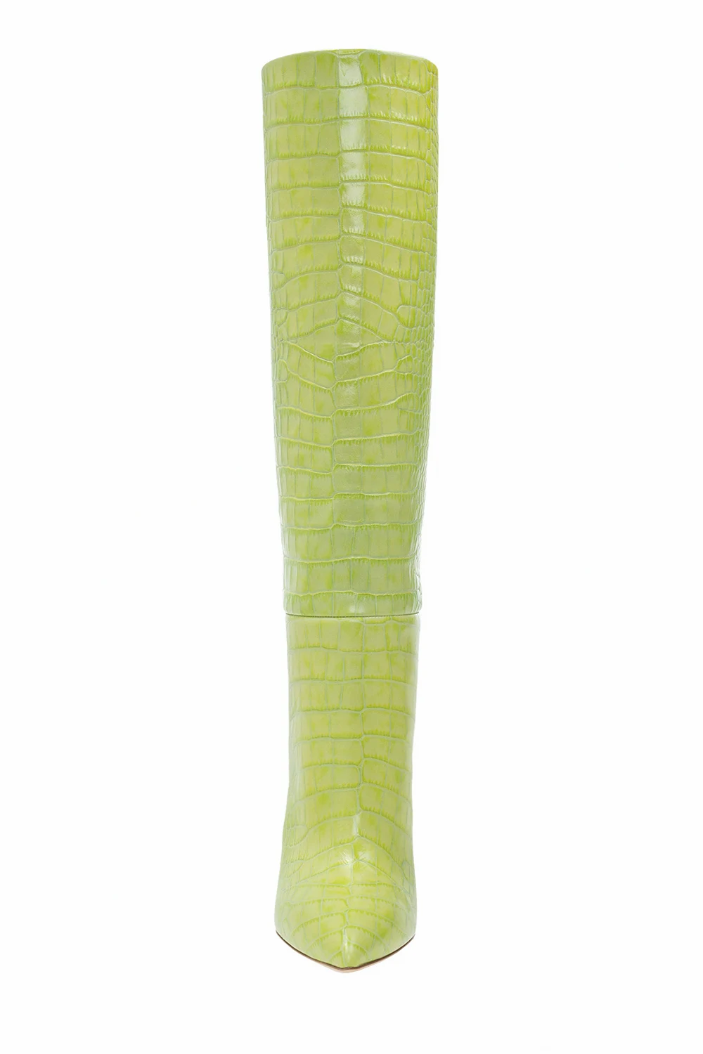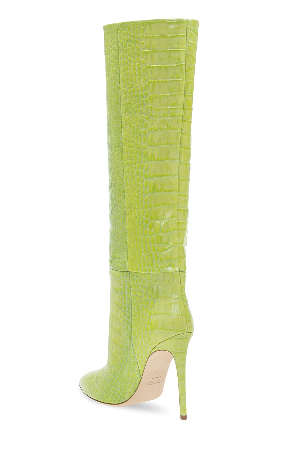 Zielone kozaki na obcasie, model ‘Stiletto’ Paris Texas. Wykonane ze skóry imitującej skórę krokodyla. Nosek w szpic. Beżowa, skórzana podeszwa.