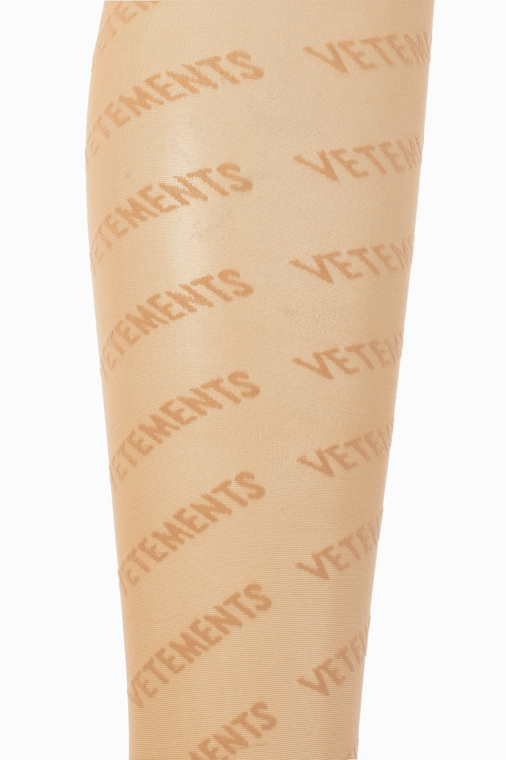 Beżowe, transparentne rajstopy VETEMENTS x Wolford. Ozdobione logo. W pasie wszyta guma.
