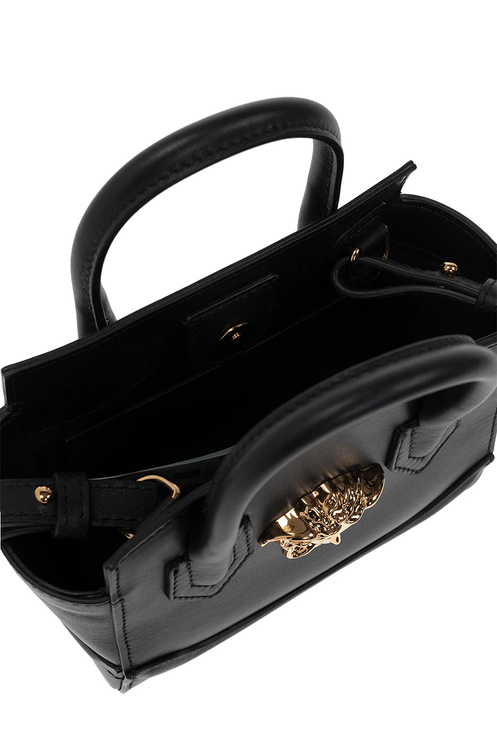 Czarna torba na ramię, model ‘Medusa Mini’ Versace Kid. Wykonana z cielęcej skóry. Zamykana na magnetyczny zatrzask. Z przodu aplikacja z charakterystyczną dla marki głową Meduzy. Dwie półokrągłe rączki. Odpinany pasek na ramię z możliwością regulacji długości. Czarna, bawełniana warstwa wewnętrzna wykończona skórą. Wewnątrz komora i wsuwana kieszeń. Metalowe wykończenie w kolorze złotym.