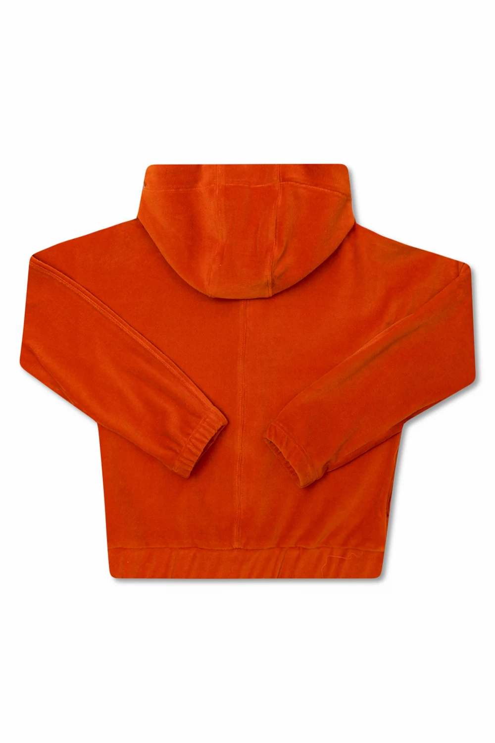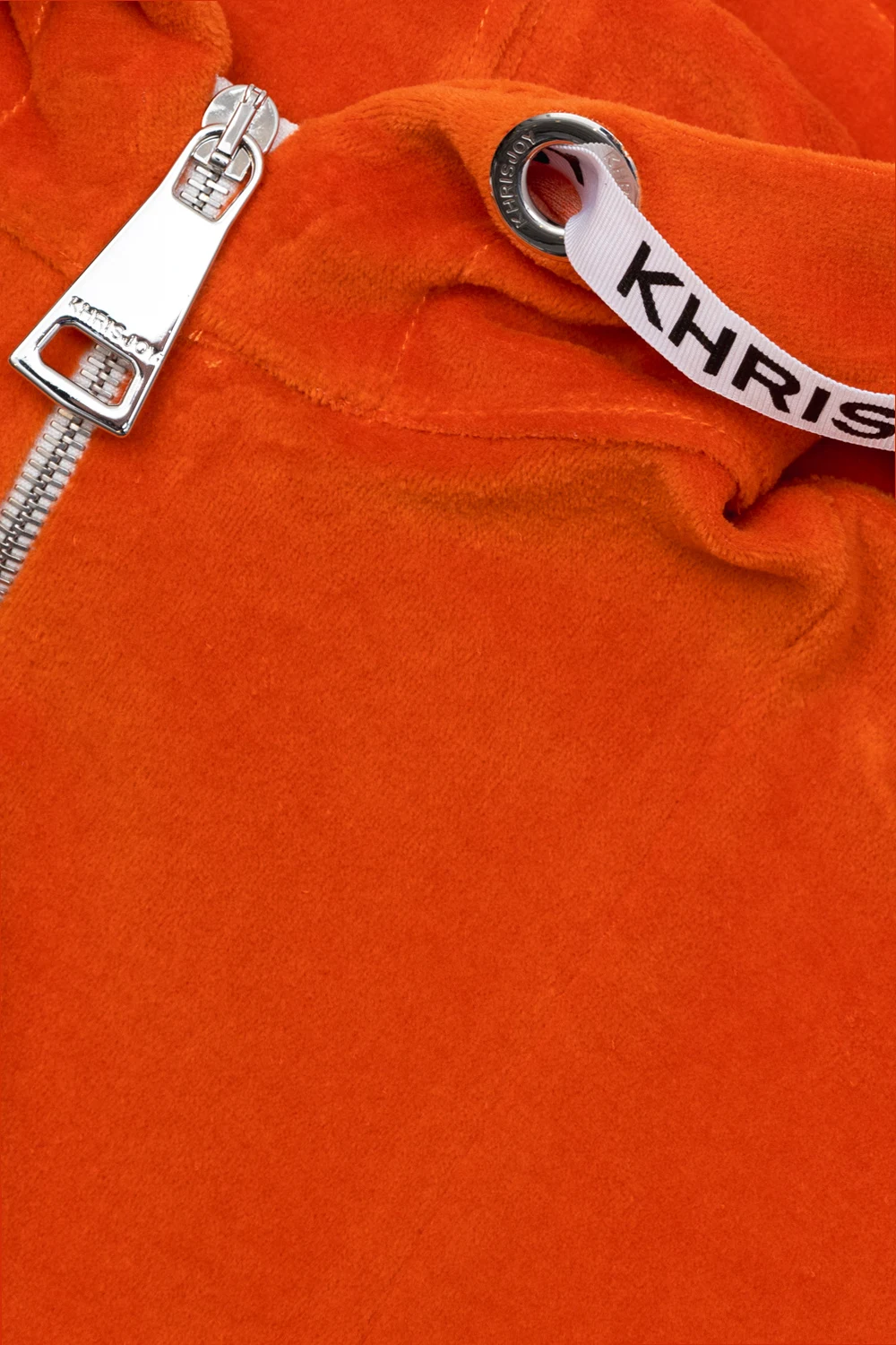 Pomarańczowa, welurowa bluza Khrisjoy Kids. Zapinana na zamek. Kaptur ściągany białymi trokami z nadrukowanym czarnym logo. Po bokach kieszeń. Długie rękawy i dół bluzy zakończone wszytą gumą.