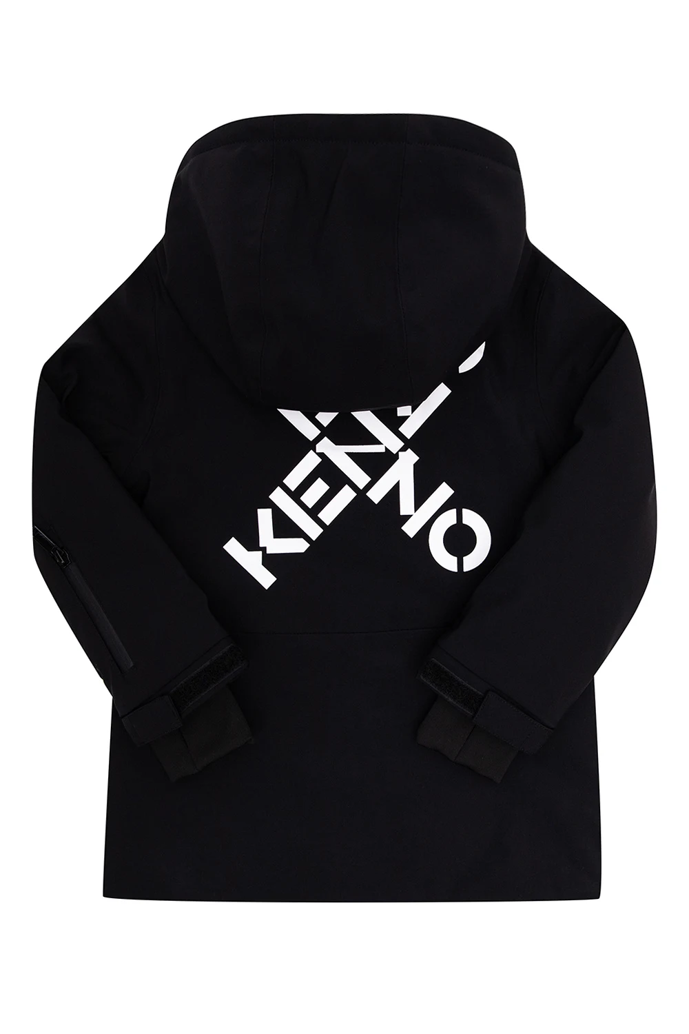 Czarna, ocieplana kurtka z kapturem Kenzo Kids. Zapinana na zamek. Ozdobiona nadrukiem z logo w kolorze białym. Z przodu dwie kieszenie zamykane na zamek. Rękawy zapinane na rzep, wykończone materiałem z wycięciem na kciuk. Wewnątrz dodatkowa warstwa ze ściągaczem zapinana na zatrzask.