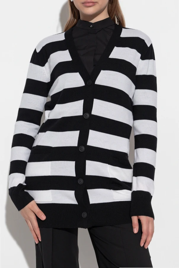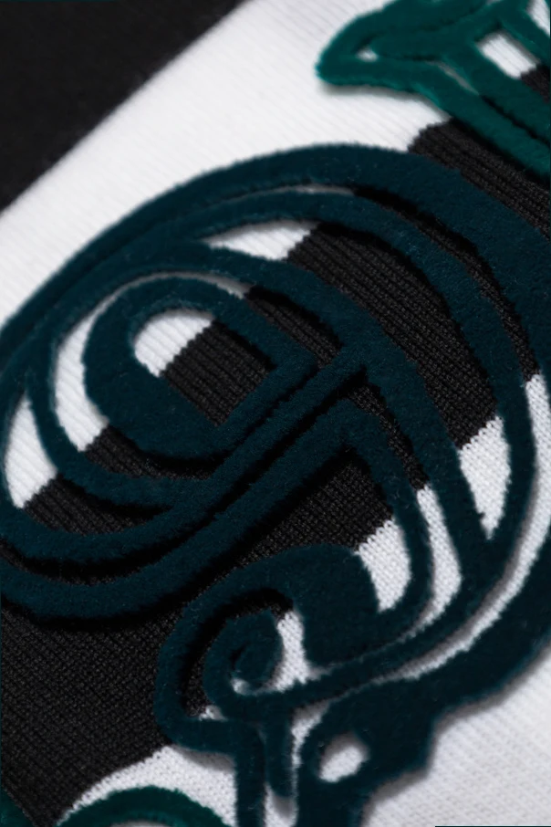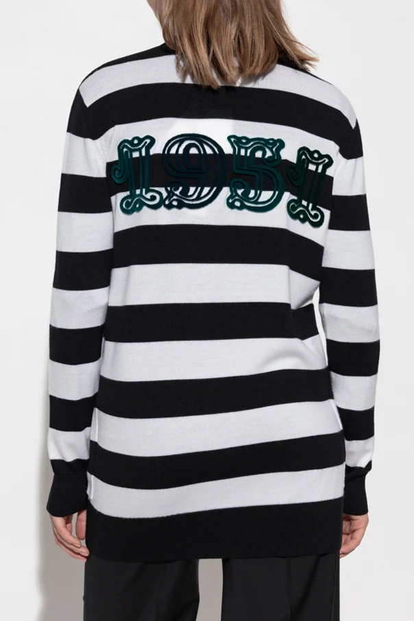 Na całej powierzchni kardiganu dominują szerokie poziome pasy w klasycznej czerni i bieli, przyciągające wzrok geometryczną harmonią wzoru. Wyjątkową cechą jest trójwymiarowy haft w kolorze ciemnozielonym na plecach – stylizowany napis „1951” czyni ten model niepowtarzalnym symbolem dziedzictwa marki.