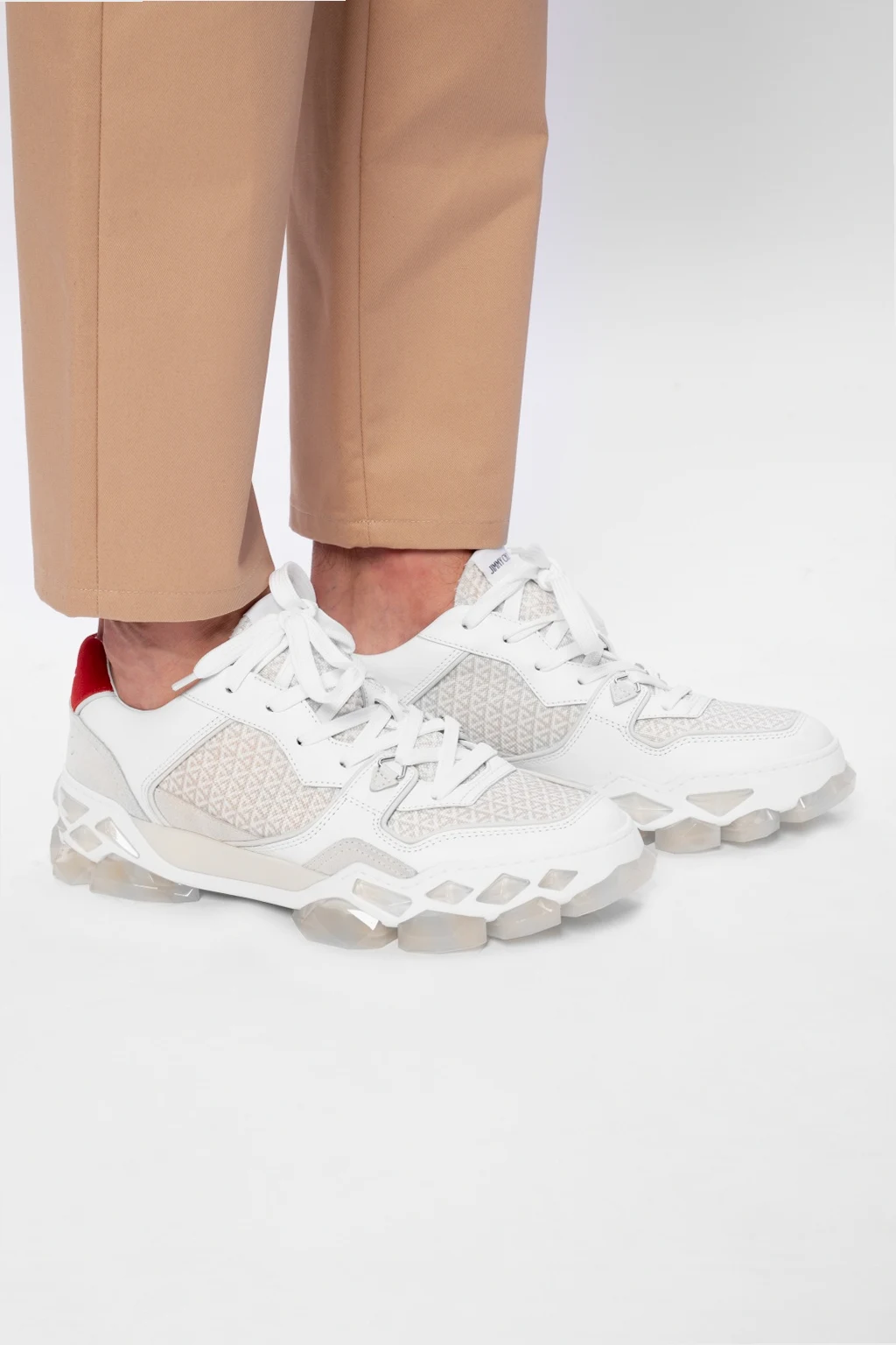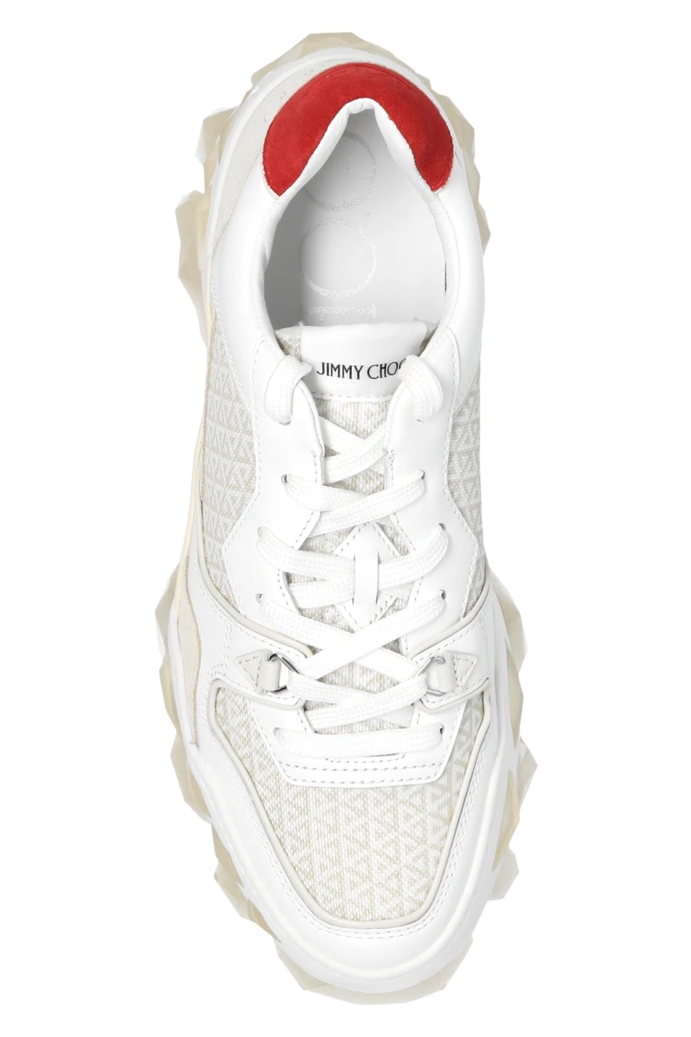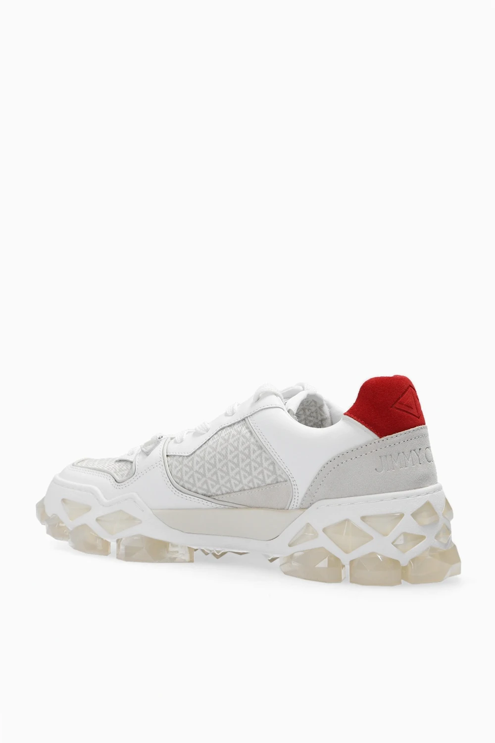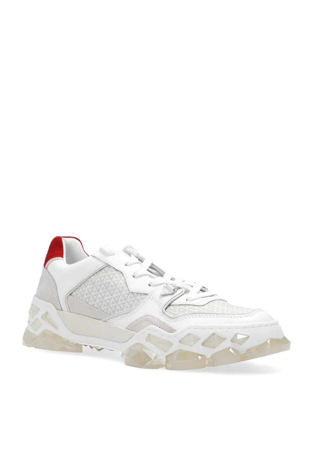 Biało-kremowo-czerwone, sznurowane buty sportowe, model ‘Diamond x Trainer’ Jimmy Choo. Wykonane ze skóry oraz z zamszu. Ozdobione aplikacjami z logo oraz kremowo-białym wzorem. Kremowo-biała podeszwa o specjalnej fakturze.