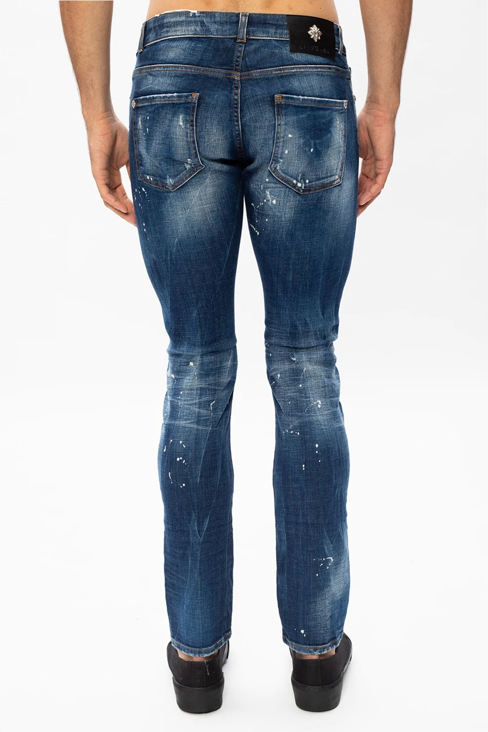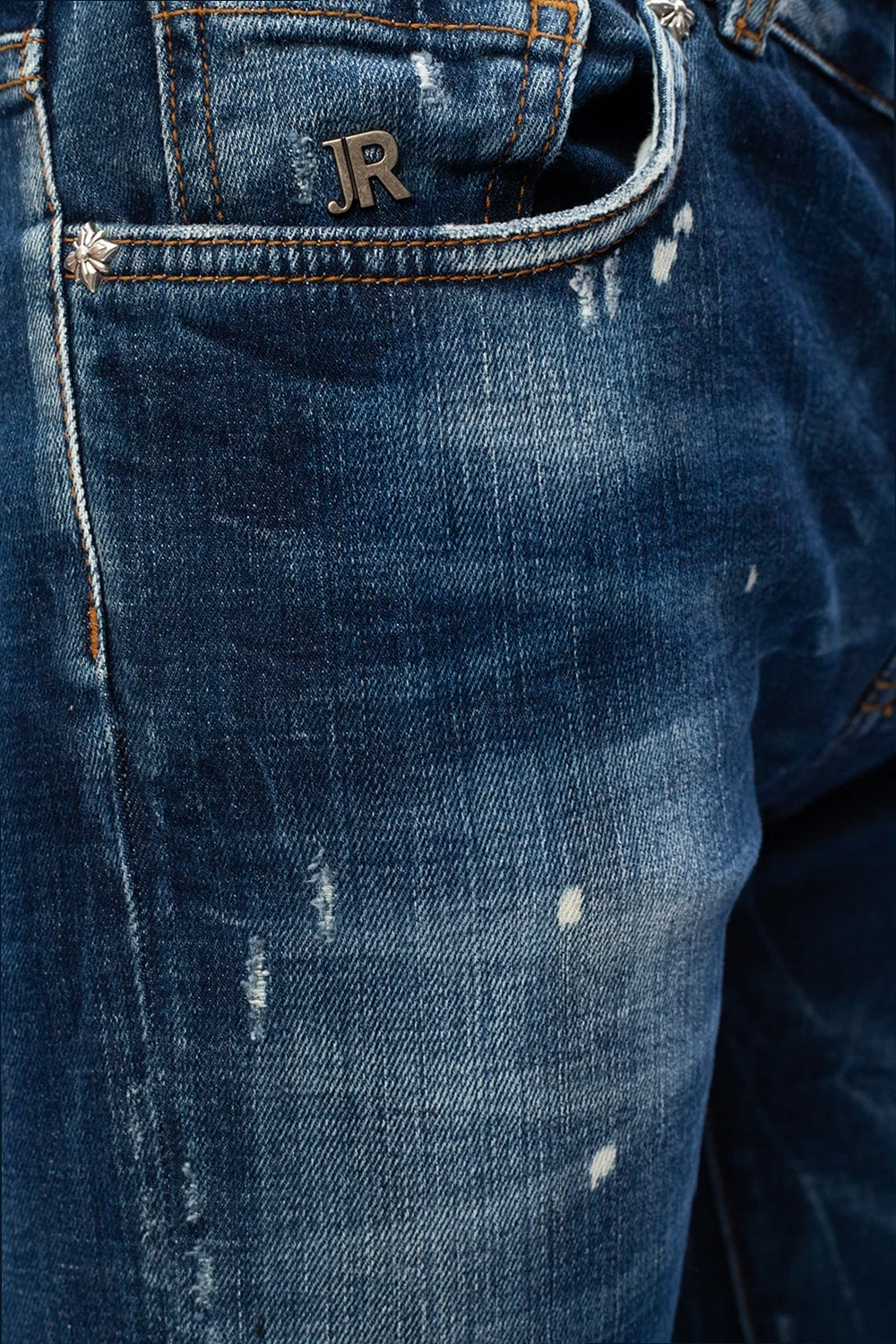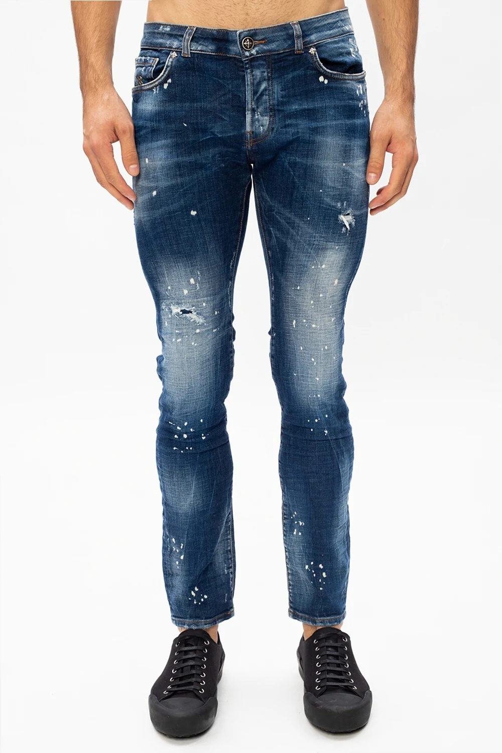 Niebieskie jeansy, model ‘Iggy’ John Richmond. Zapinane na guziki. Z tyłu naszywka z logo i metalową aplikacją. Efekt plam po farbie w kolorze białym oraz przetarcia. Cztery wsuwane kieszenie: dwie z przodu i dwie z tyłu. Zwężane nogawki.