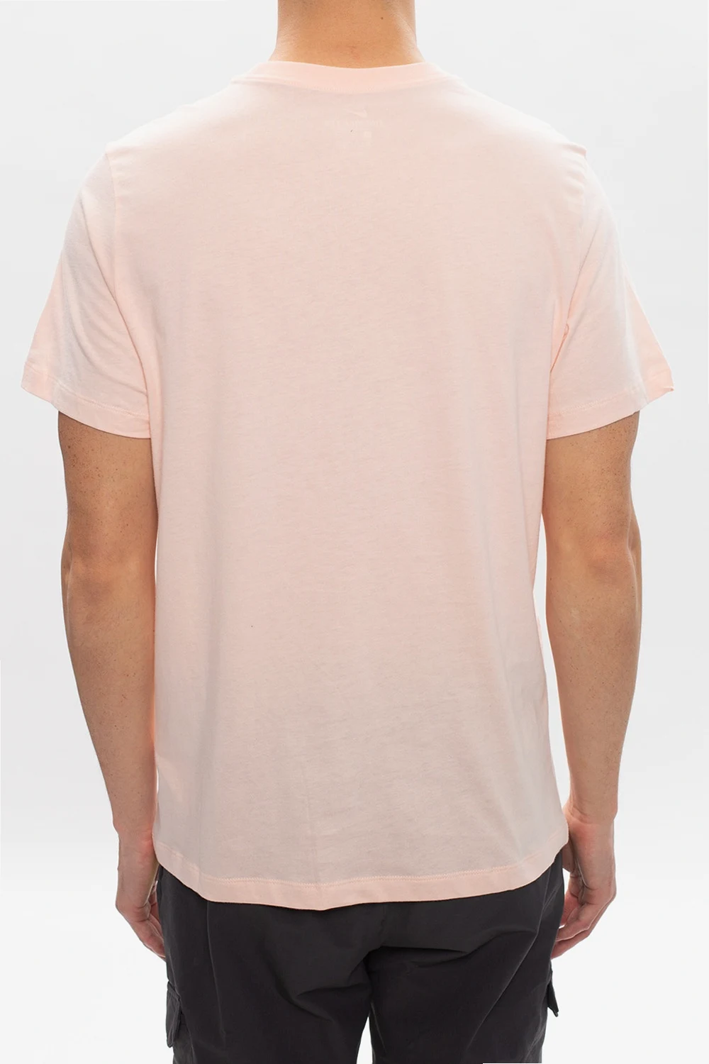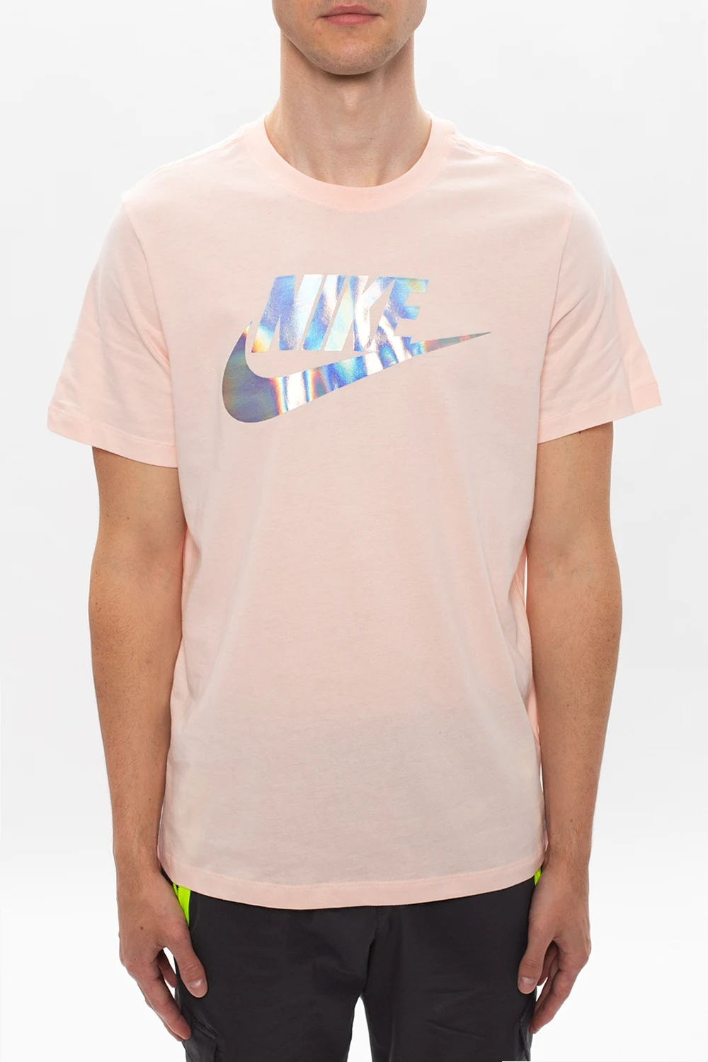Jasnoróżowy, bawełniany t-shirt Nike. Z przodu nadrukowane logo z efektem holograficznym. Okrągły dekolt. Krótkie rękawy.