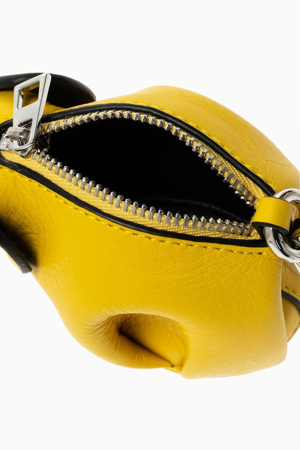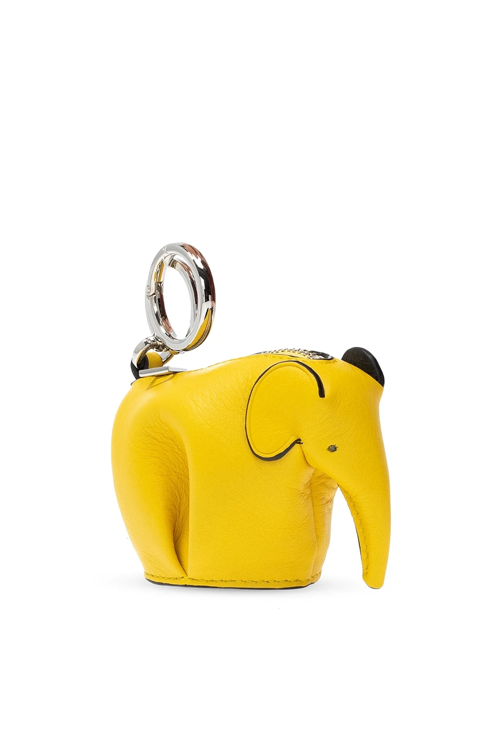 Żółty brelok, model ‘Elephant’ Loewe. Wykonany ze skóry cielęcej. Zapinany na zamek. Dodatkowy okrągły karabińczyk. U dołu wytłoczone logo. Wewnątrz komora. Metalowe elementy w kolorze srebrnym.
