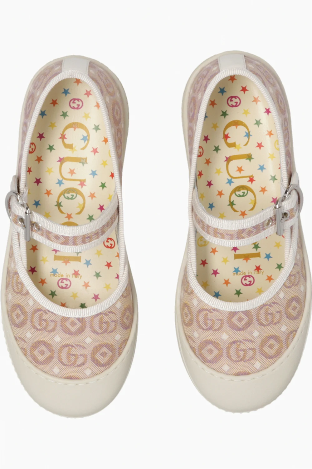 Kremowo-beżowe buty Gucci Kids. Wykonane z materiału. Zapinana na pas z klamrą. Ozdobione wzorem z monogramem. Kremowa, gumowa podeszwa.