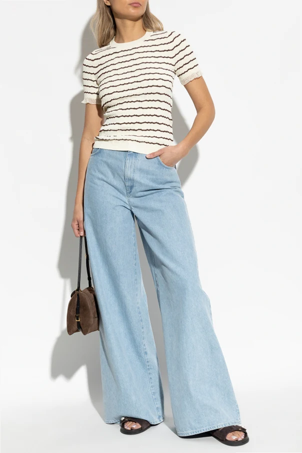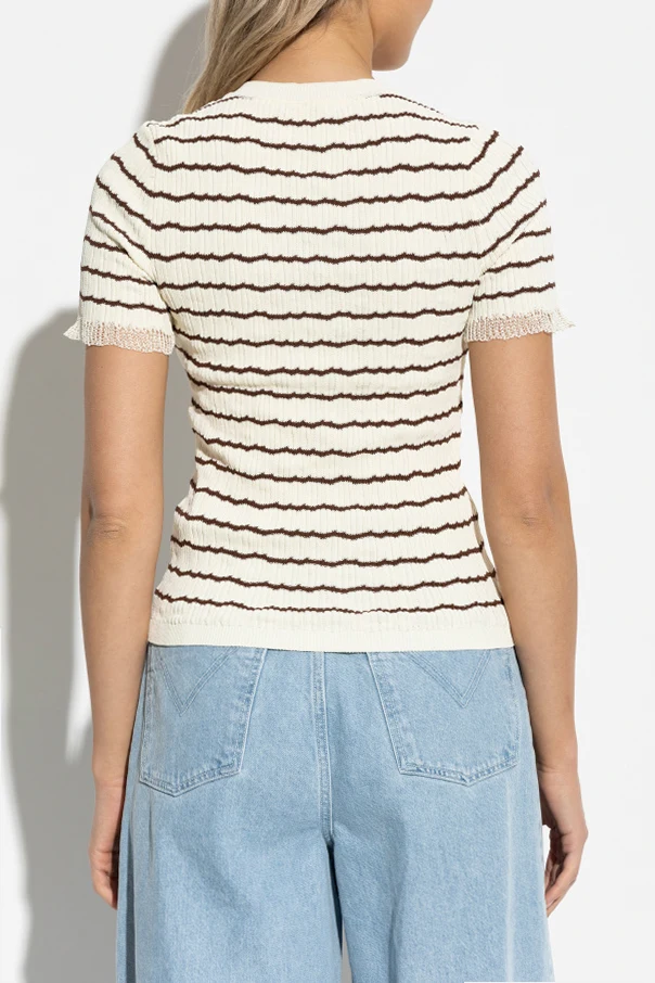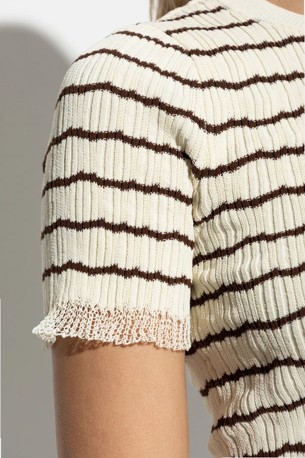 Top ze wzorem w prążki marki Rag & Bone to wyraz subtelnej elegancji i nowoczesnego minimalizmu. Propozycja ta zachwyca ponadczasową formą – klasyczny, lekko dopasowany krój z krótkim rękawem oraz szlachetnym, okrągłym dekoltem, stanowi kwintesencję wyrafinowanego casualu.