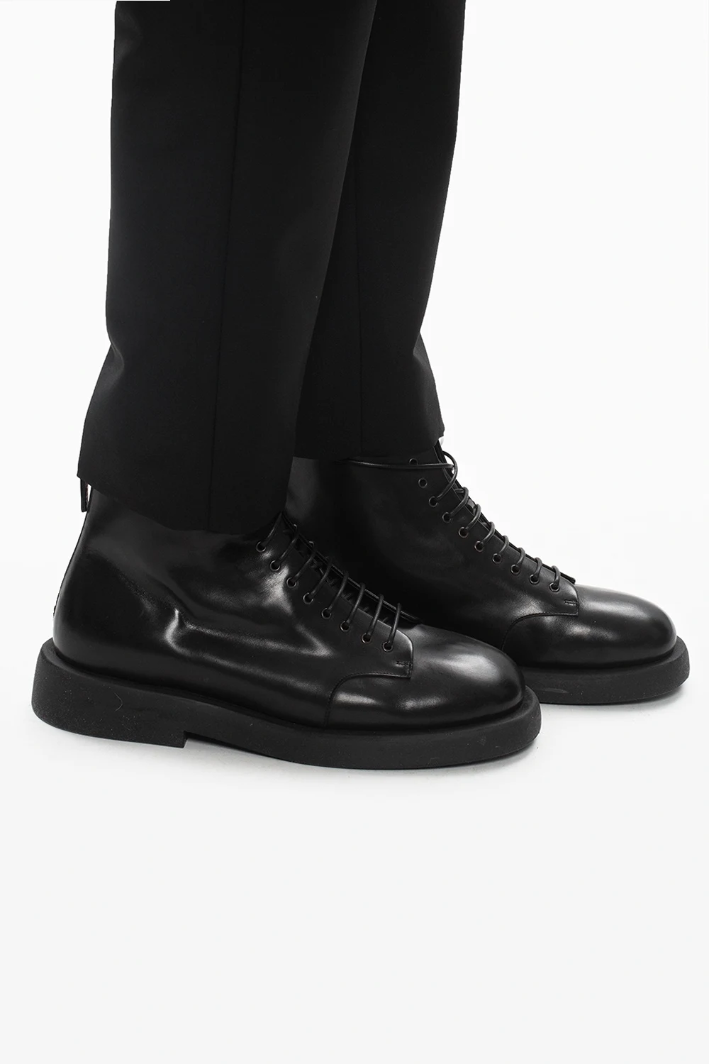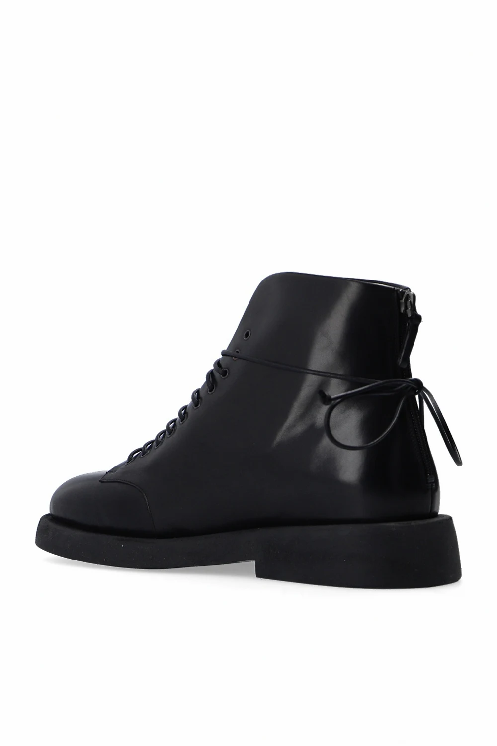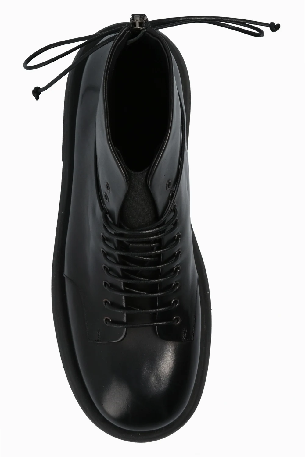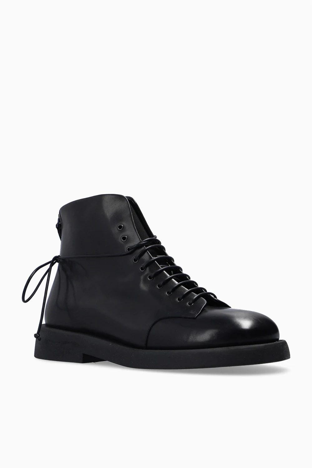 Czarne, sznurowane botki Marsell. Wykonane ze skóry. Z tyłu zapinane na zamek. Czarna, gumowa podeszwa.