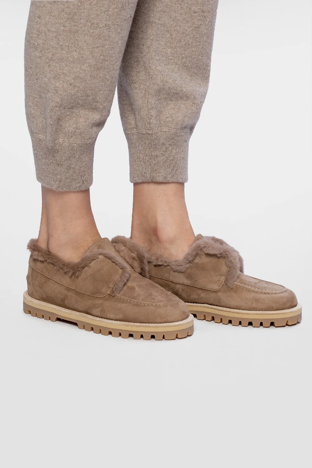 Jasnobrązowe, skórzane mokasyny, model ‘Yacht’ Le Silla. Wykończone futrem. Okrągły nosek. Beżowa, gumowa podeszwa.