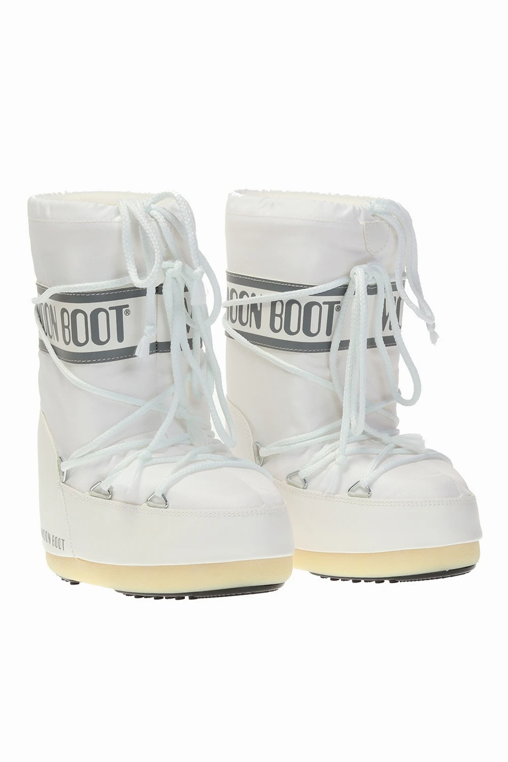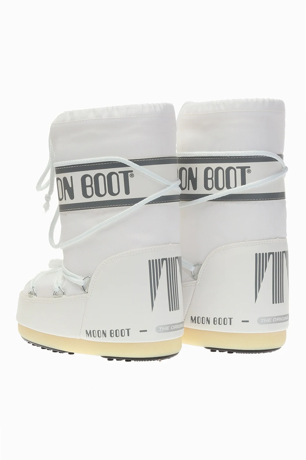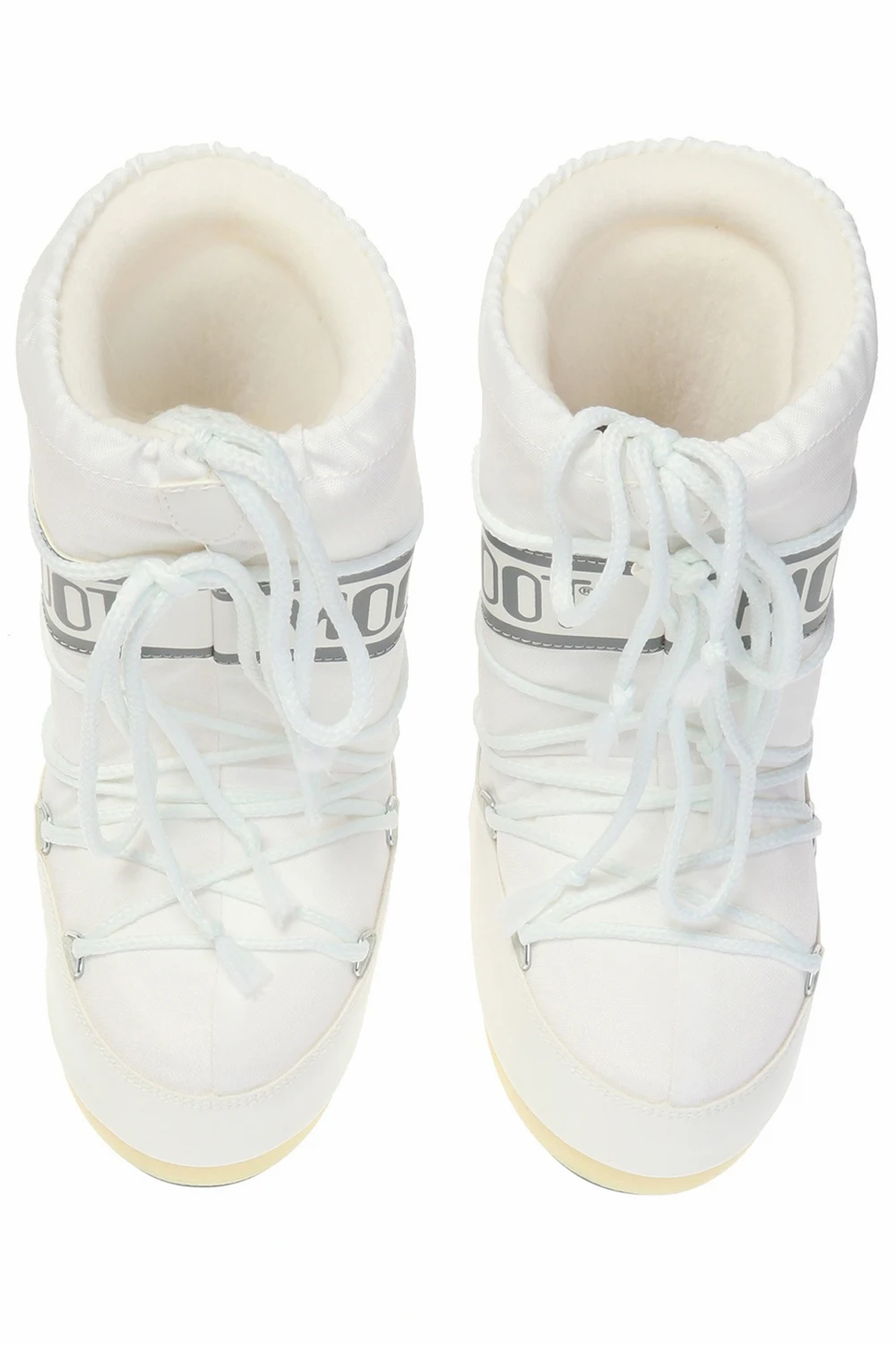 Białe, sznurowane śniegowce Moon Boot Kids. Ozdobione nadrukowanym wzorem z logo w kolorze srebrnym. Beżowo-czarna, gumowa podeszwa.