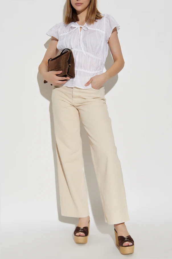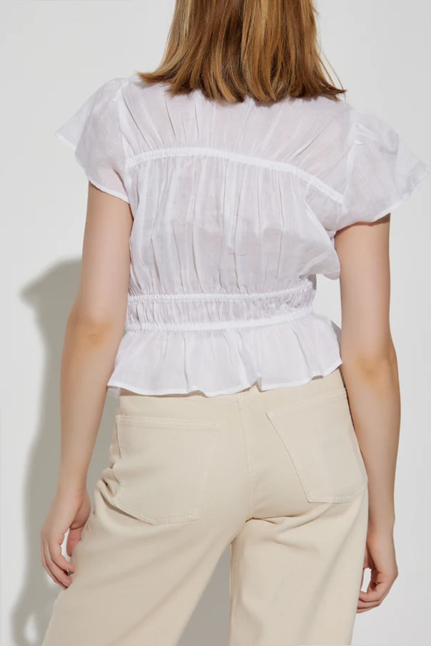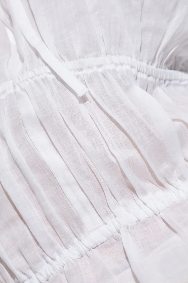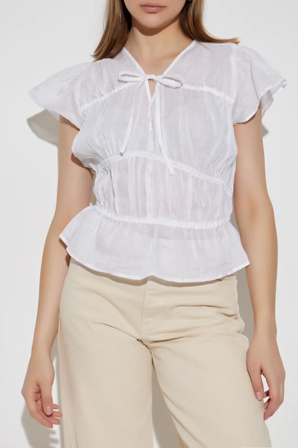 Top z dekoltem w serek autorstwa marki Rag & Bone to perfekcyjne połączenie lekkości, subtelności oraz wysublimowanego minimalizmu. Projekt utrzymany w nieskazitelnej bieli zachwyca wyjątkową formą – delikatnie rozszerzany dół współgra z krótkimi, motylkowymi rękawami, a elastyczne marszczenie w talii harmonijnie podkreśla kobiecą sylwetkę.